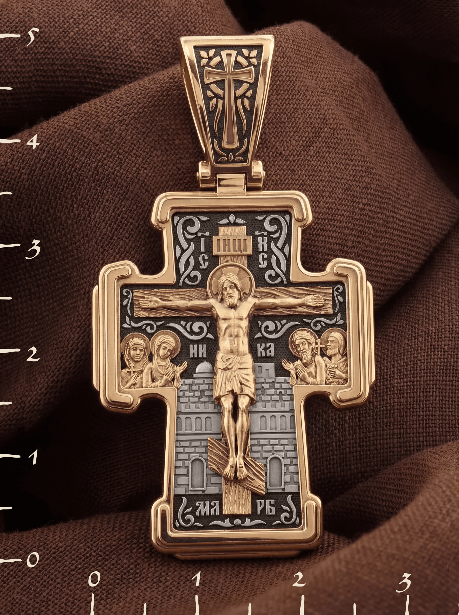 На лицевой стороне креста изображено Распятие Господа и Спасителя нашего Иисуса Христа. Крест- символ спасения и искупления рода человеческого, знамение победы над смертью и адом. Иисус Христос, как искупительная жертва освобождения человечества от власти греха, умер крестной смертью и в третий день воскрес. На верхней табличке, выше головы Иисуса, расположена надпись, составленная Понтием Пилатом — «IНЦI». Она означает «Иисус Назорей, Царь Иудейский». Рядом расположена надпись «IС» « ХС». Она означает Иисус Христос. Ниже — слово «НИКА», что означает «победитель». Слева от Распятия — Пресвятая Богородица и святая мироносица Мария Магдалина с крестом в руке. Справа — апостол и евангелист Иоанн Богослов, один из ближайших учеников Иисуса Христа, и сотник Лонгин с крестом в правой руке и копьем — в левой. За крестом высится Иерусалимская стена. Надпись «МЛРБ» — «место лобное рай бысть» означает, что место лобное стало раем, помещается в нижней части креста. На кулонном кольце помещен крест.