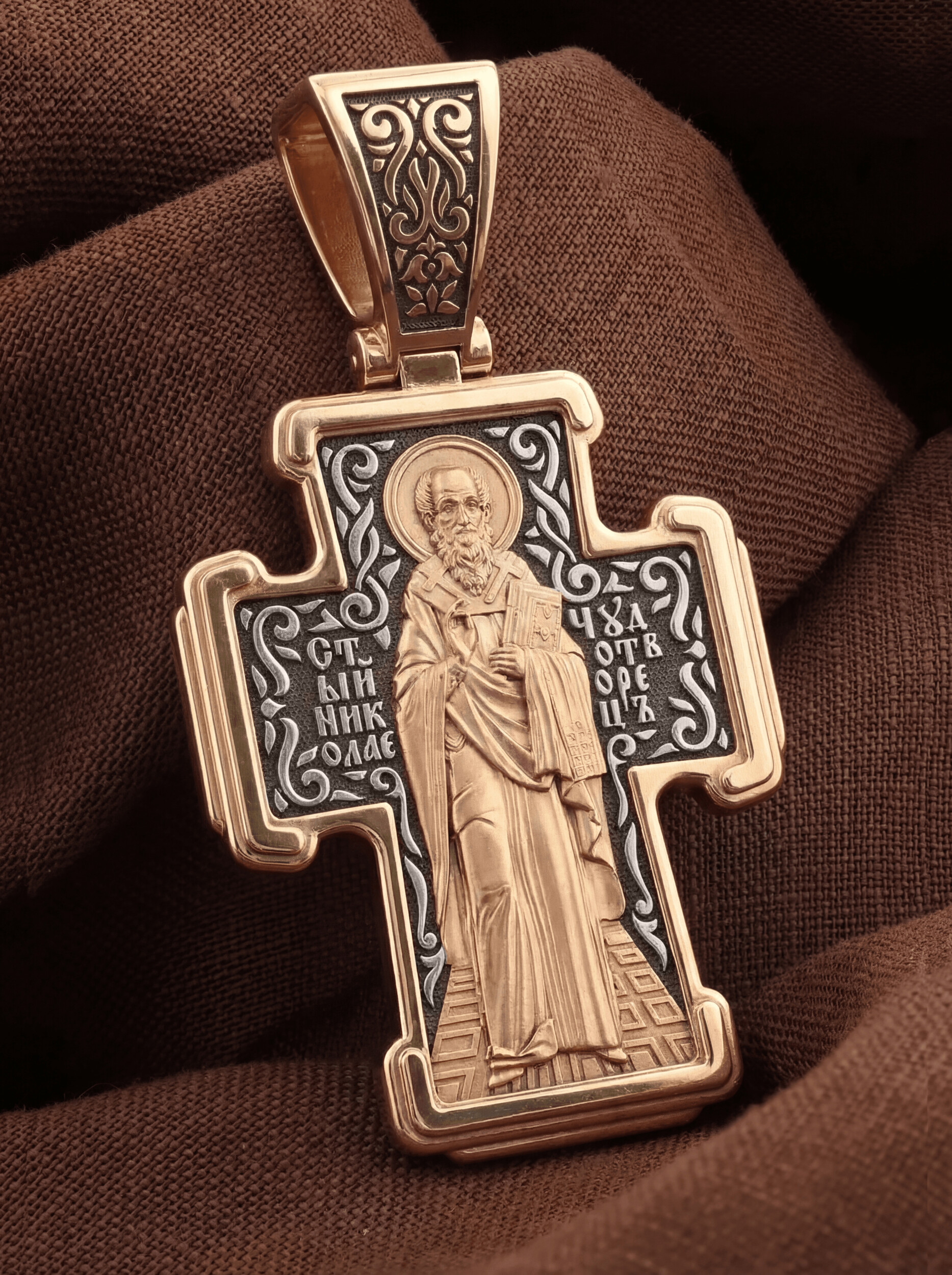На оборотной стороне креста изображен Святитель Николай архиепископ Мир Ликийских, Чудотворец. Он является одним из самых почитаемых святых в православном мире. Святитель Николай родился во второй половине III века в Малой Азии в Ликийском городе Патары. С рождения Божий Угодник проявлял необыкновенные дарования. Сохранилось Предание, что во время крещения он, никем не поддерживаемый, простоял в купели три часа. Вся жизнь святого Николая — это служение Богу. Много великих и преславных чудес сотворил на земле и на море великий Святитель Николай Угодник. Он помогал сущим в бедах, укрощал штормы, спасал от потопления и выносил на сушу из глубины морской, освобождал из плена и приносил освобожденных домой, избавлял от уз и темницы, защищал от посечения мечом, освобождал от смерти и подавал многим различные исцеления, слепым прозрение, хромым хождение, глухим слух, немым дар слова.