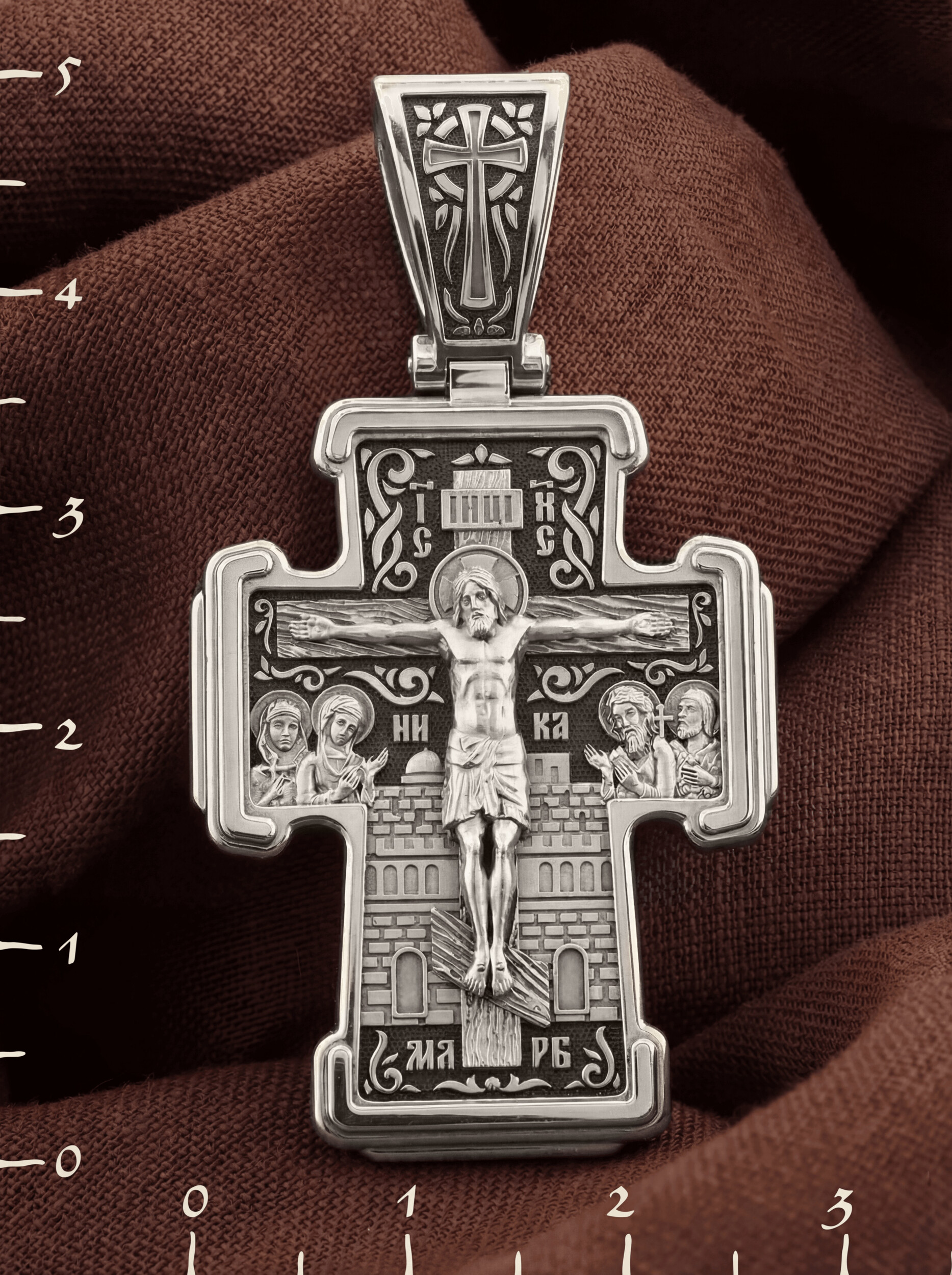 На лицевой стороне креста изображено Распятие Господа и Спасителя нашего Иисуса Христа. Крест- символ спасения и искупления рода человеческого, знамение победы над смертью и адом. Иисус Христос, как искупительная жертва освобождения человечества от власти греха, умер крестной смертью и в третий день воскрес. На верхней табличке, выше головы Иисуса, расположена надпись, составленная Понтием Пилатом — «IНЦI». Она означает «Иисус Назорей, Царь Иудейский». Рядом расположена надпись «IС» « ХС». Она означает Иисус Христос. Ниже — слово «НИКА», что означает «победитель». Слева от Распятия — Пресвятая Богородица и святая мироносица Мария Магдалина с крестом в руке. Справа — апостол и евангелист Иоанн Богослов, один из ближайших учеников Иисуса Христа, и сотник Лонгин с крестом в правой руке и копьем — в левой. За крестом высится Иерусалимская стена. Надпись «МЛРБ» — «место лобное рай бысть» означает, что место лобное стало раем, помещается в нижней части креста. На кулонном кольце помещен крест.