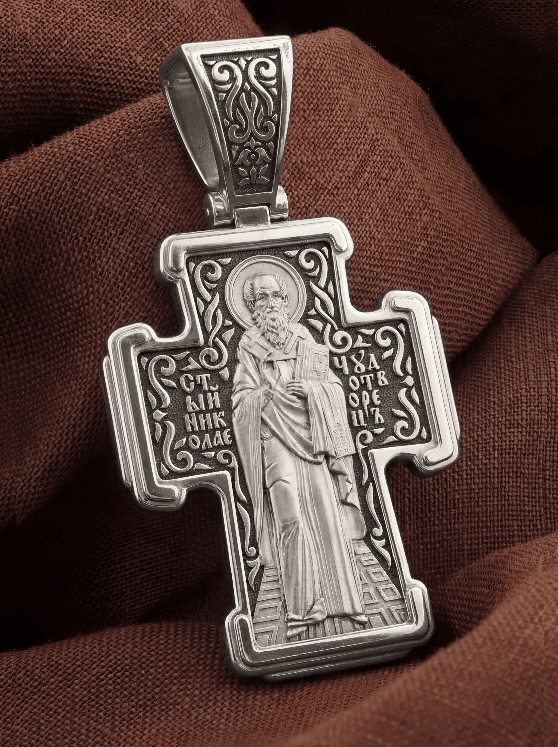 На оборотной стороне креста изображен Святитель Николай архиепископ Мир Ликийских, Чудотворец. Он является одним из самых почитаемых святых в православном мире. Святитель Николай родился во второй половине III века в Малой Азии в Ликийском городе Патары. С рождения Божий Угодник проявлял необыкновенные дарования. Сохранилось Предание, что во время крещения он, никем не поддерживаемый, простоял в купели три часа. Вся жизнь святого Николая — это служение Богу. Много великих и преславных чудес сотворил на земле и на море великий Святитель Николай Угодник. Он помогал сущим в бедах, укрощал штормы, спасал от потопления и выносил на сушу из глубины морской, освобождал из плена и приносил освобожденных домой, избавлял от уз и темницы, защищал от посечения мечом, освобождал от смерти и подавал многим различные исцеления, слепым прозрение, хромым хождение, глухим слух, немым дар слова.