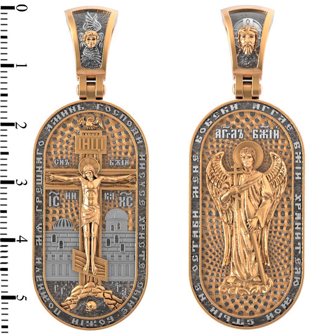 Центральную часть лицевой стороны занимает Распятие Христа — образ жертвы, принесенной Господом за грехи людей. Именно ко Христу, сошедшему на землю ради нашего спасения, возносятся все молитвы. Рядом с Его образом помещены слова — «НИКА» (греч. — Победитель) и «СЫН БОЖИЙ». Эти слова характеризуют Господа как Великого Архиерея, победителя смерти. Также Распятие сопровождается надписями, олицетворяющими Христа — это святое имя Христа «IC» (Иисус) «ХС» (Христос). Верхняя перекладина символизирует собой табличку с надписью «IHЦI» — Иисус Назарянин Царь Иудейский. Возвышение, на котором стоит Крест, символизирует гору Голгофу, на которой произошло Распятие. У подножия Креста изображают прах Адама, обозначенный черепом. На кулонном кольце изображен шестикрылый Серафим — самый приближенный к Господу Ангел. По контуру образка написана молитва: «Господи Иисусе Христе, Сыне Божий, помилуй мя грешного. Аминь»