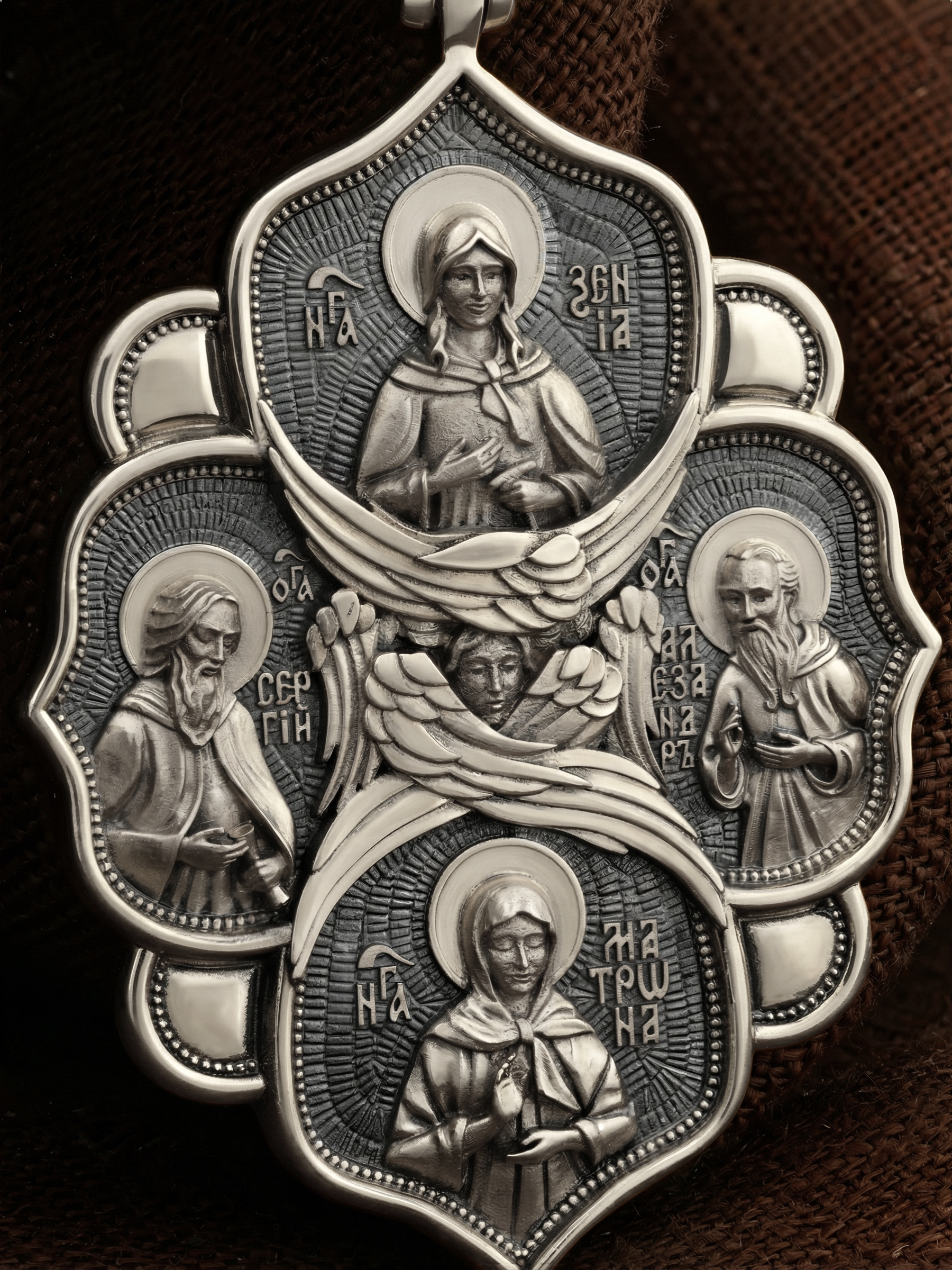 Справа от Серафима изображен преподобный. Александр Свирский. Преподобный Александр Свирский — великий русский святой. Прославился многими чудесами, и один из немногих святых сподобился явления Святой Троицы. Вверху образка изображена блаженная Ксения Петербургская Она прославилась своим подвигом юродства ради Христа. Святая почитается как скорая помощница в устроении семейного счастья, помогает при болезнях детей и близких.