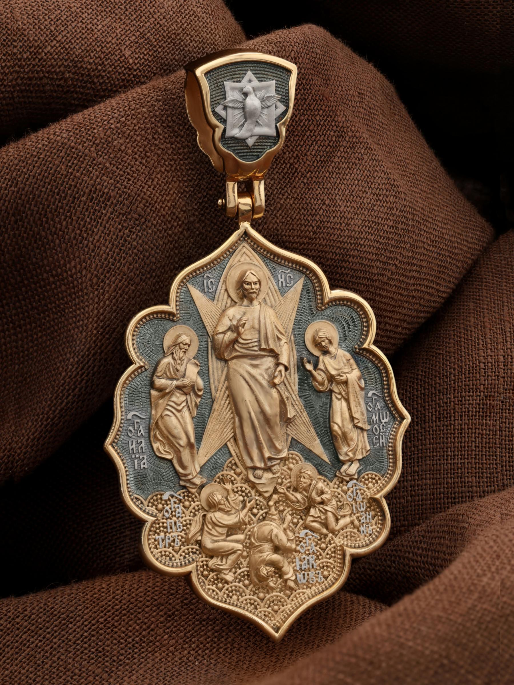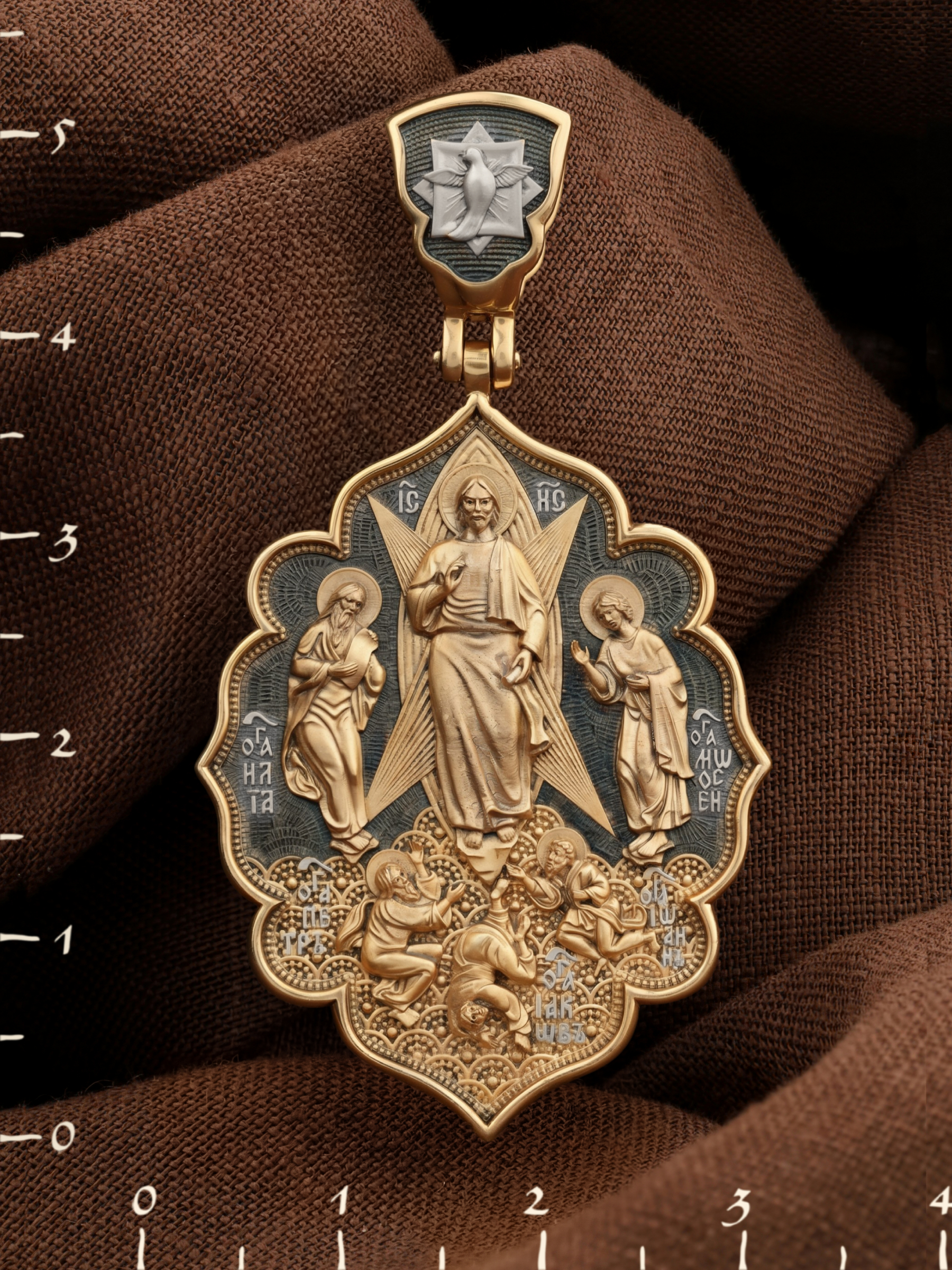 На лицевой стороне образка изображена икона «Преображения Господня». Преображение — одно из немногих Евангельских событий, которое по канону можно изображать не только там, где оно реально происходило. Преображение Господне на иконах можно увидеть на фоне посвященных ему монастырей и храмов. Это объясняется тем, что каждый христианский храм является духовным Фавором, где в церковных таинствах и молитве душа верующих приближается к своему преображению. Образ являет Господа Иисуса Христа в тот момент, когда Он предстал трем Своим ученикам: Петру, Иакову и Иоанну Богослову. Пророки Моисей и Илия предстояли рядом и беседовали с Ним. Апостолы едва могли вынести бесконечную радость, которая охватила их в присутствии Бога. Когда же на гору спустилось облако и раздался глас Божий: «Сей есть Сын Мой Возлюбленный; Его слушайте», апостолы в сильном страхе пали на землю (Лк. 9:35). На иконах «Преображение Господне» они так и изображаются — лежащими у ног Христа. Во главе образка изображен парящий голубь — символ Святого Духа и Его благодати.