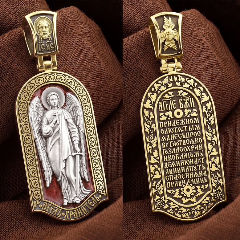 Основой композиции лицевой стороны является Ангела Хранителя. Образок Ангел Хранитель — это не просто украшение, а настоящая миниатюрная икона. В руках Ангел держит традиционные символические атрибуты Ангелов Хранителей: крест — знак послушания Христу и следования Его заповедям, меч — символ непримиримой борьбы, которую он ведет с бесами, отражая их нападения на людей. Слово «ангел» означает «вестник». Ангелы — верные служители Божьи, которых Господь посылает возвещать Свои повеления. Ангелы тварны, как и люди, но имеют другую природу. На иконах они изображаются в человеческом обличье с большими крыльями. Могучие крылья ангелов символизируют быстроту, с которой они исполняют повеления Бога, а небольшие ленточки у ушей –тороки, или слухи — показывают, что они всегда слышат Его голос.