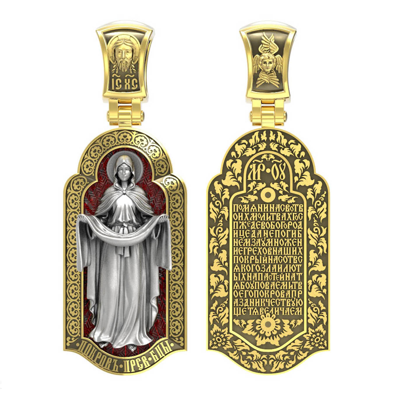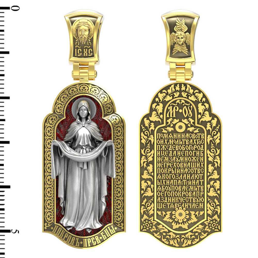 На лицевой части образка изображена икона Покров Пресвятой Богородицы. Праздник Покрова Божией Матери является воспоминанием чуда, которое произошло во Влахнернской церкви 1 (14) октября 910 года: Пресвятая Богородица явилась верующим над алтарем храма и распростерла над ними Свое покрывало. В этот день Божья Матерь открыла людям, что Она является Ходатаицей за них перед Богом. Богородица простирает Свой молитвенный покров над всеми православными христианами и умоляет Сына Своего о даровании вечного спасения каждому человеку.