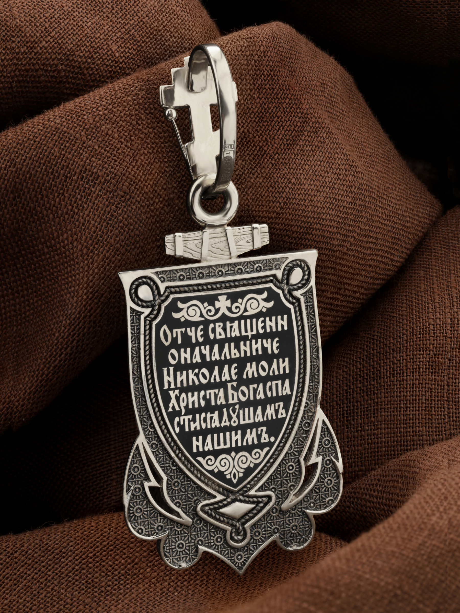 Лицевую сторону возглавляет икона Святителя Николая Чудотворца. Живший в III веке епископ Ликийского города Миры — самый почитаемый святой не только в России, но и во всем мире. Николай Чудотворец, помощник в делах, покровитель учащихся, утешитель обиженных и нуждающихся, целитель самых страшных и тяжелых недугов, предстатель и молитвенник за людей перед Богом. Также Святитель Николай Чудотворец известен своими молитвами за путешественников, когда непрестанный ветер и бушующие волны утихают и корабль заходит в спокойную гавань.