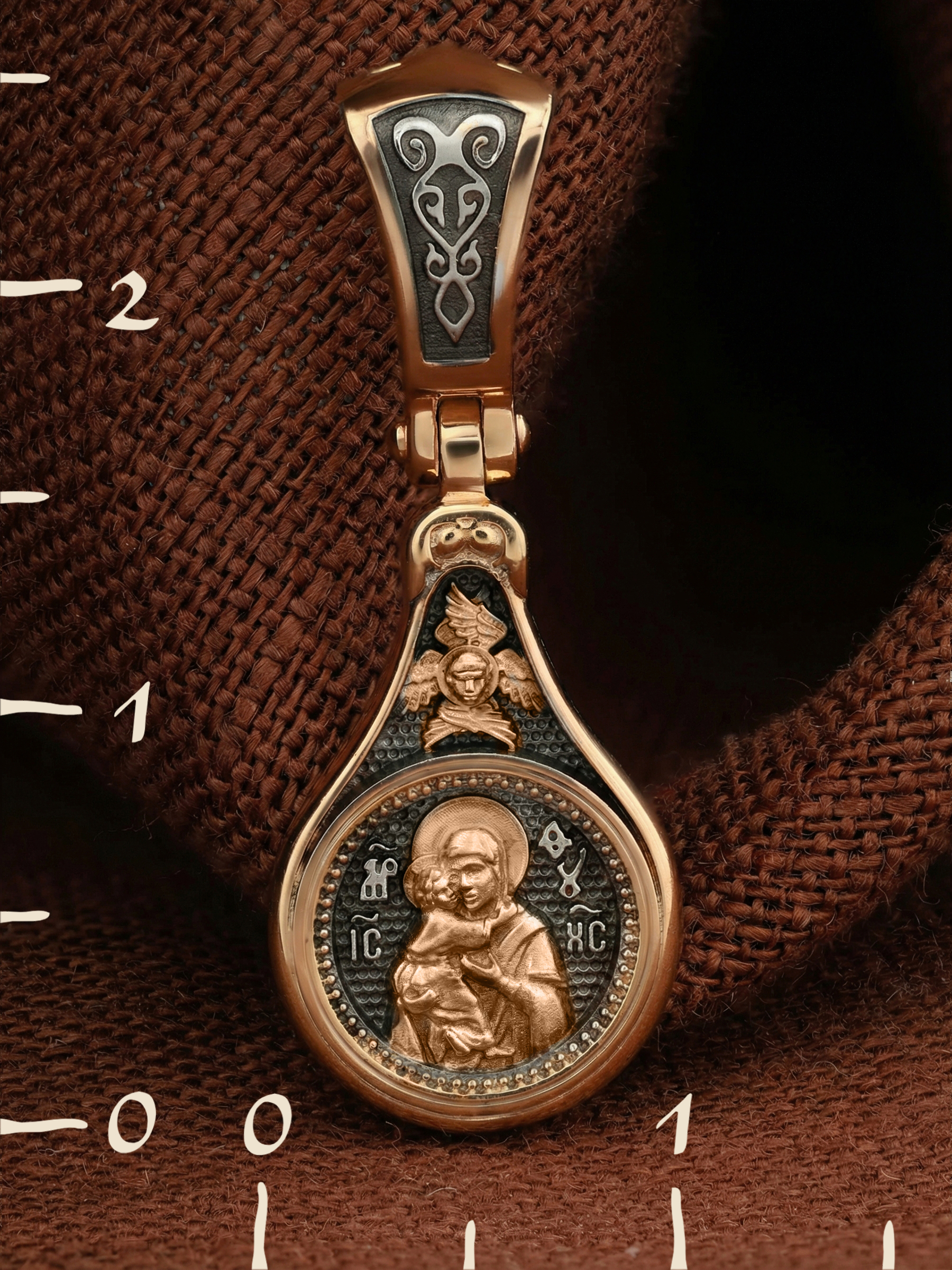 Лицевую сторону образка и кулонное кольцо украшает шестикрылый Серафим — самый приближенный к Господу Ангел.