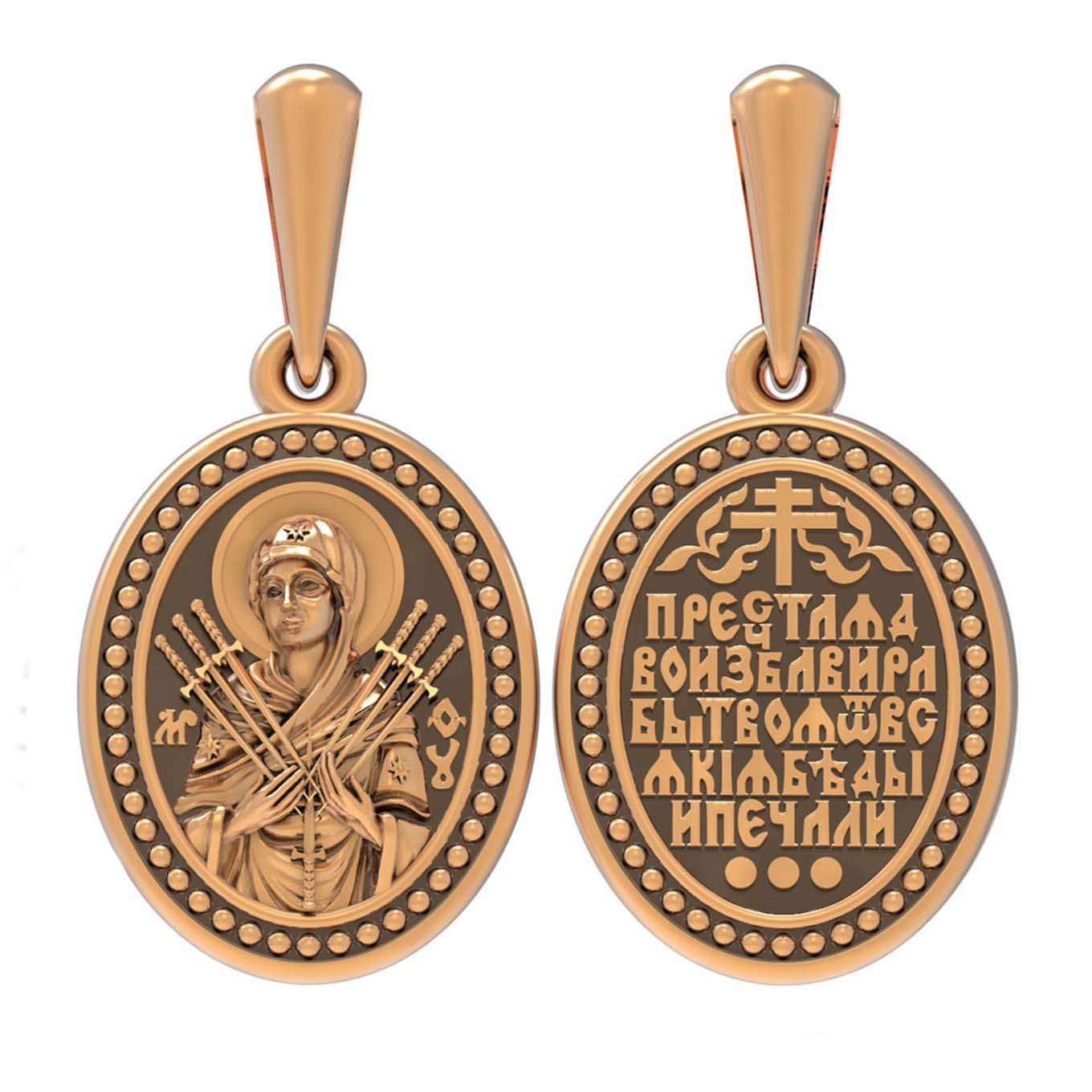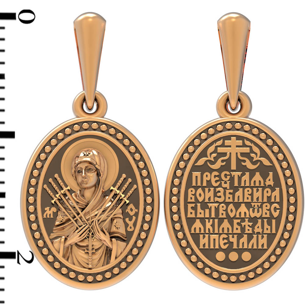 На лицевой стороне образка изображена икона Пресвятой Богородицы «Семистрельная» — одна из самых чудотворных икон на Руси. На протяжении многих веков христиане взывали к Царице Небесной через эту икону, если в стране начинались войны или мятежи.