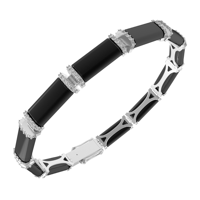 Особое очарование украшению придает инкрустация бриллиантами. Всего в модели использовано 1185 вставок круглой формы, которые создают ослепительную игру света и подчеркивают холодный блеск белого золота. Гармоничное сочетание черных ониксов и белых бриллиантов превращает этот браслет в универсальный аксессуар, который подойдет как женщинам, так и мужчинам. Изделие смотрится массивно и солидно, притягивая взгляды своей архитектурной выверенностью.
