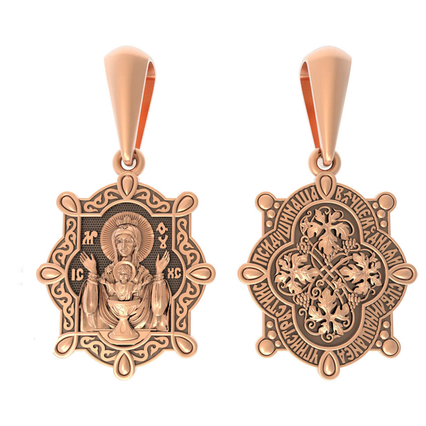 На оборотной стороне изображена виноградная лоза — символы церкви и евхаристии. «Я есмь лоза, — говорил Иисус Христос Своим ученикам, — а вы ветви; кто пребывает во Мне, и Я в нем, тот приносит много плода» (Ин. 15, 5), «Я есмь истинная виноградная лоза, а Отец Мой — виноградарь». Вокруг образка написано: «Владычице Премилостивая, исцели наша недуги и страсти, и спаси души наши».