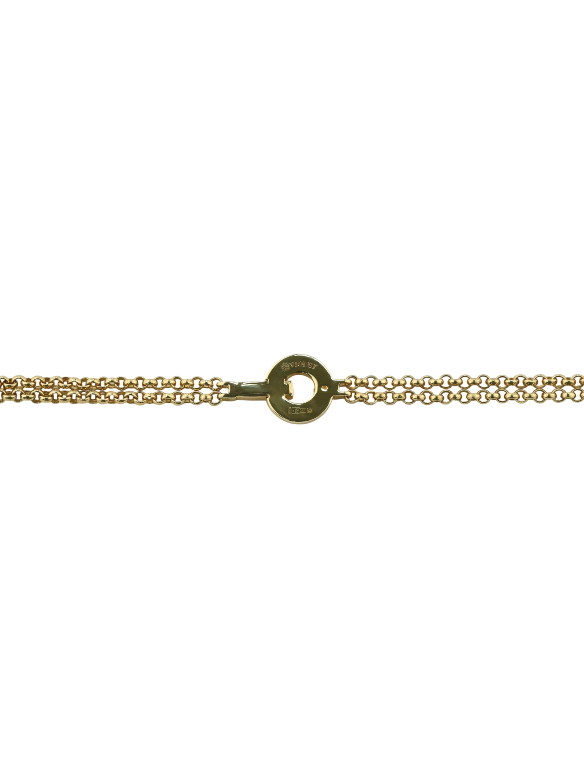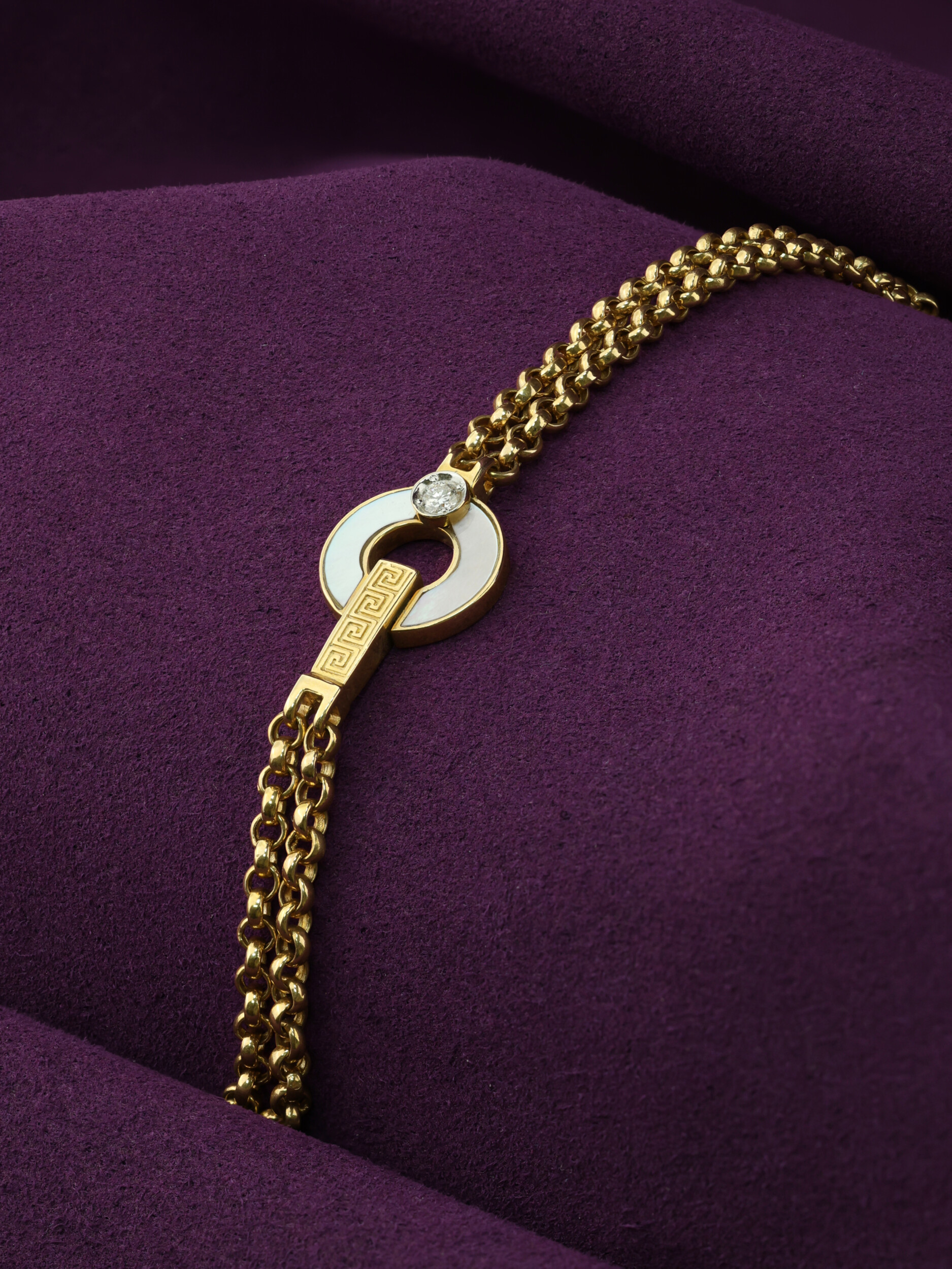 Элегантный и лаконичный браслет из коллекции De Luxe — Афина станет воплощением вашего безупречного стиля. Это роскошное украшение выполнено из благородного лимонного золота 585 пробы, чей теплый солнечный оттенок великолепно подчеркивает сияние вставок. Дизайн изделия объединяет в себе классику и современные тренды: центральная композиция включает эффектный перламутр в форме полукольца и один яркий бриллиант круглой огранки. Особую изысканность придает детально проработанный греческий ключ, который гармонично сочетается с элементом в виде полумесяца.
