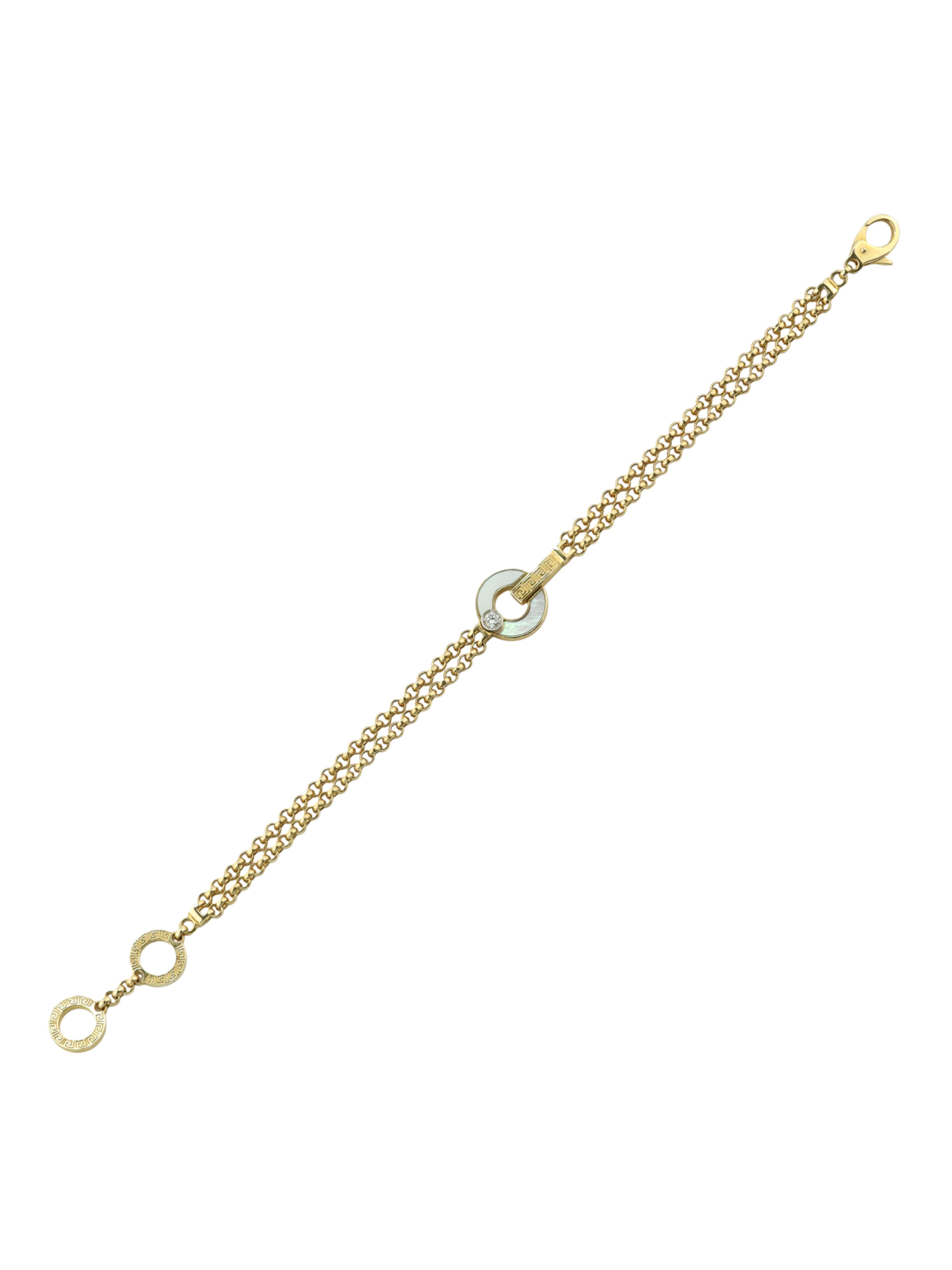 Универсальный дизайн этого браслета позволяет носить его как женщинам, так и мужчинам, создавая утонченный и запоминающийся образ. Белый цвет бриллианта и нежное перламутровое сияние создают контрастное сочетание с лимонным цветом золота, привлекая внимание к каждому движению вашей руки. Данное изделие прекрасно смотрится как самостоятельный аксессуар, так и в сочетании с другими ювелирными украшениями, позволяя вам создавать гармоничные комплекты. Это ювелирное украшение станет достойным подарком для ценителей высокого искусства и качества.