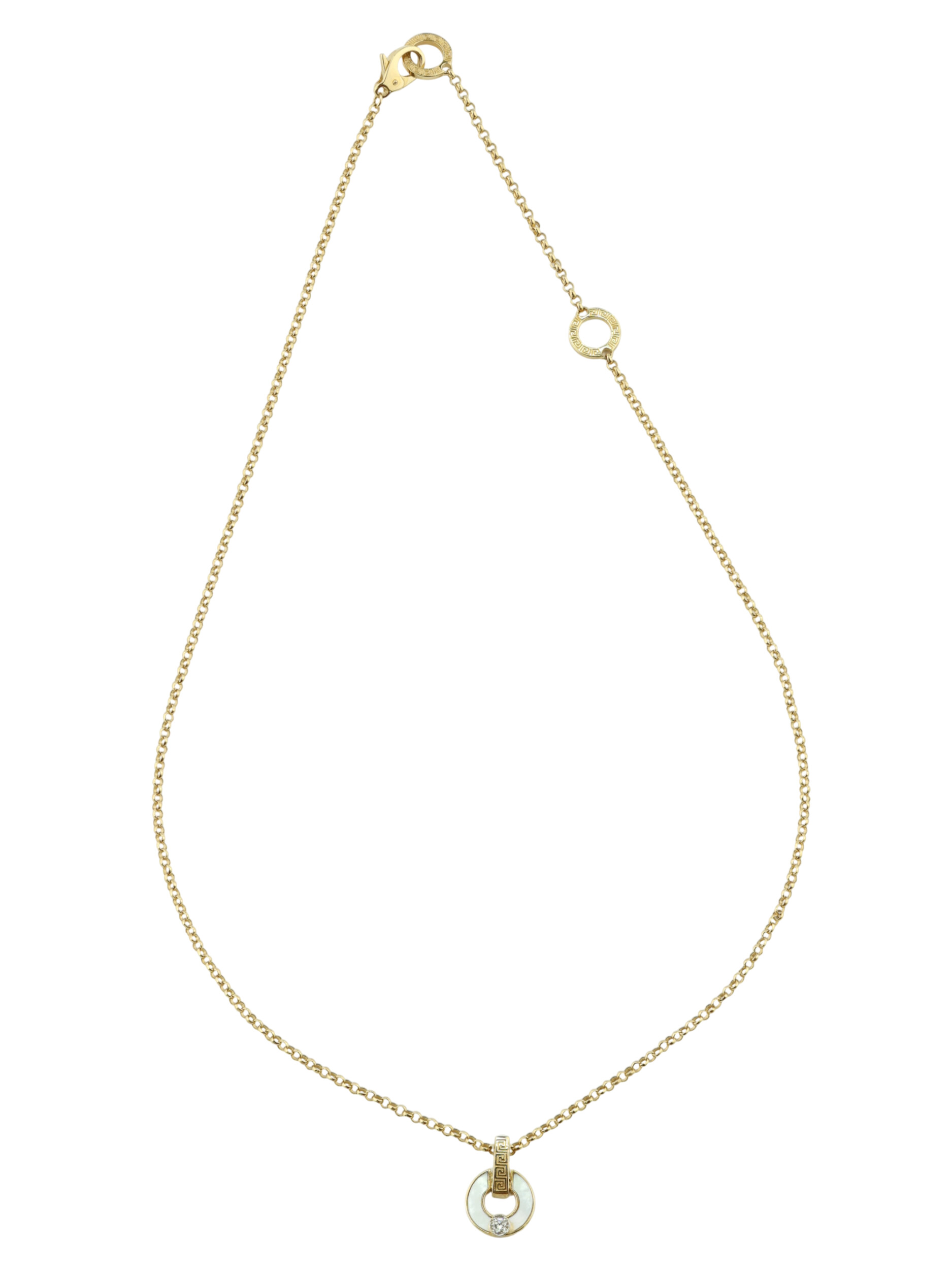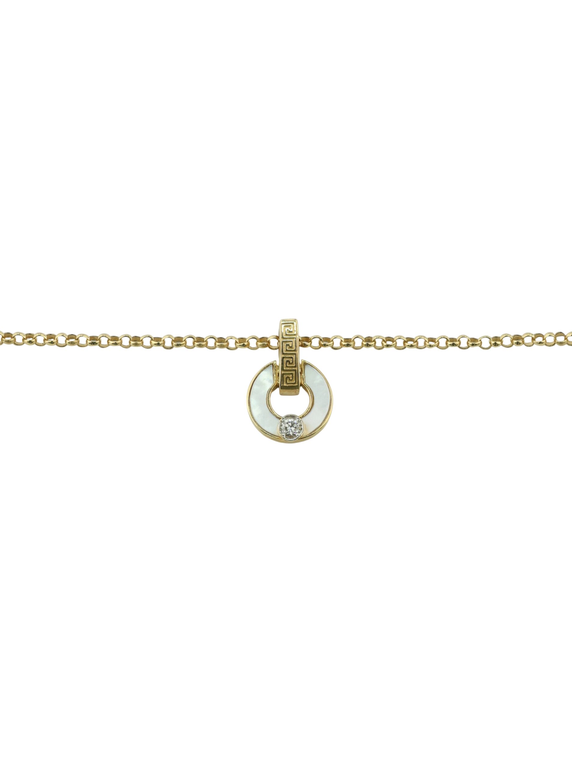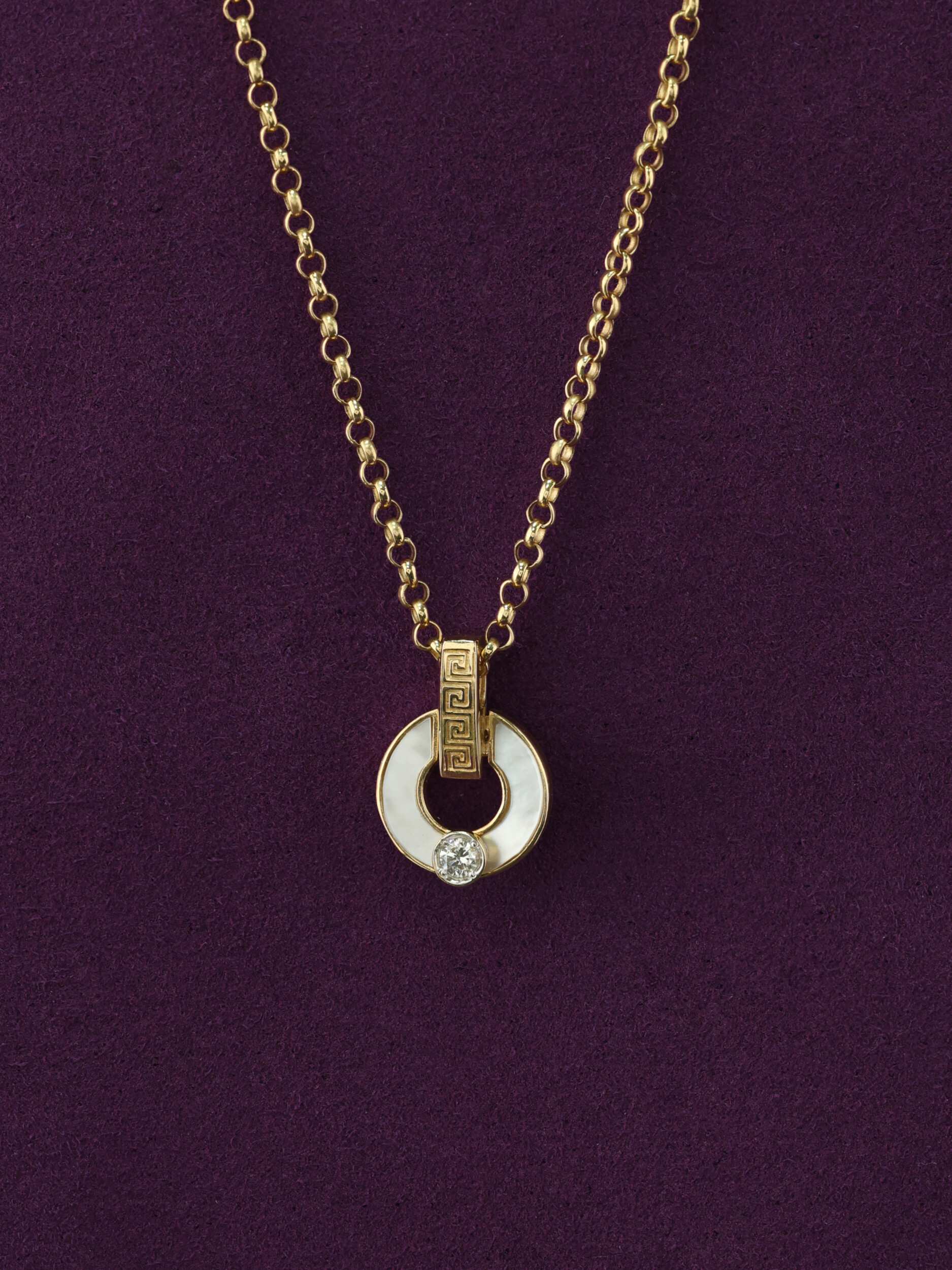 Центральный элемент композиции выполнен в форме полумесяца — круга, инкрустированного нежным перламутром белого цвета. В нижней части подвески расположен сияющий бриллиант круглой формы, создающий великолепный контраст с мягким перламутровым блеском. Использование лимонного золота подчеркивает уникальность изделия и придает ему особый статус.