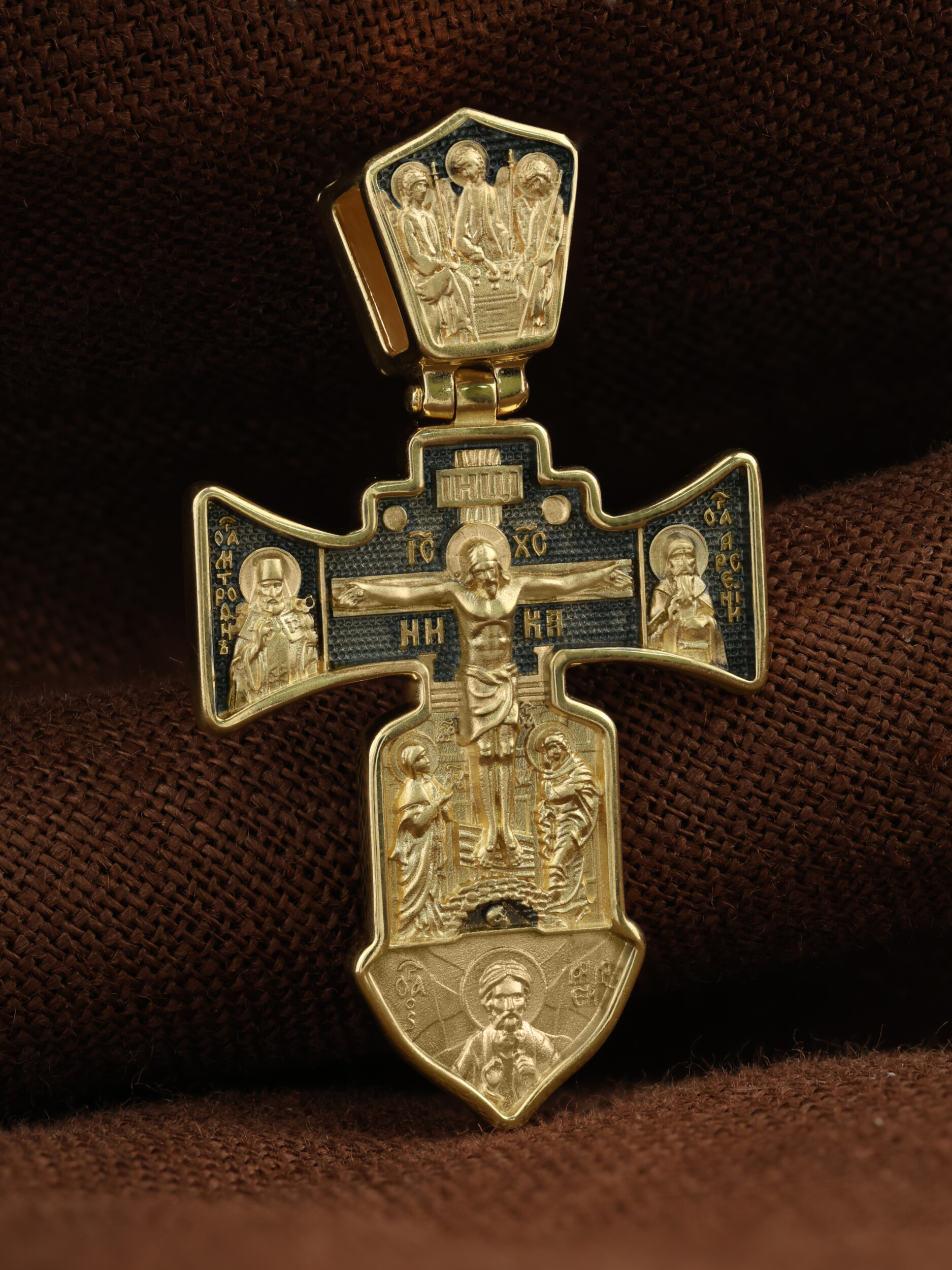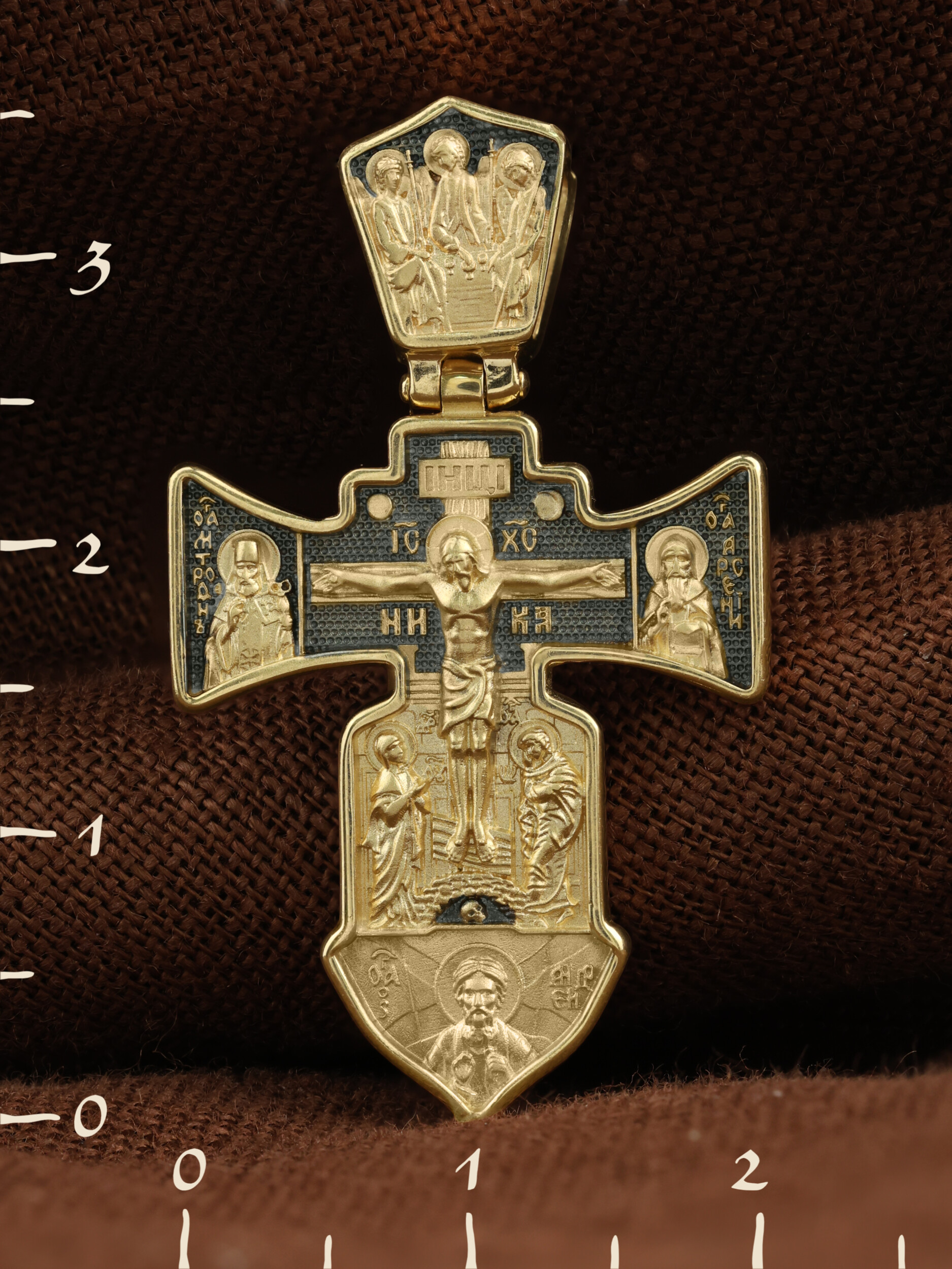 На лицевой стороне креста изображено Распятие Господа Иисуса Христа.
