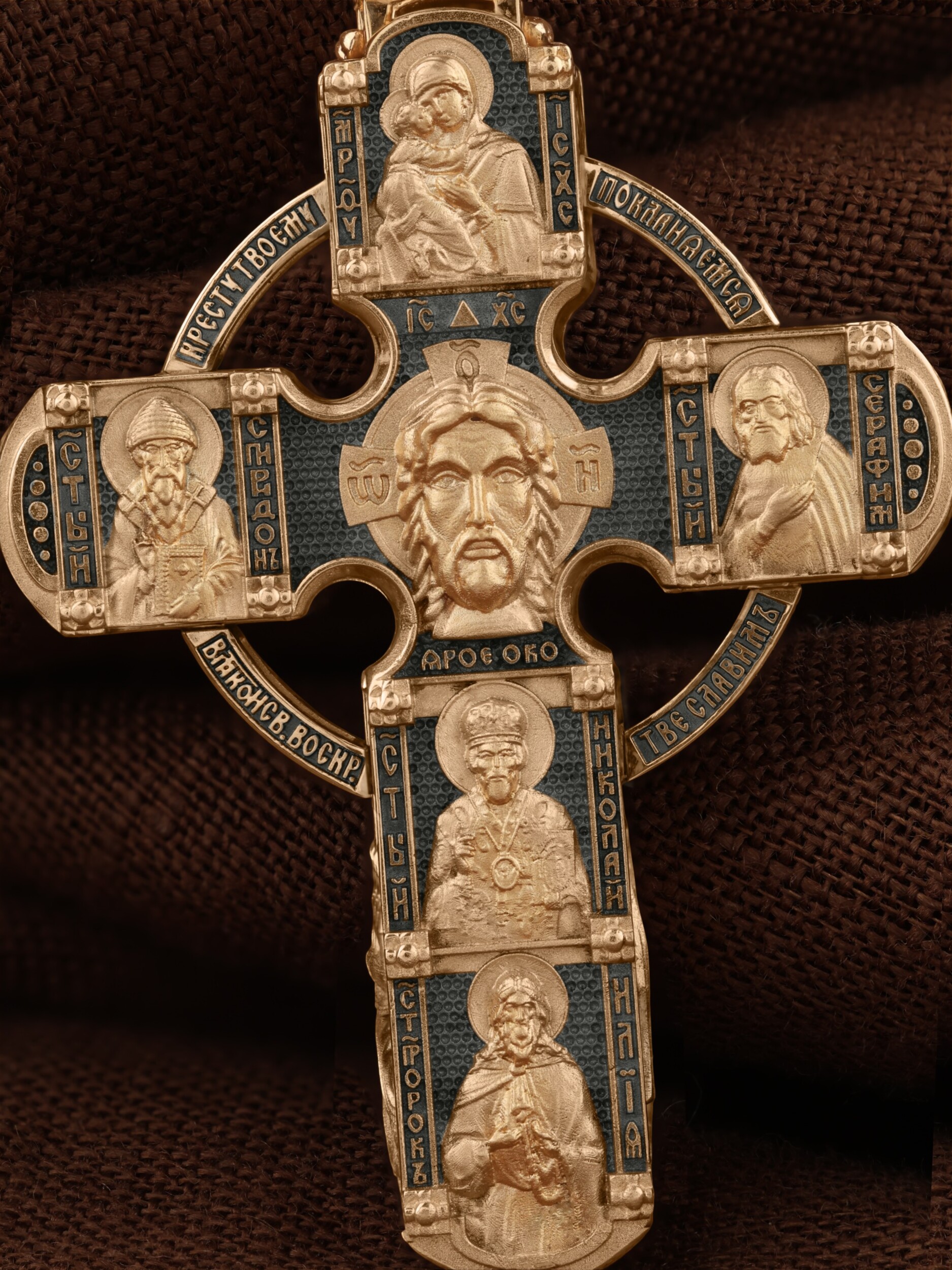 В центре оборотной стороны креста размещен образ Господа и Спасителя нашего Иисуса Христа — Господь Вседержитель или Пантократор (от греч. всевластный, всесильный). Именование Иисуса «Вседержителем» указывает, с одной стороны, на Его Божественную природу: «Аз есмь Альфа и Омега, начало и конец, говорит Господь, Который есть и был и грядет, Вседержитель» (Откр. 1: 8). С другой стороны, такое именование связано и с человеческой природой Христа, искупившего крестной жертвой людские грехи и обновившего тем самым человеческую природу. Над образом изображена икона Божией Матери «Владимирская», ниже — образы святителя Николая Чудотвореца, архиепископа Мир Ликийских и пророка Ильи. Слева изображен святитель Спиридон Тримифунтский, справа — преподобный Серафим Саровский. На кулонном кольце размещен образ шестикрылого Серафима.