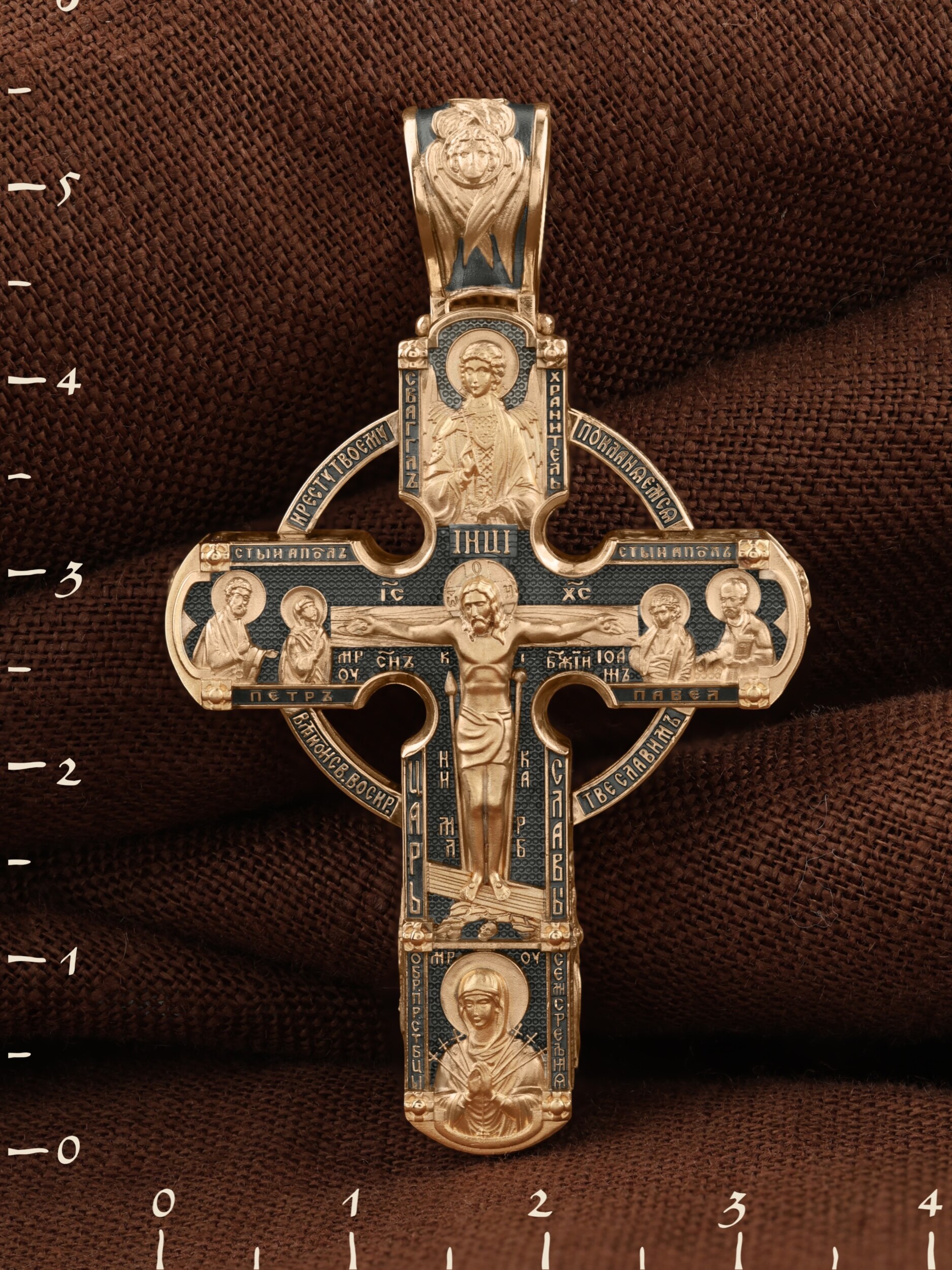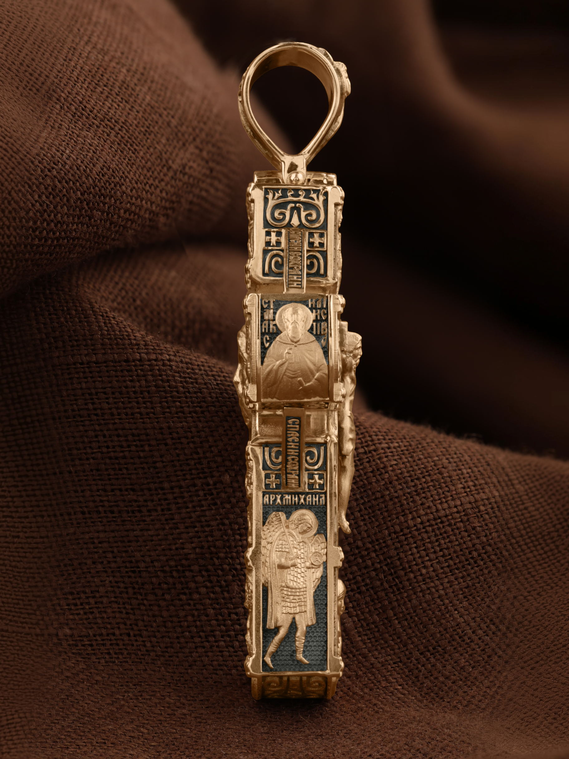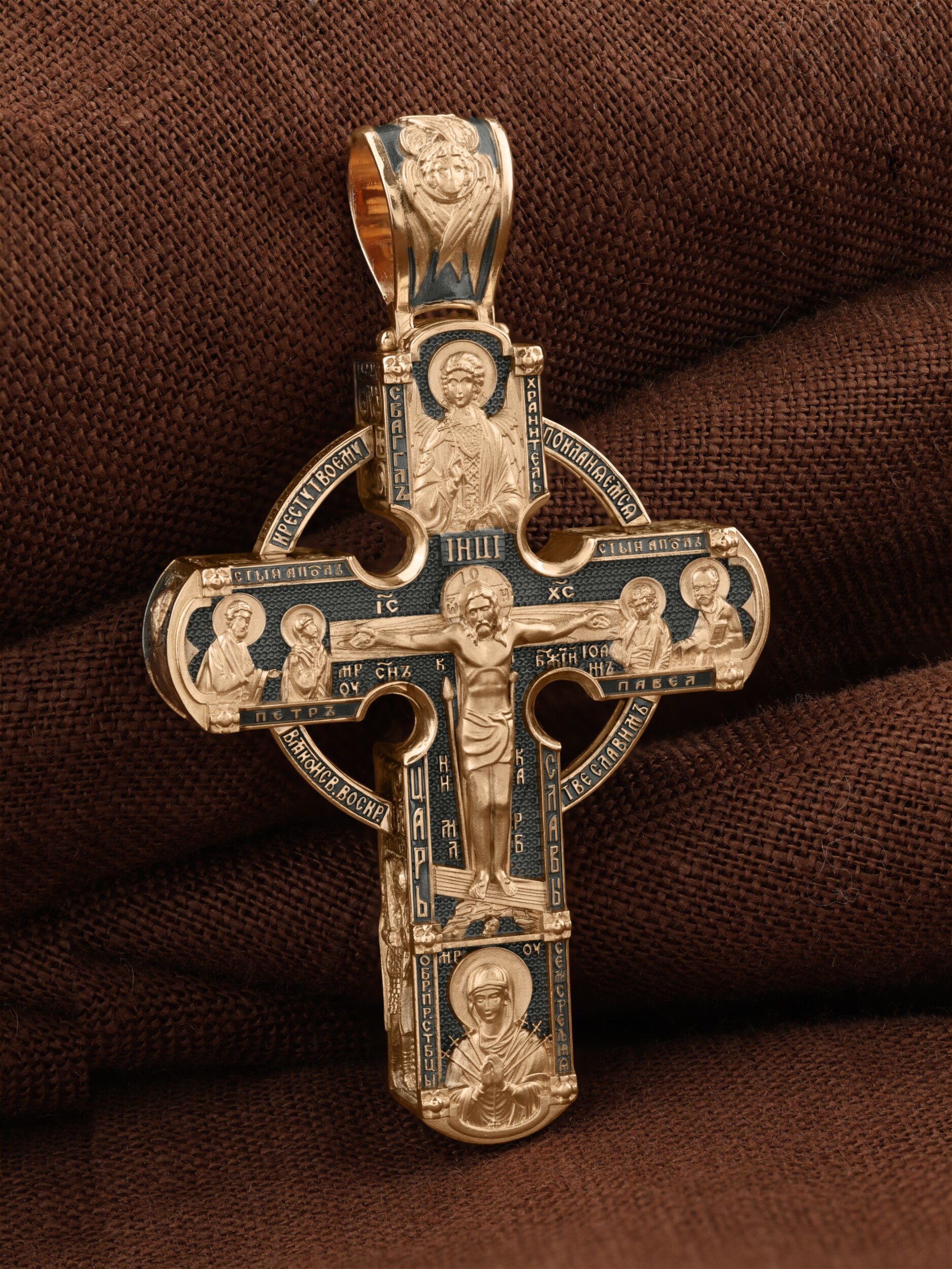 Крест объединяет в одной фигуре два христианских символа — круг-нимб и крест. На лицевой стороне креста изображено Распятие Господа и Спасителя нашего Иисуса Христа. Крест — символ спасения и искупления рода человеческого, знамение победы над смертью и адом. Распятие сопровождается каноническими надписями. На верхней табличке, выше головы Иисуса, расположена надпись, составленная Понтием Пилатом — «IНЦI». Она означает «Иисус Назорей, Царь Иудейский». Надписи «IC» «ХC», что означает Иисус Христос и «Сын Божий» размещается на разных сторонах поперечной перекладины креста. Вдоль Распятия размещены надписи «Царь Славы», «НИКА» (греч. — Победитель) и «МЛРБ» — «место лобное рай бысть» означает место лобное стало раем». Крест стоит на горе камней, символизирующих Голгофу. В ее основании различается череп — это голова Адама. Вдоль креста изображены орудия Страстей Христовых: копие сотника Лонгина, которым пронзили подреберье мёртвого Иисуса, чтобы убедиться в Его смерти, и трость с губкой, с которой Иисуса напоили уксусом. Они обозначены буквами «К» и «Т». Слева от Распятия помещены лики Пречистой Богородицы и Апостола Петра, справа изображены Апостол и евангелист Иоанн Богослов и Апостол Павел. Над Распятием изображен Святой Ангел-Хранитель, ниже — икона Божией Матери «Семистрельная». По кругу размещена молитва: «Кресту Твоему поклоняемся, Владыко, и Святое Воскресение Твое славим». На кулонном кольце помещено изображение Креста «Голгофа», на котором был распят Господь и Спаситель наш Иисус Христос.