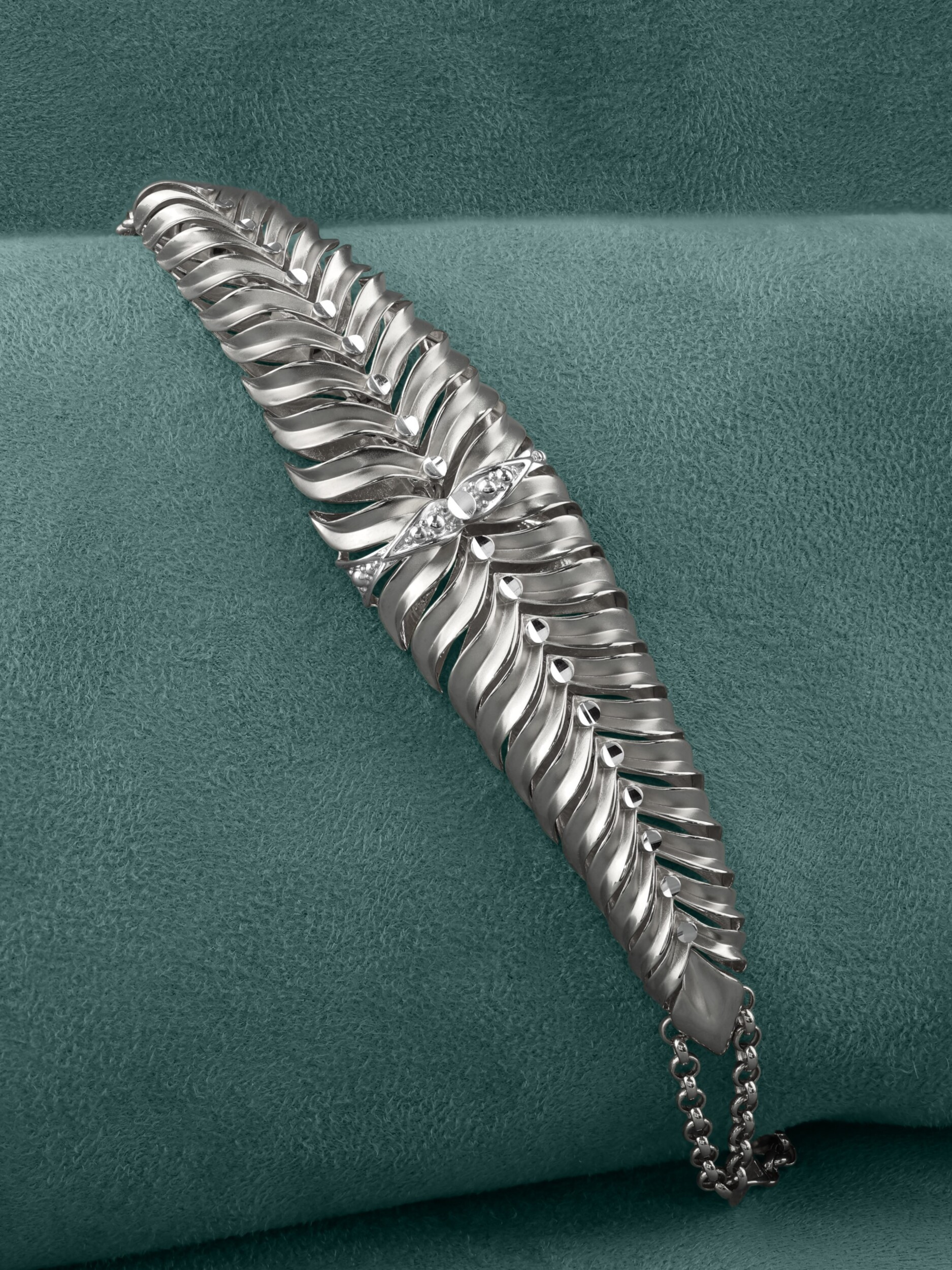 Элегантный браслет из белого золота 585 пробы из коллекции Vioretty — Palm Branch станет безупречным акцентом вашего образа. Дизайн изделия вдохновлен природными мотивами и выполнен в виде изящной пальмовой ветви. Ювелиры воплотили в металле природную грацию, где каждая деталь подчеркивает благородное сияние белого золота. Плавные линии и филигранная проработка формы листьев создают ощущение легкости и гармонии.