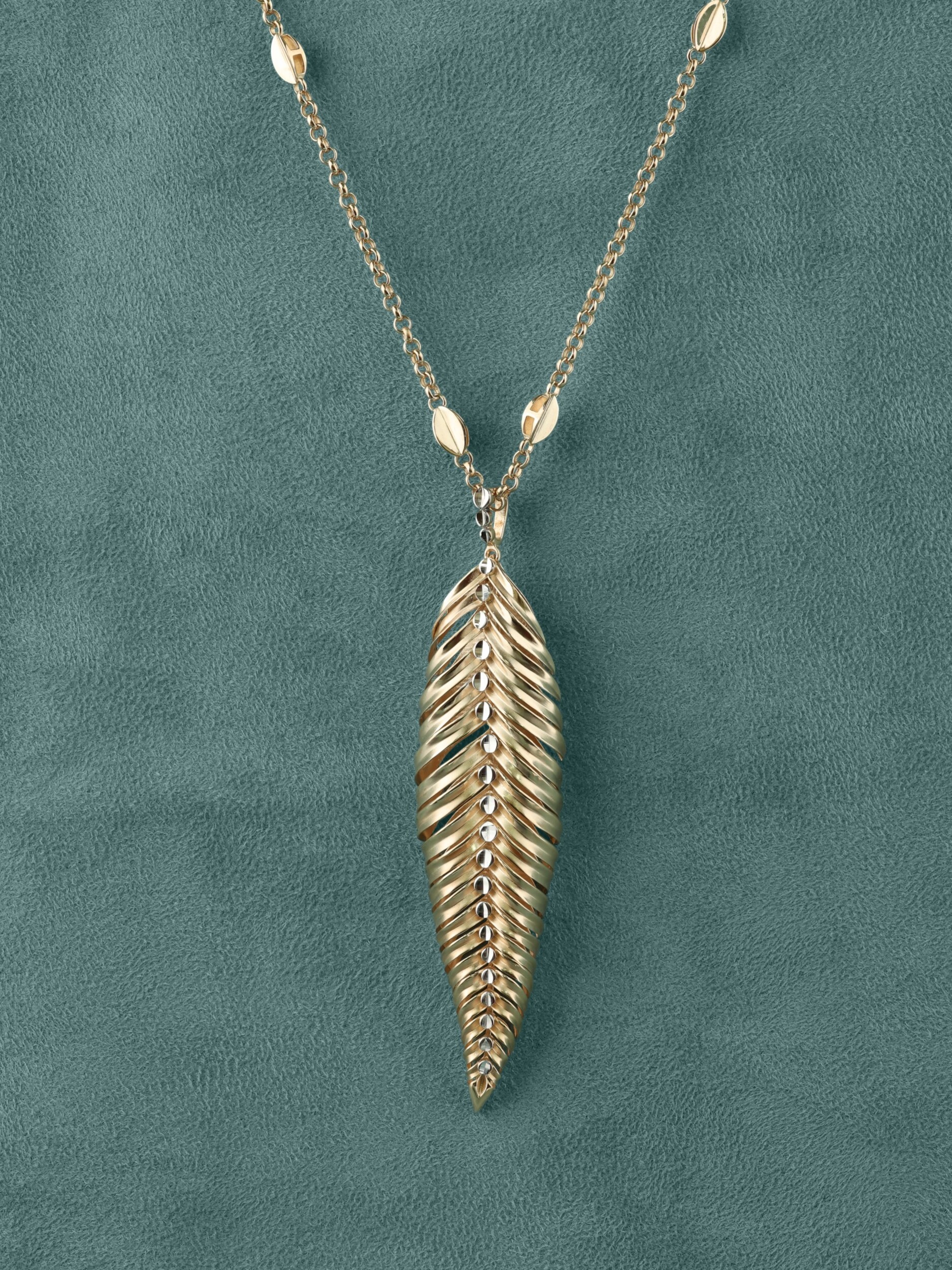 Утонченная цепочка дополнена декоративными элементами, которые придают украшению дополнительный шарм. Это колье — часть продуманных комплектов, поэтому вы легко сможете подобрать к нему другие изделия для создания завершенного ювелирного гарнитура. Красное золото 585 пробы эффектно играет на свету, привлекая внимание к каждой детали дизайна в виде листьев. Выбирая данное украшение, вы делаете ставку на элегантность, которая никогда не выйдет из моды.