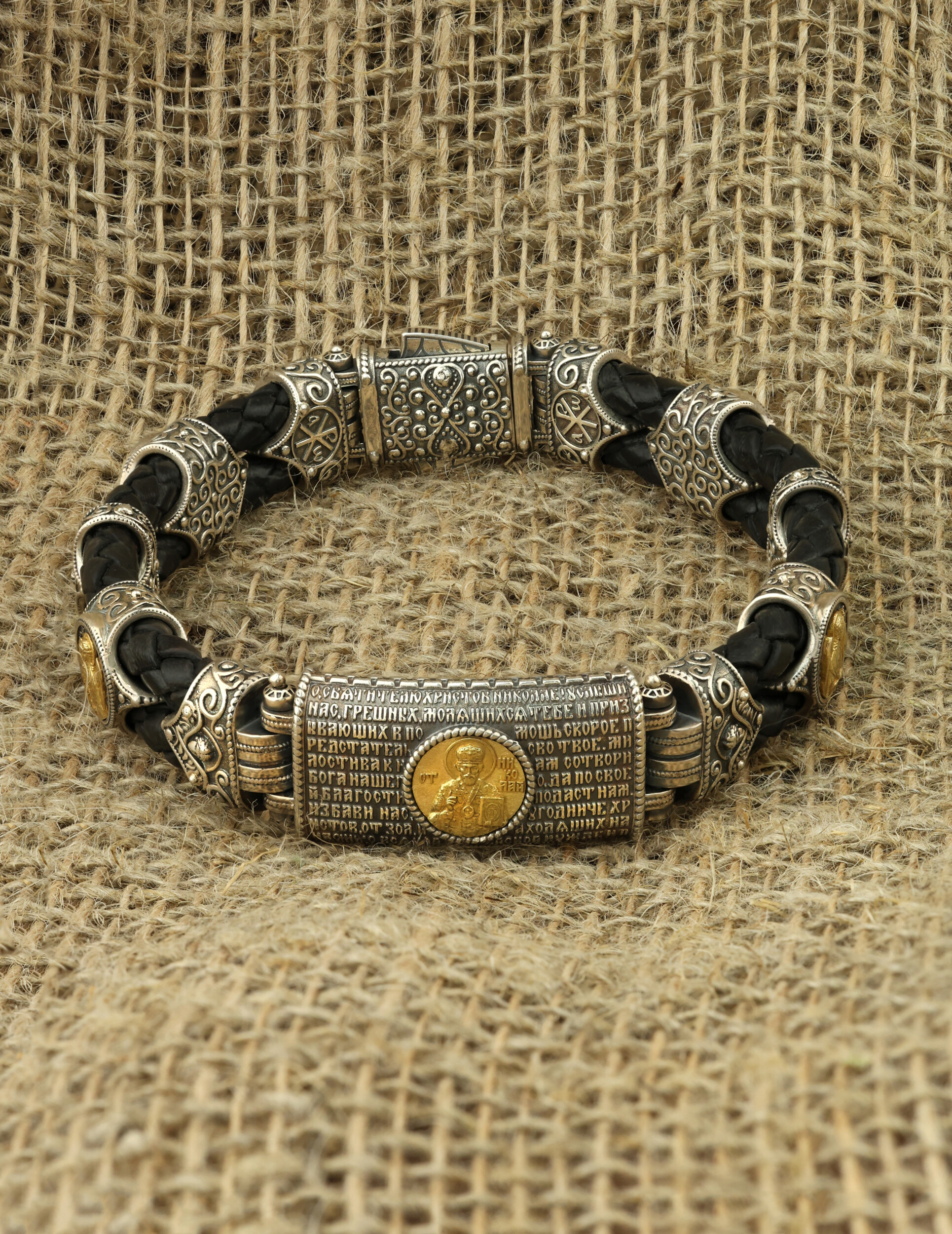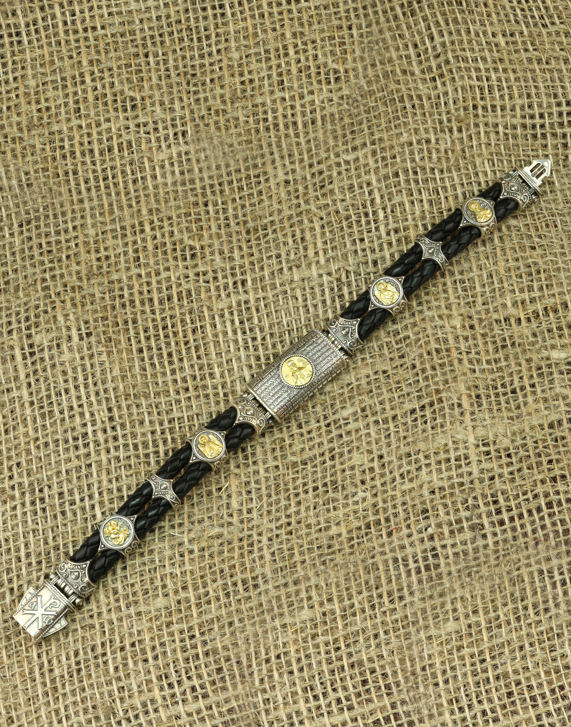 Браслет из серебра 925 пробы и золота 750 пробы c кожаным шнурком