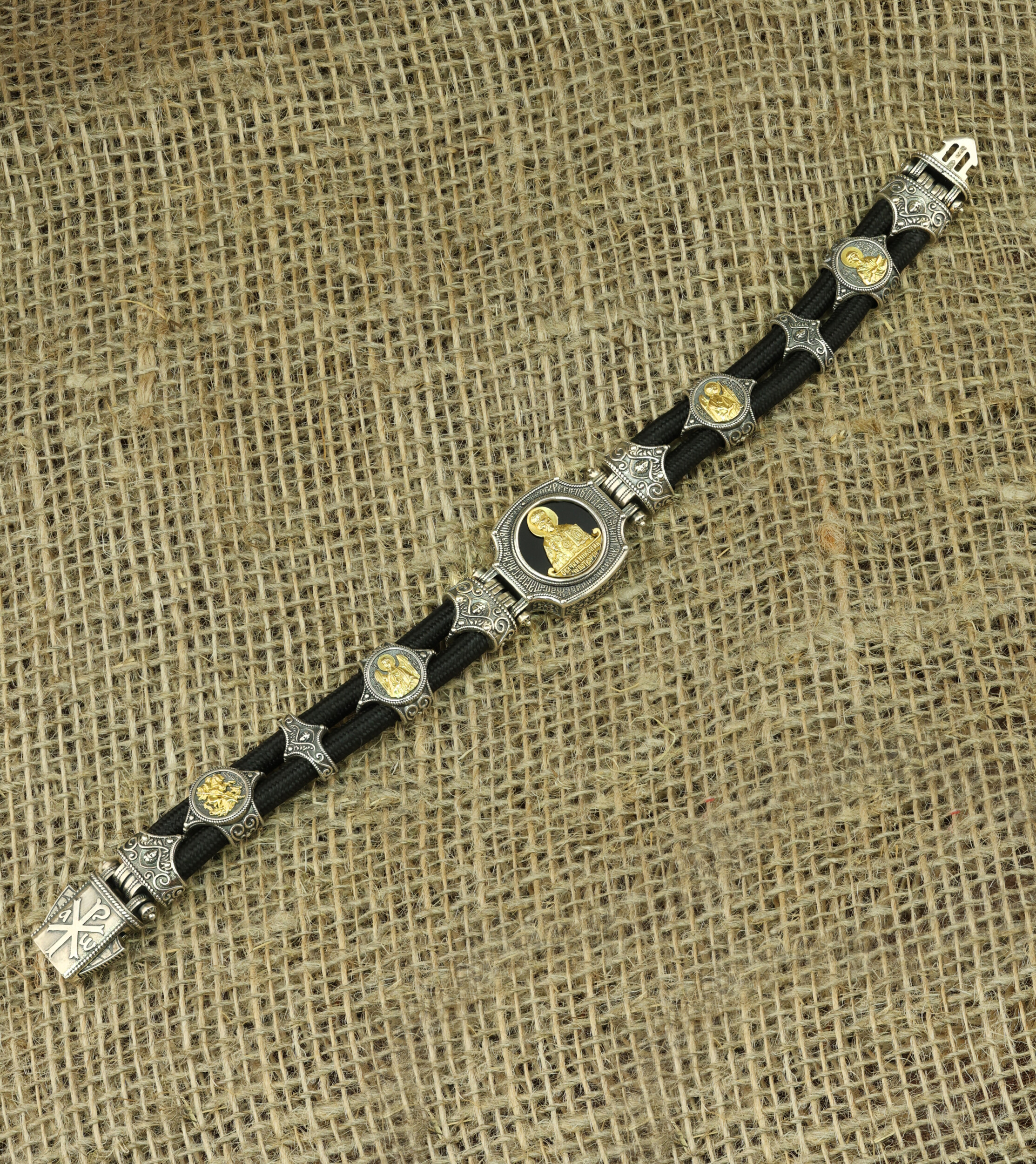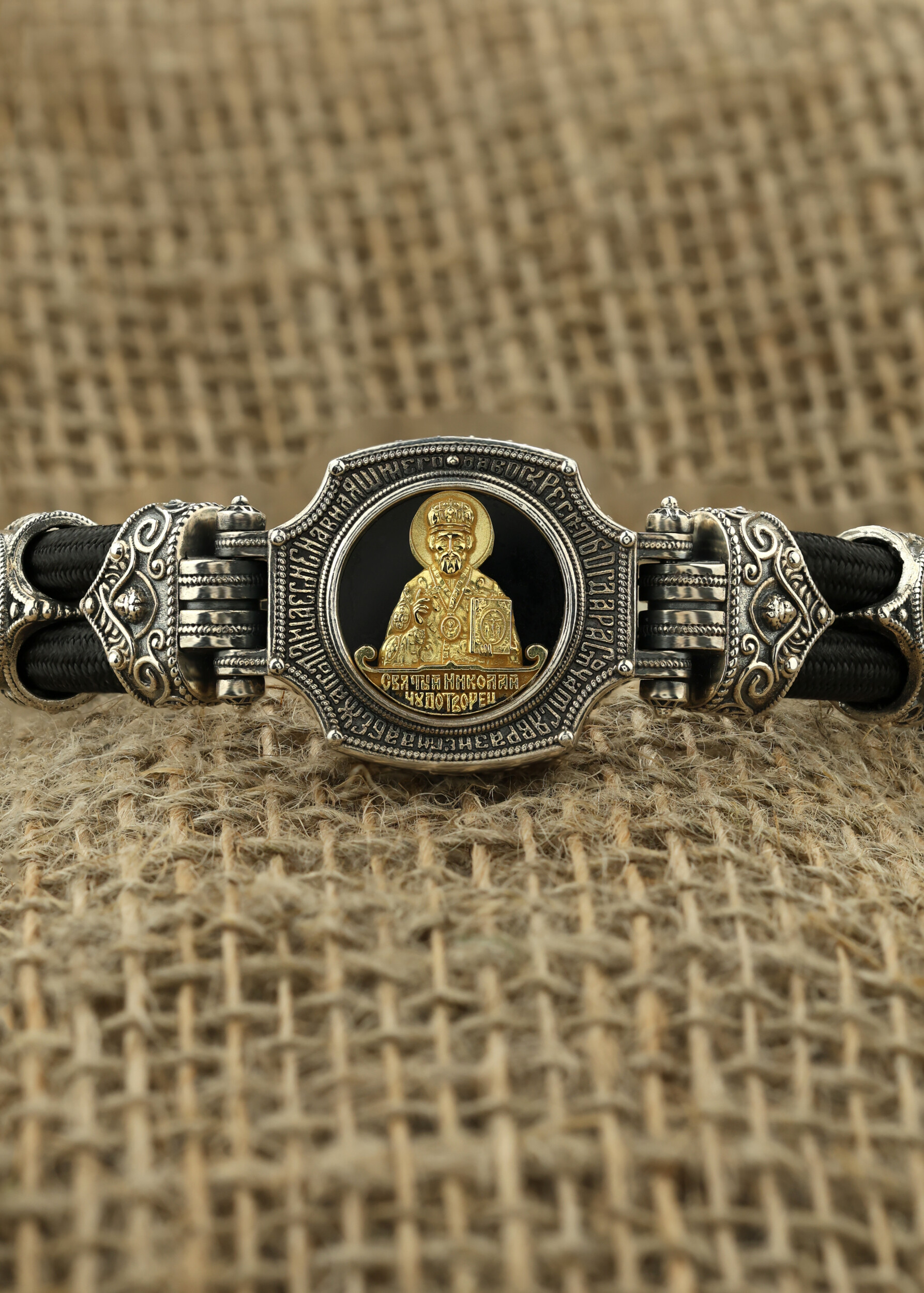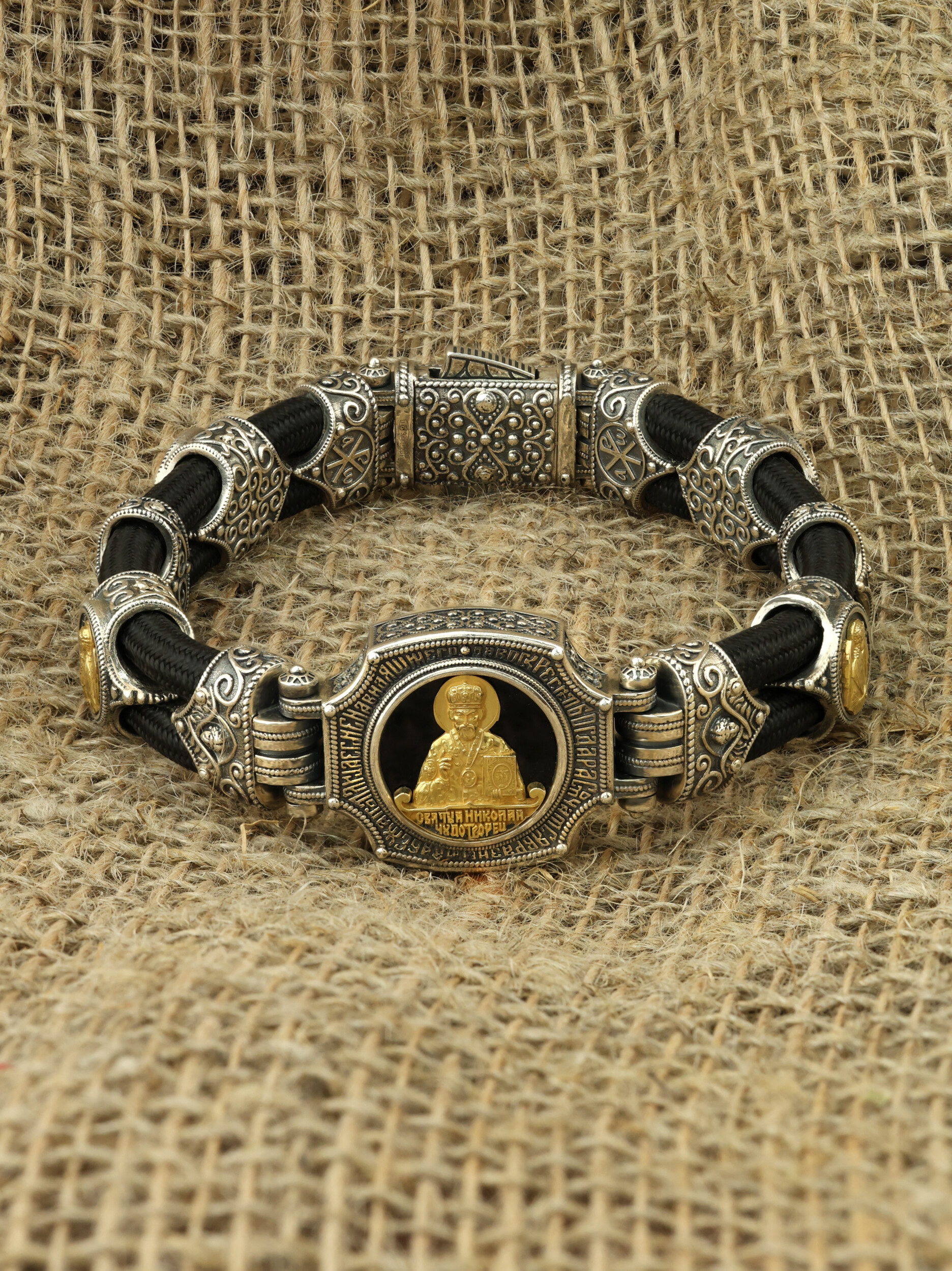 Браслет из серебра 925 пробы и золота 750 пробы c ониксом и шёлковым шнурком