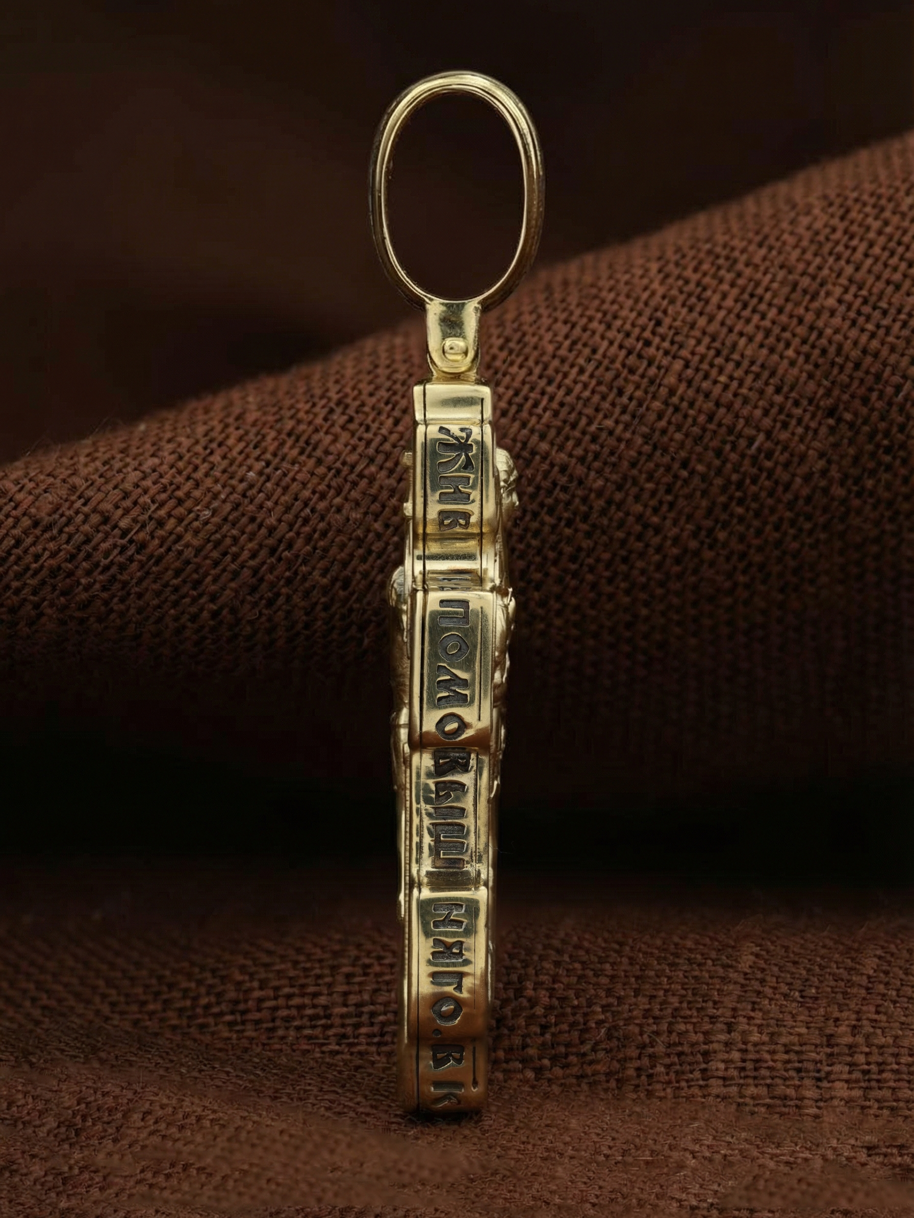 Центральную часть оборотной стороны креста занимает изображение Архангела Михаила — верного служителя Божия, который низринул с Неба возгордившегося денницу с другими павшими духами. В Православии его называют Архистратигом, что означает глава святого воинства Ангелов и Архангелов. Архангел Михаил изображен в воинственном виде с огненным мечом в правой руке. Архангел почитается как покровитель воинов и всех верных Богу и ведущих борьбу против сил зла, борец против ересей, а также защитник душ умерших, страж райских врат. С древних времен прославлен своими чудесами Архангел Михаил на Руси. Слева от образа Архангела изображен Святитель Николай Чудотворец, архиепископ Мир Ликийских, справа — Святитель Спиридон Тримифутский Чудотворец. Святители являются одними из самых почитаемых святых в православном мире. На торцевой стороне креста размещены слова молитвы из 90-го псалма: «Живый в помощи Вышняго, в крове Бога Небеснаго водворится. Речет…»