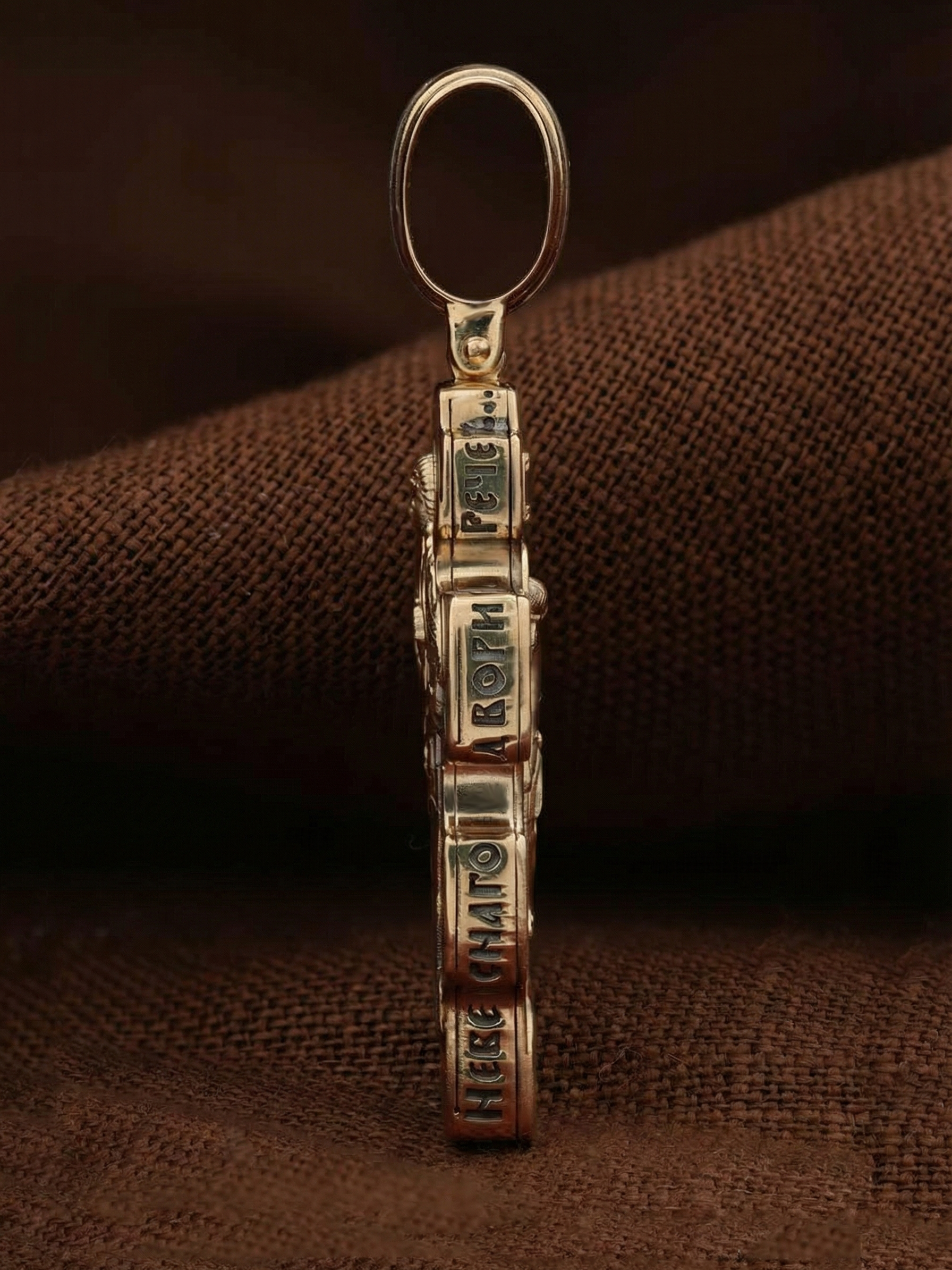 Центральную часть оборотной стороны креста занимает изображение Архангела Михаила — верного служителя Божия, который низринул с Неба возгордившегося денницу с другими павшими духами. В Православии его называют Архистратигом, что означает глава святого воинства Ангелов и Архангелов. Архангел Михаил изображен в воинственном виде с огненным мечом в правой руке. Архангел почитается как покровитель воинов и всех верных Богу и ведущих борьбу против сил зла, борец против ересей, а также защитник душ умерших, страж райских врат. С древних времен прославлен своими чудесами Архангел Михаил на Руси. Слева от образа Архангела изображен Святитель Николай Чудотворец, архиепископ Мир Ликийских, справа — Святитель Спиридон Тримифутский Чудотворец. Святители являются одними из самых почитаемых святых в православном мире. На торцевой стороне креста размещены слова молитвы из 90-го псалма: «Живый в помощи Вышняго, в крове Бога Небеснаго водворится. Речет…»