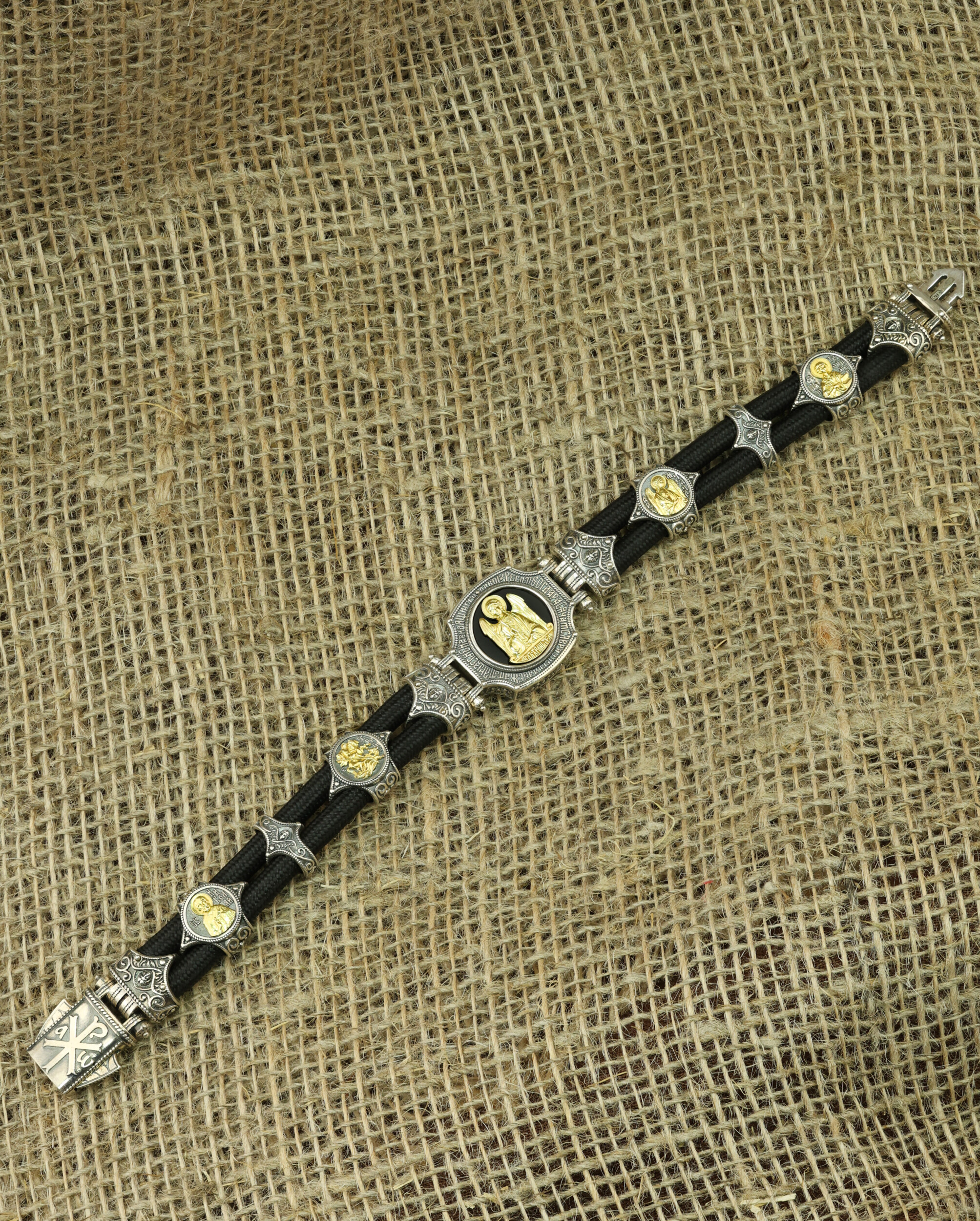 Браслет из серебра 925 пробы и золота 750 пробы c ониксом и шёлковым шнурком