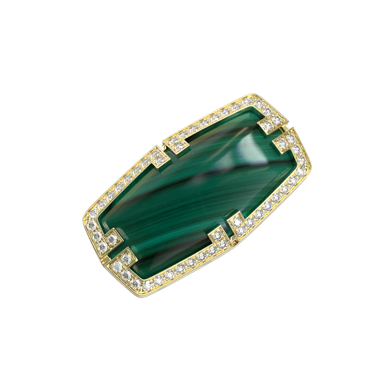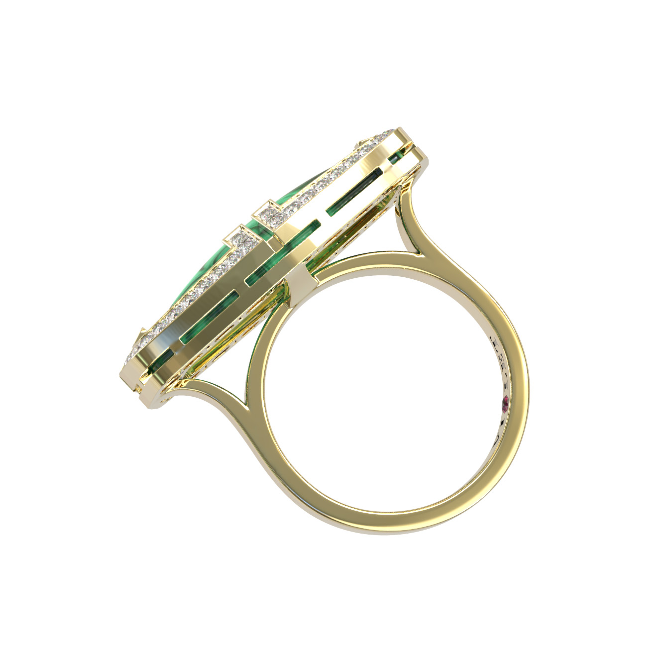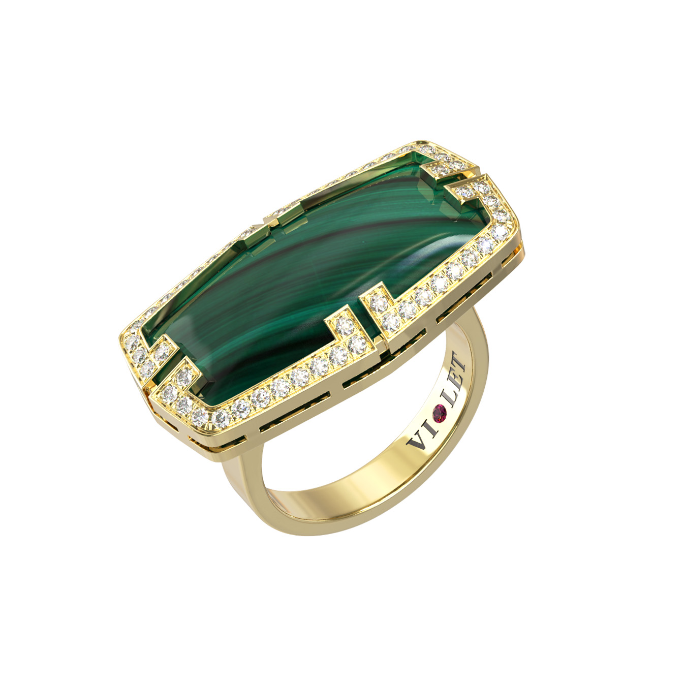 Центральным элементом композиции является крупный малахит зеленого цвета, который притягивает взгляд своей природной текстурой. Малахит окружен сияющей россыпью из 54 бриллиантов белого цвета круглой огранки, придающих кольцу премиальный блеск и выразительность. Завершающим штрихом стал акцентный рубин красного цвета, расположенный на шинке изделия, добавляющий яркости и глубины общему оформлению.