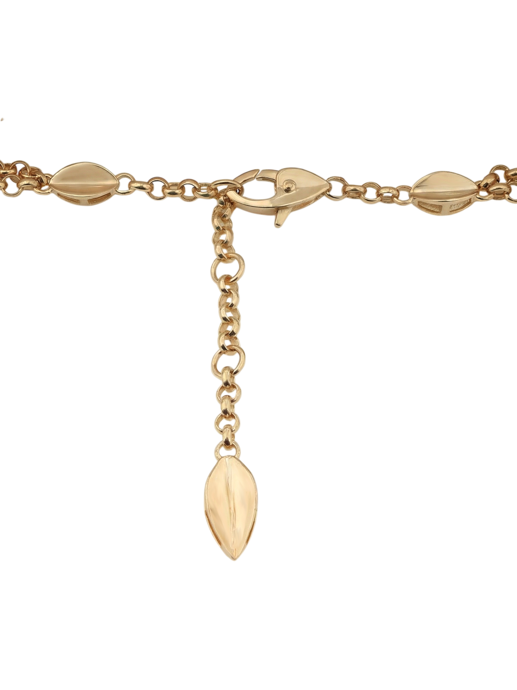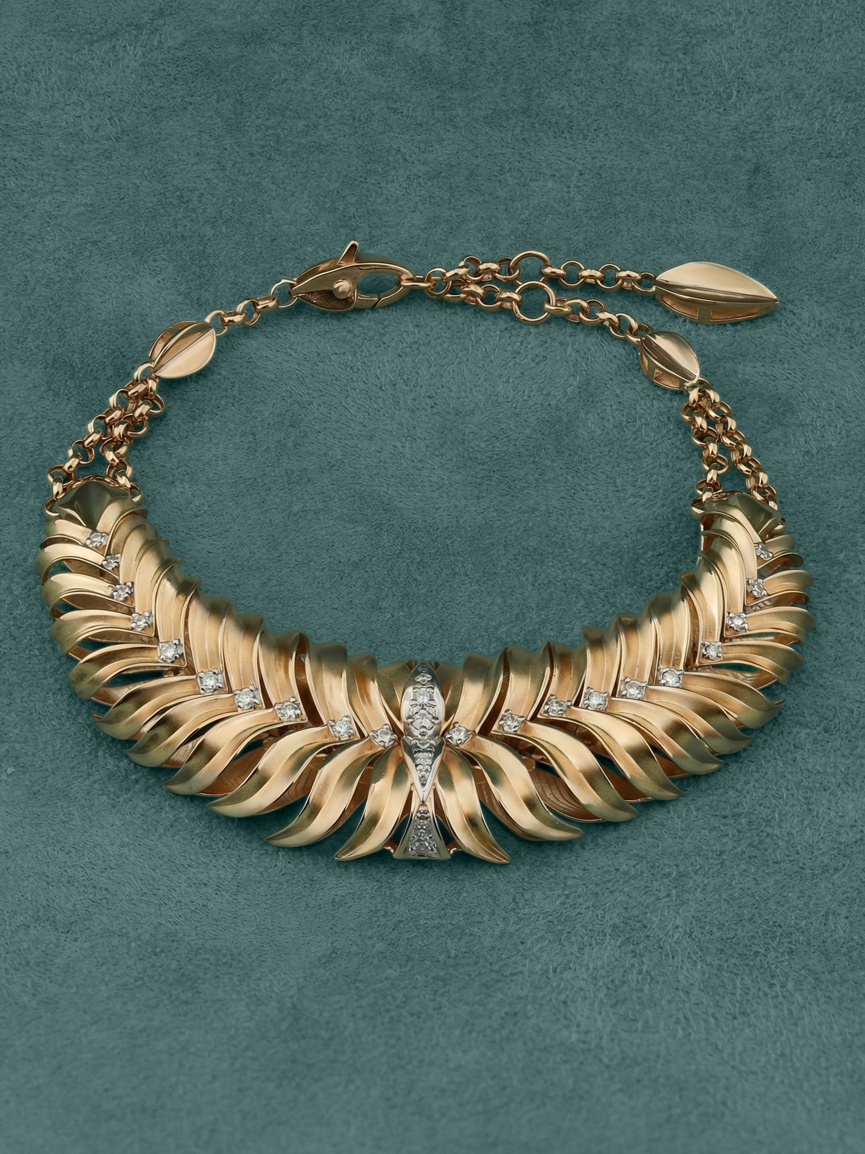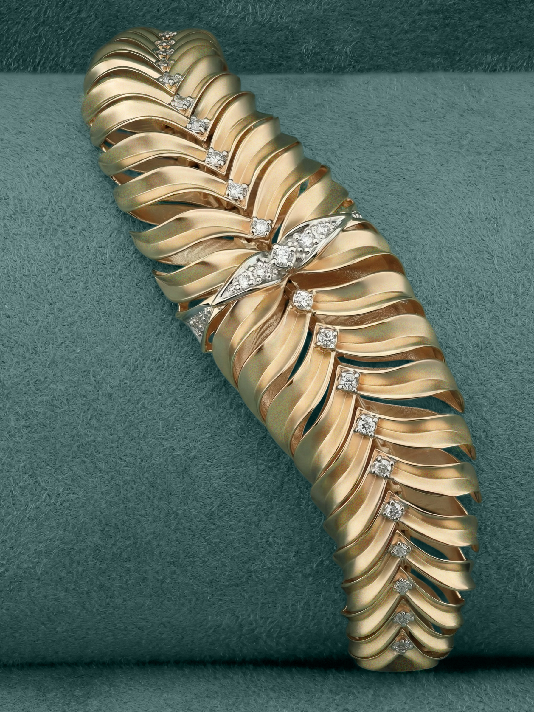 Роскошный браслет из красного золота 585 пробы станет центральным акцентом вашего образа. Дизайн украшения, вдохновленный природными мотивами, детально повторяет изящную форму листьев. Плавные, объемные линии металла создают эффект легкости и динамики, гармонично объединяясь в единую ювелирную композицию. Это изделие, представленное в коллекции Vioretty — Palm Branch, отличается безупречным исполнением и вниманием к деталям.