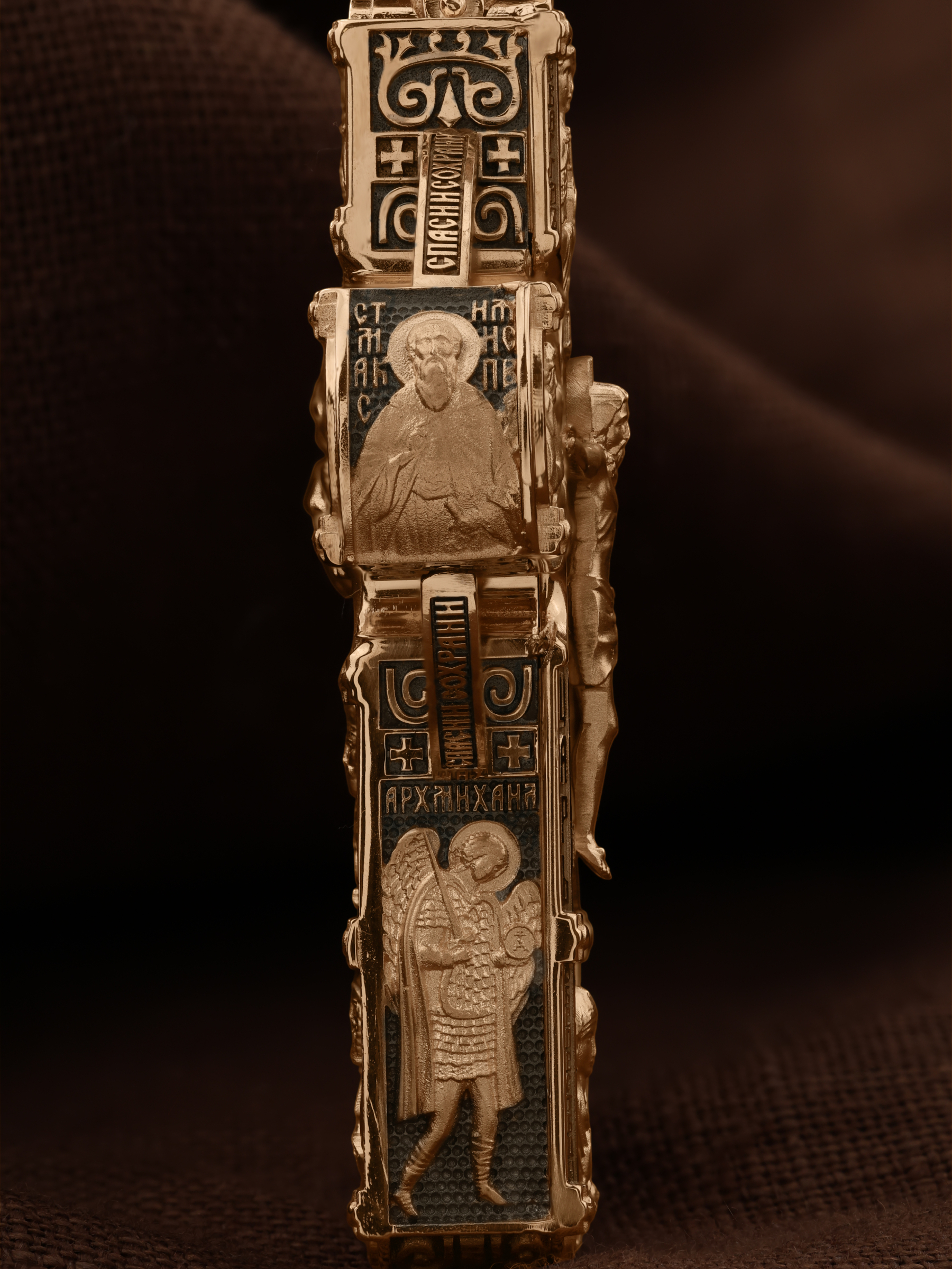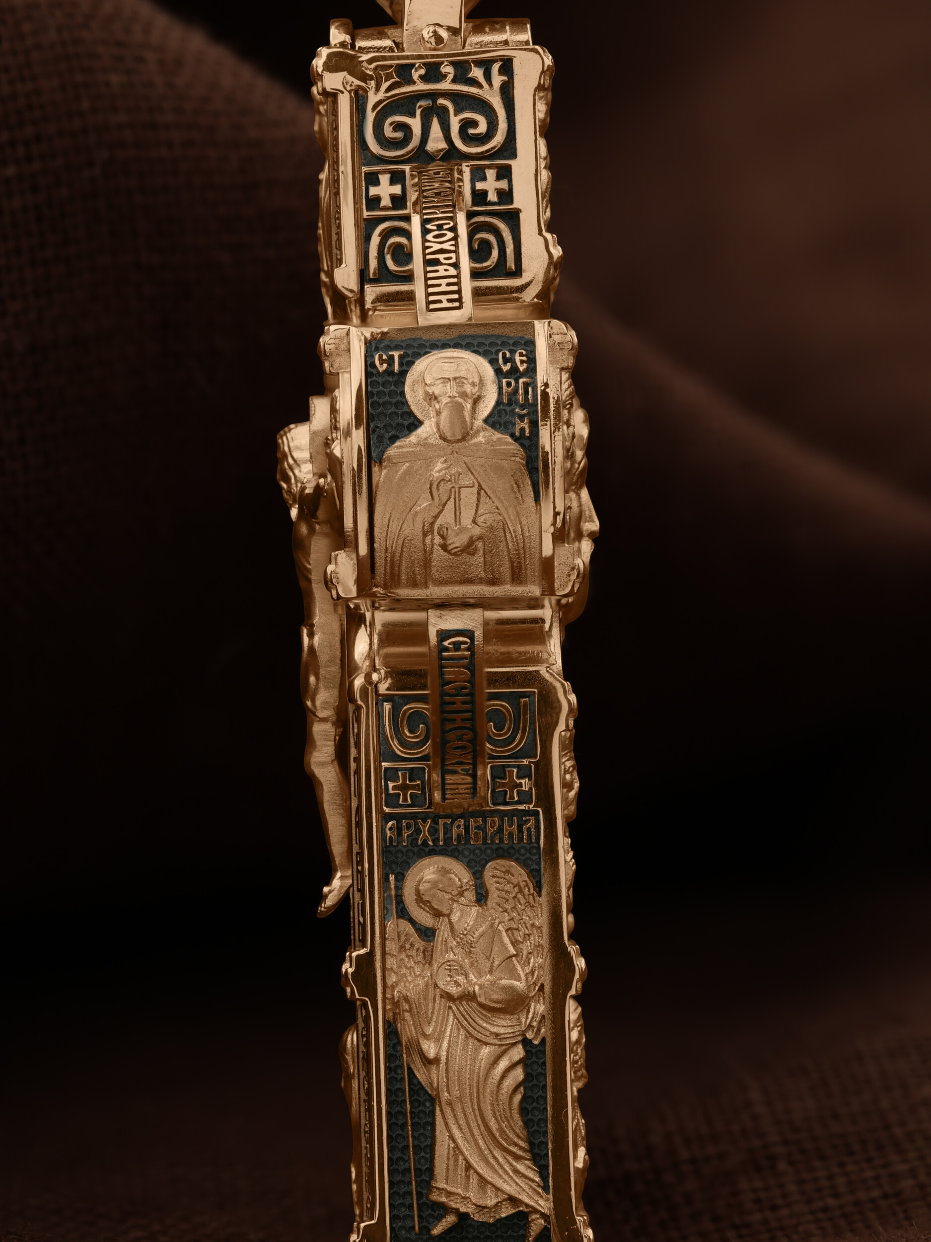 В центре оборотной стороны креста размещен образ Господа и Спасителя нашего Иисуса Христа — Господь Вседержитель или Пантократор (от греч. всевластный, всесильный). Именование Иисуса «Вседержителем» указывает, с одной стороны, на Его Божественную природу: «Аз есмь Альфа и Омега, начало и конец, говорит Господь, Который есть и был и грядет, Вседержитель» (Откр. 1: 8). С другой стороны, такое именование связано и с человеческой природой Христа, искупившего крестной жертвой людские грехи и обновившего тем самым человеческую природу. Над образом изображена икона Божией Матери «Владимирская», ниже — образы святителя Николая Чудотвореца, архиепископа Мир Ликийских и пророка Ильи. Слева изображен святитель Спиридон Тримифунтский, справа — преподобный Серафим Саровский. На кулонном кольце размещен образ шестикрылого Серафима.