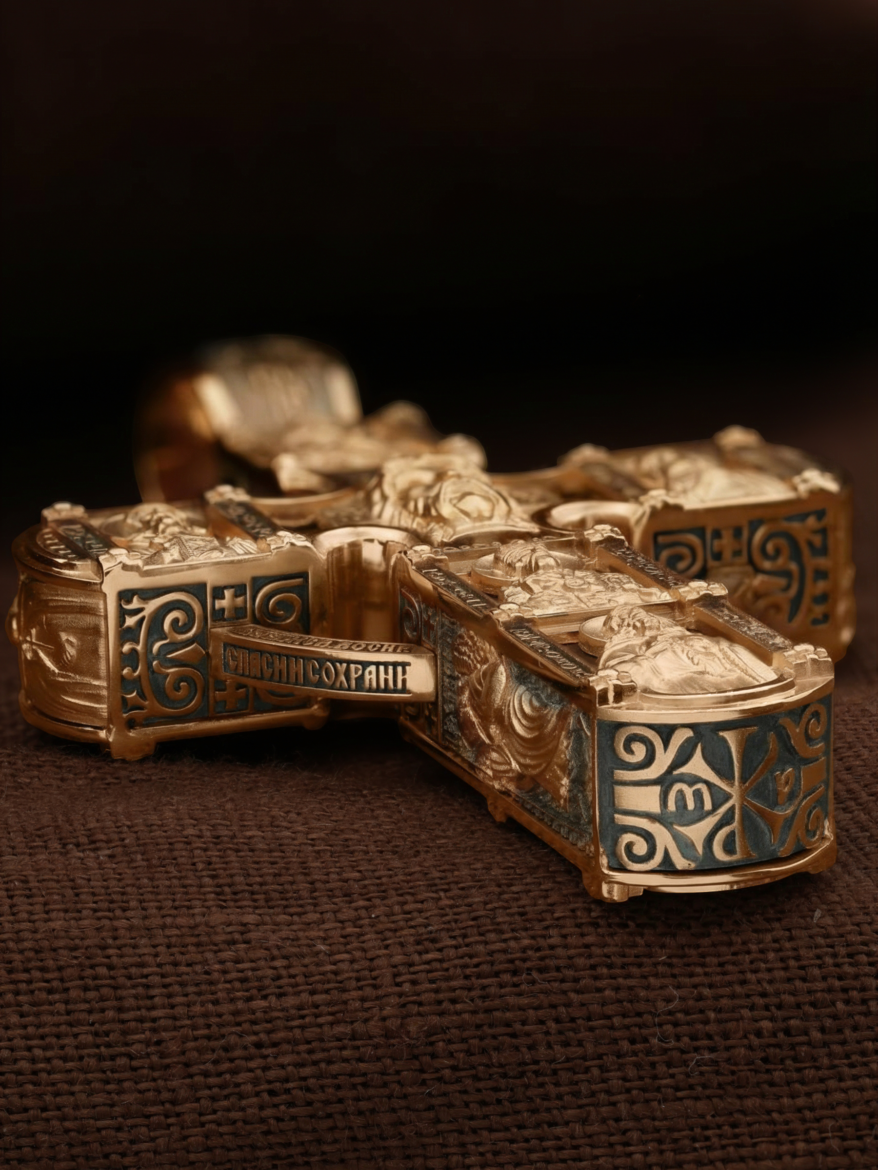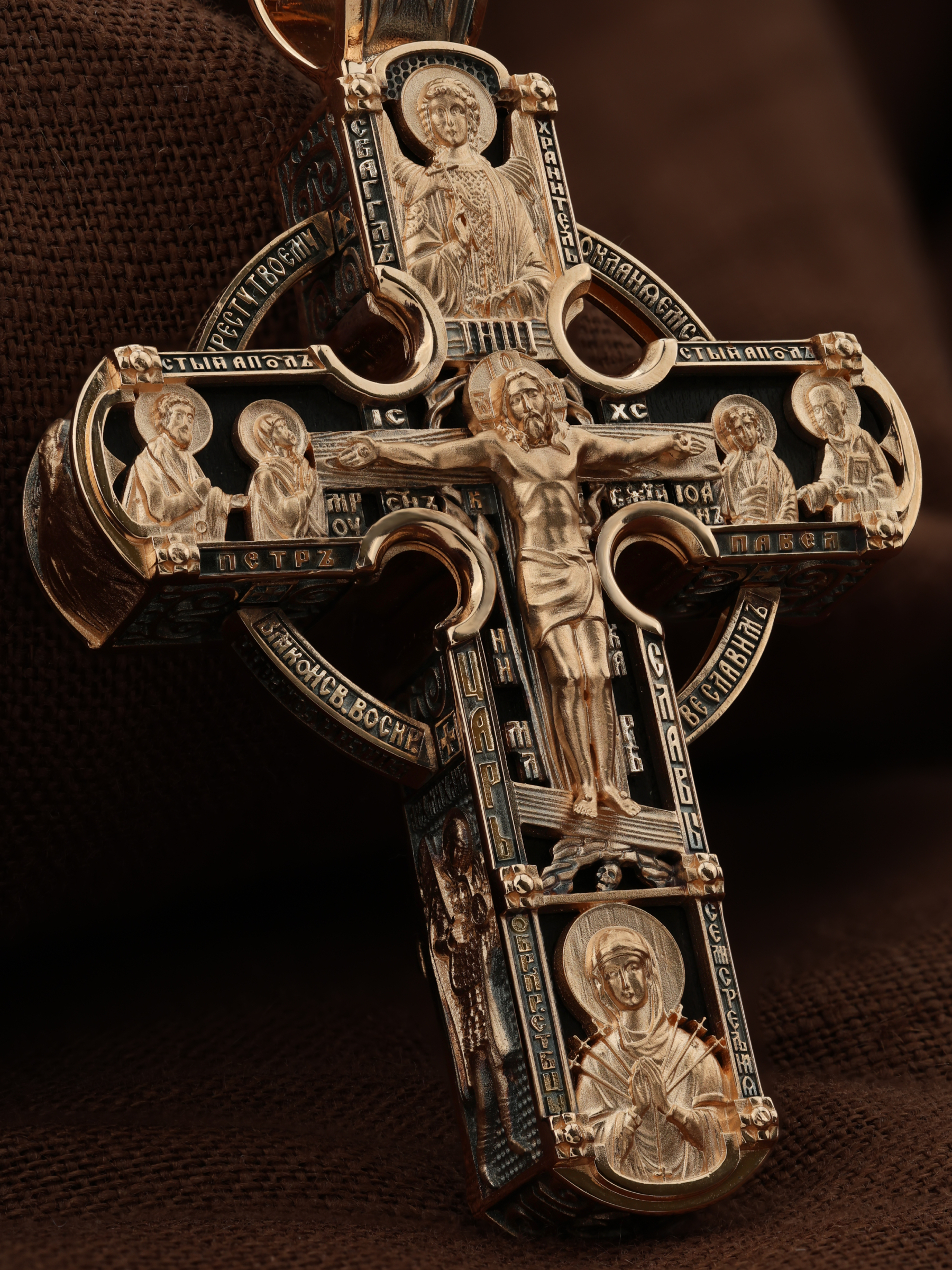 Крест объединяет в одной фигуре два христианских символа — круг-нимб и крест. На лицевой стороне креста изображено Распятие Господа и Спасителя нашего Иисуса Христа. Крест — символ спасения и искупления рода человеческого, знамение победы над смертью и адом. Распятие сопровождается каноническими надписями. На верхней табличке, выше головы Иисуса, расположена надпись, составленная Понтием Пилатом — «IНЦI». Она означает «Иисус Назорей, Царь Иудейский». Надписи «IC» «ХC», что означает Иисус Христос и «Сын Божий» размещается на разных сторонах поперечной перекладины креста. Вдоль Распятия размещены надписи «Царь Славы», «НИКА» (греч. — Победитель) и «МЛРБ» — «место лобное рай бысть» означает место лобное стало раем». Крест стоит на горе камней, символизирующих Голгофу. В ее основании различается череп — это голова Адама. Вдоль креста изображены орудия Страстей Христовых: копие сотника Лонгина, которым пронзили подреберье мёртвого Иисуса, чтобы убедиться в Его смерти, и трость с губкой, с которой Иисуса напоили уксусом. Они обозначены буквами «К» и «Т». Слева от Распятия помещены лики Пречистой Богородицы и Апостола Петра, справа изображены Апостол и евангелист Иоанн Богослов и Апостол Павел. Над Распятием изображен Святой Ангел-Хранитель, ниже — икона Божией Матери «Семистрельная». По кругу размещена молитва: «Кресту Твоему поклоняемся, Владыко, и Святое Воскресение Твое славим». На кулонном кольце помещено изображение Креста «Голгофа», на котором был распят Господь и Спаситель наш Иисус Христос.