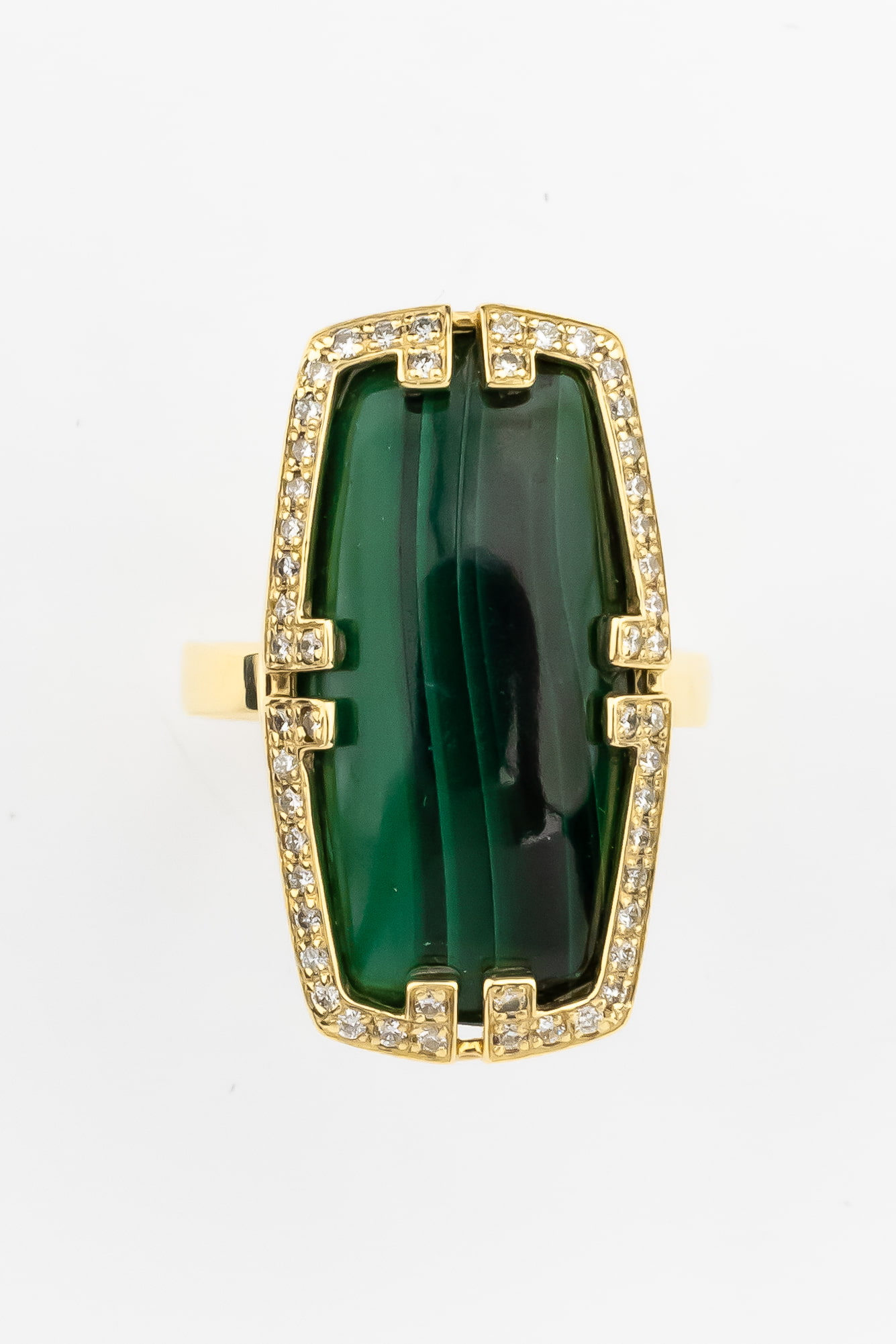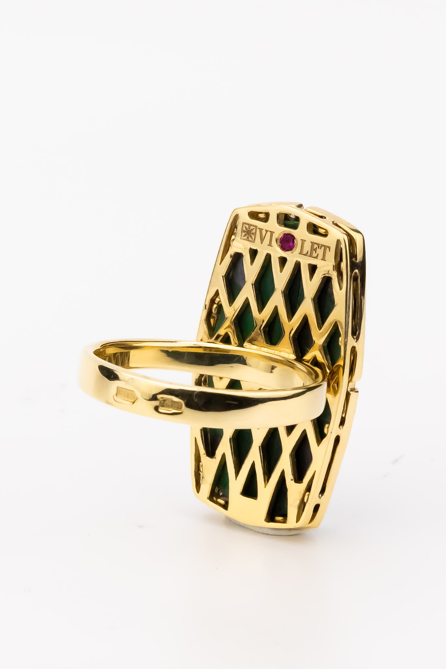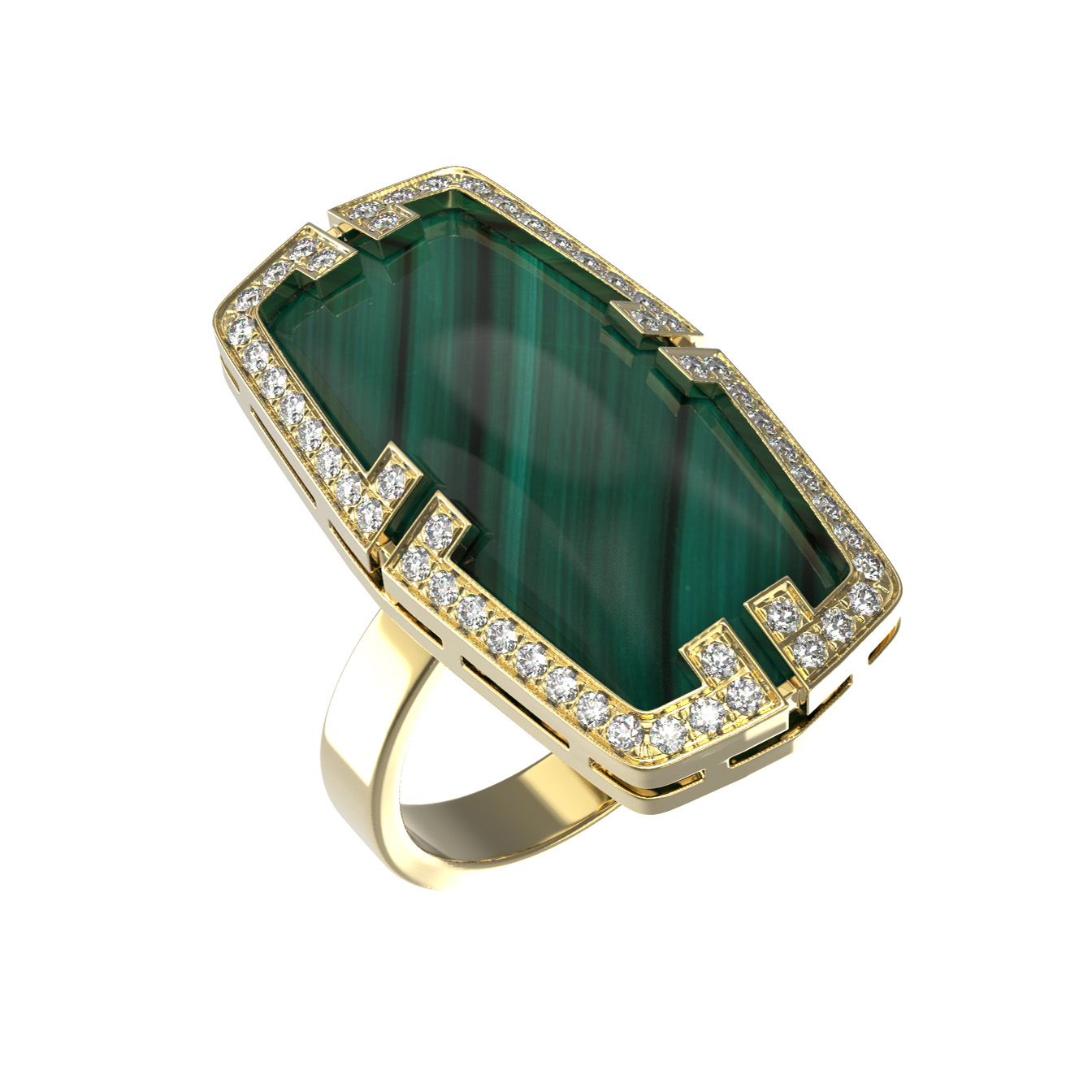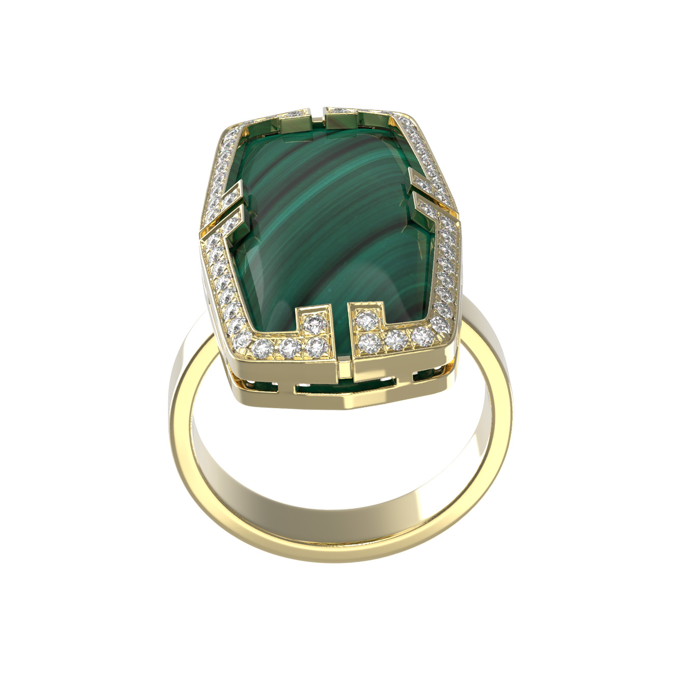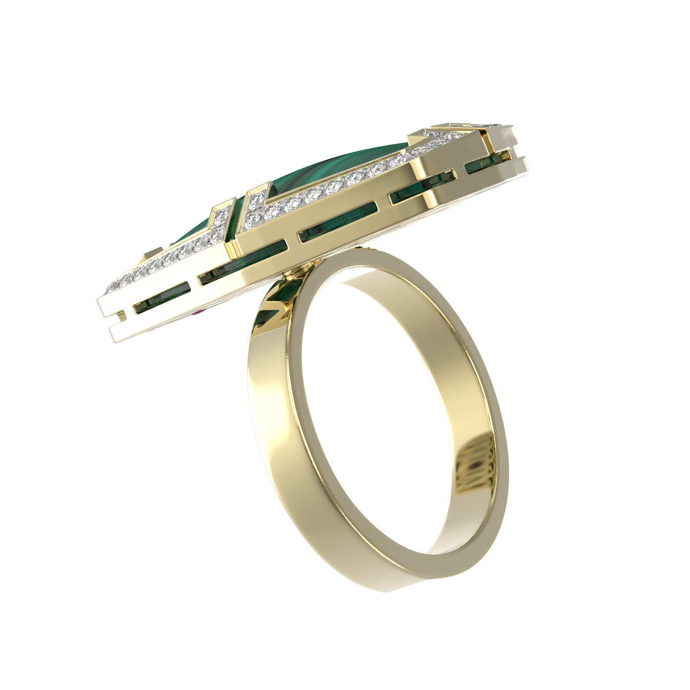 Роскошное кольцо из коллекции De Luxe — Геометрия воплощает в себе смелые принципы геометрии и благородство классических материалов. Это массивное ювелирное украшение выполнено из лимонного золота 585 пробы, чей теплый оттенок подчеркивает уникальность каждой детали. В центре композиции — глубокий, насыщенный зеленый малахит, который притягивает взгляд своим природным рисунком. Контрастный акцент в виде яркого красного рубина и сияющих белых бриллиантов, инкрустированных по периметру, превращает изделие в настоящий арт-объект.