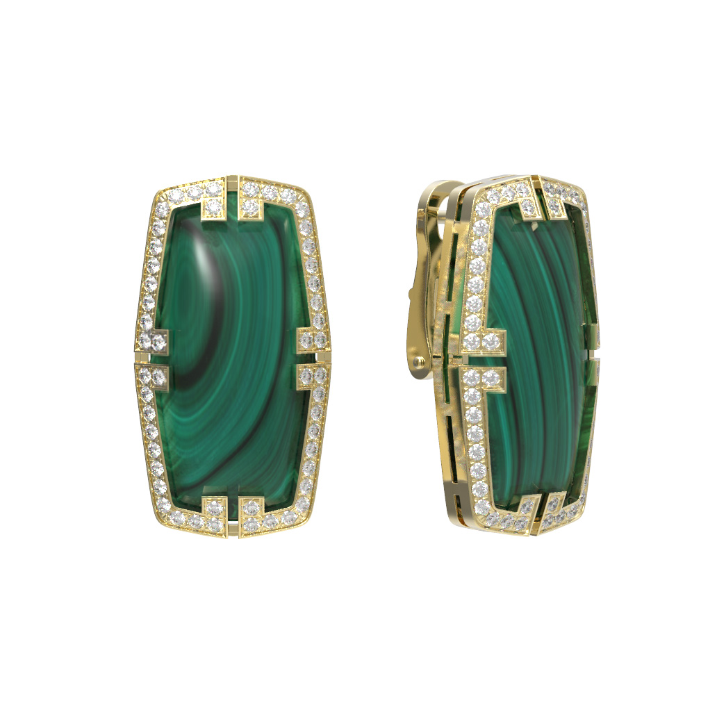 Эффектные серьги из коллекции De Luxe — Геометрия станут безупречным акцентом вашего образа, привлекая восхищенные взгляды своей архитектурной строгостью и глубиной цвета. Эти ювелирные украшения, выполненные из лимонного золота 585 пробы, воплощают в себе смелый дизайн в стиле геометрия, сочетая классическую роскошь и современные формы. Центральным элементом композиции является насыщенный зеленый малахит, чей уникальный природный рисунок гармонично подчеркнут яркими вставками из красного рубина и чистого белого бриллианта.