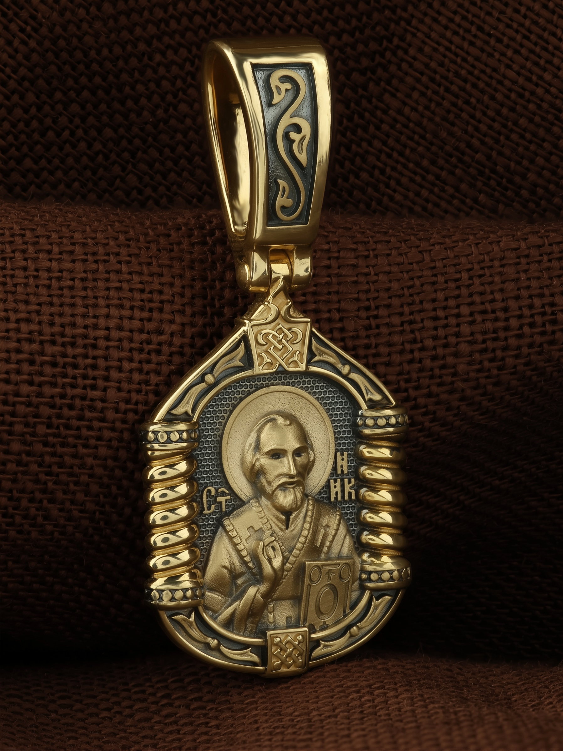 На лицевой стороне образка изображен Святитель Николай архиепископ Мир Ликийских, Чудотворец. Он является одним из самых почитаемых святых в православном мире. Святитель Николай родился во второй половине III века в Малой Азии в Ликийском городе Патары. С рождения Божий Угодник проявлял необыкновенные дарования. Сохранилось Предание, что во время крещения он, никем не поддерживаемый, простоял в купели три часа. Приняв сан священника, святитель Николай стал проводить еще более строгую подвижническую жизнь. Избранник Божий Николай стал вершиной всех добродетелей, поднятой до райской высоты. С кем из величайших праведников не сравнялся он образом духовной красоты, кому из них не последовал в своих деяниях и чудотворениях? Вся жизнь святого Николая — это служение Богу. Много великих и преславных чудес сотворил великий Святитель Николай Угодник. Он помогал сущим в бедах, укрощал штормы, спасал от потопления и выносил на сушу из глубины морской, освобождал из плена и приносил освобожденных домой, избавлял от уз и темницы, защищал от посечения мечом, освобождал от смерти и подавал многим различные исцеления, слепым прозрение, хромым хождение, глухим слух, немым дар слова.
