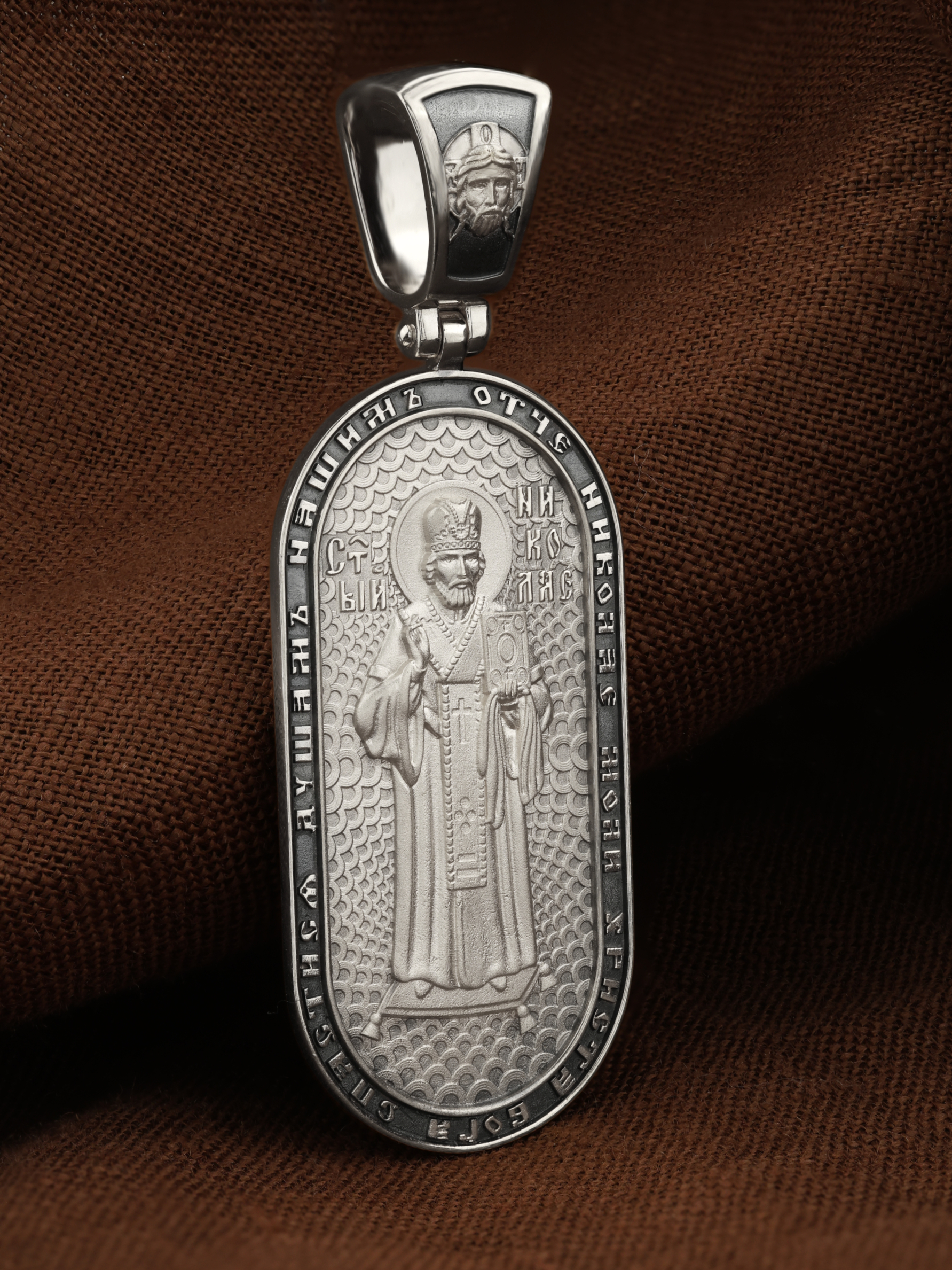 На оборотной стороне изображен Святой Николай Чудотворец, которого еще называют Николай Угодник — помощник в делах, покровитель учащихся, утешитель обиженных и нуждающихся, целитель самых страшных и тяжелых недугов, предстатель и молитвенник за людей перед Богом. Также Святитель Николай Чудотворец известен своими молитвами за путешественников, когда непрестанный ветер и бушующие волны утихают и корабль заходит в спокойную гавань. По контуру написана молитва: «Отче, Николай, моли Христа Бога спастися душам нашим». На кулонном кольце помещено изображение Спаса Нерукотворного.