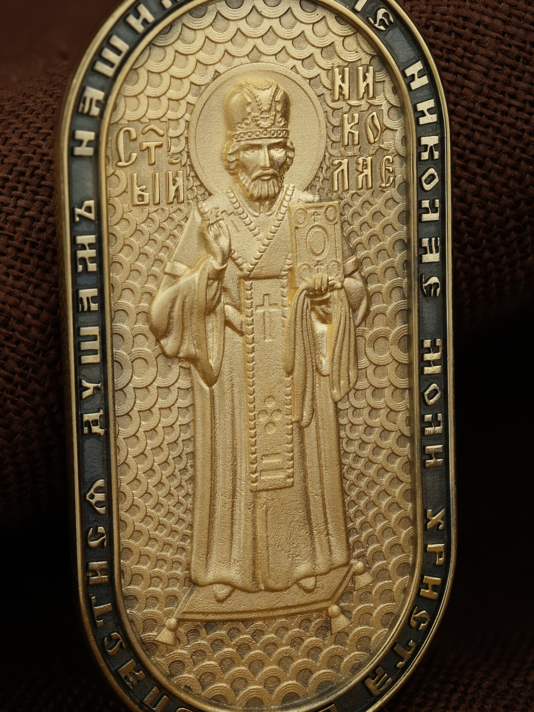 На оборотной стороне изображен Святой Николай Чудотворец, которого еще называют Николай Угодник — помощник в делах, покровитель учащихся, утешитель обиженных и нуждающихся, целитель самых страшных и тяжелых недугов, предстатель и молитвенник за людей перед Богом. Также Святитель Николай Чудотворец известен своими молитвами за путешественников, когда непрестанный ветер и бушующие волны утихают и корабль заходит в спокойную гавань. По контуру написана молитва: «Отче, Николай, моли Христа Бога спастися душам нашим». На кулонном кольце помещено изображение Спаса Нерукотворного.