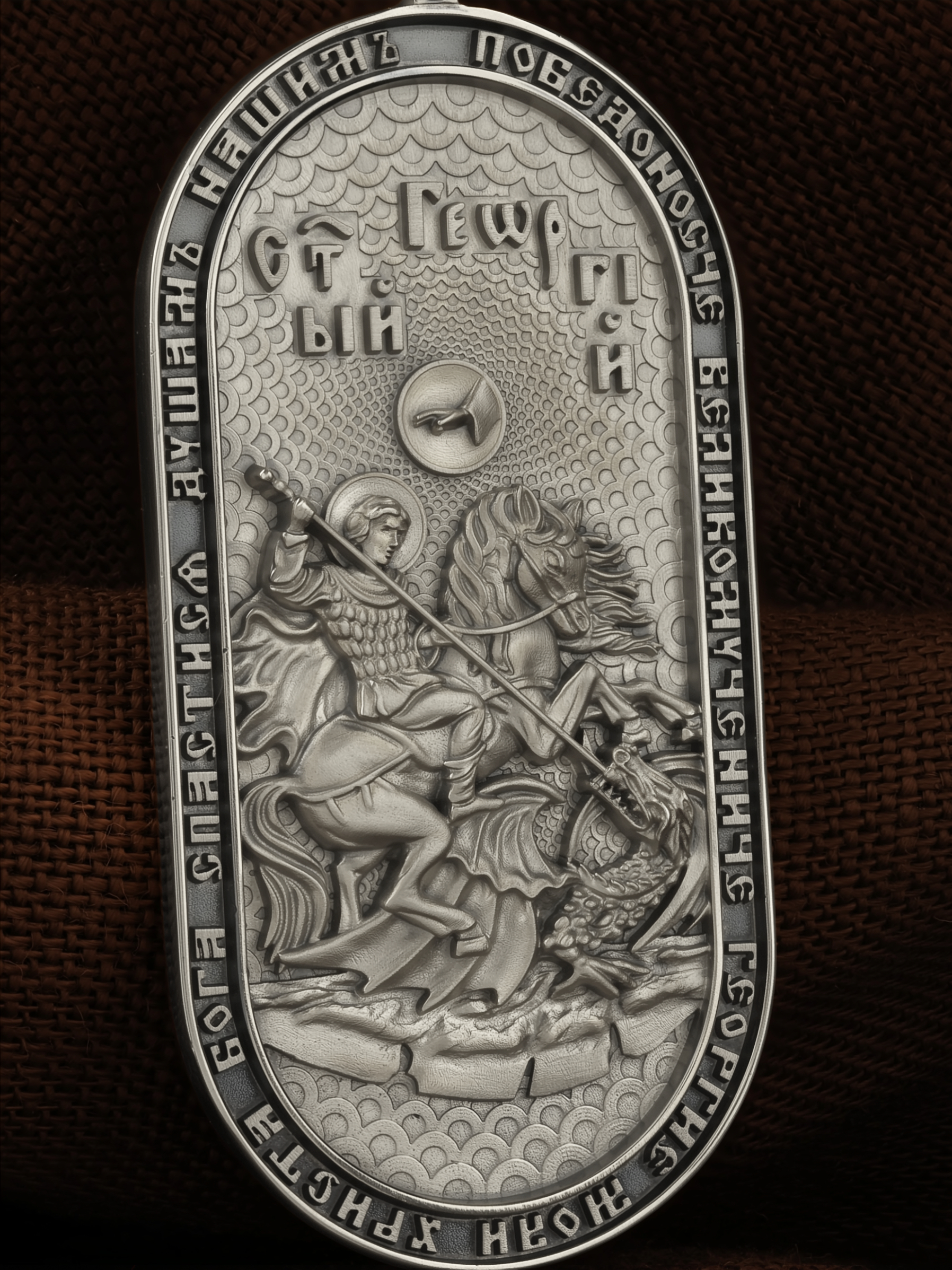 По контуру написана молитва: «Победоносче Великомучениче Георгие, моли Христа Бога спастися душам нашим». На кулонном кольце изображен Спас Нерукотворный — Символ вочеловечившегося Божества.