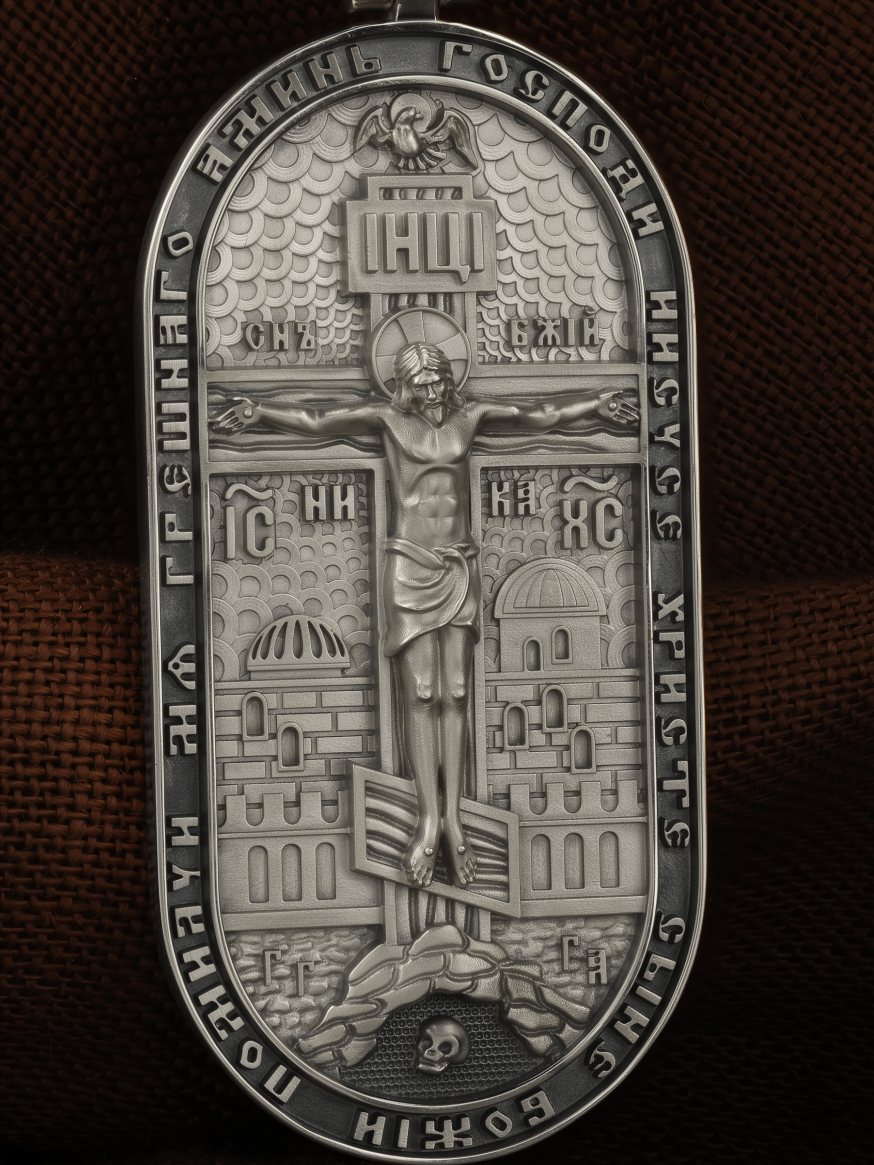 Центральную часть лицевой стороны занимает Распятие, потому что это орудие казни Иисус Христос сделал орудием победы над грехом и смертью. Своими страданиями Он искупил грехи человечества, умерев и сошествовав во ад, победил сатану, освободил души праведников от вечной смерти и открыл им небесные врата рая. Жертва Христа сделала возможным спасение для каждого человека. На православном кресте Христос не умирает, а свободно простирает руки, ладони Иисуса открыты, будто он хочет обнять все человечество, даря им свою любовь и открывая путь к вечной жизни.