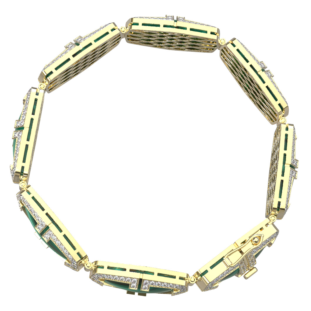 Роскошный браслет из лимонного золота 585 пробы — это воплощение изысканности и безупречного вкуса. Изделие, входящее в коллекцию De Luxe — Геометрия, выполнено в оригинальном дизайне с элементами геометрии, что придает украшению особую архитектурную выразительность. Центральным акцентом композиции стали насыщенные вставки из малахита, чьи природные узоры глубокого зеленого цвета гармонично дополняют сияние драгоценных камней.