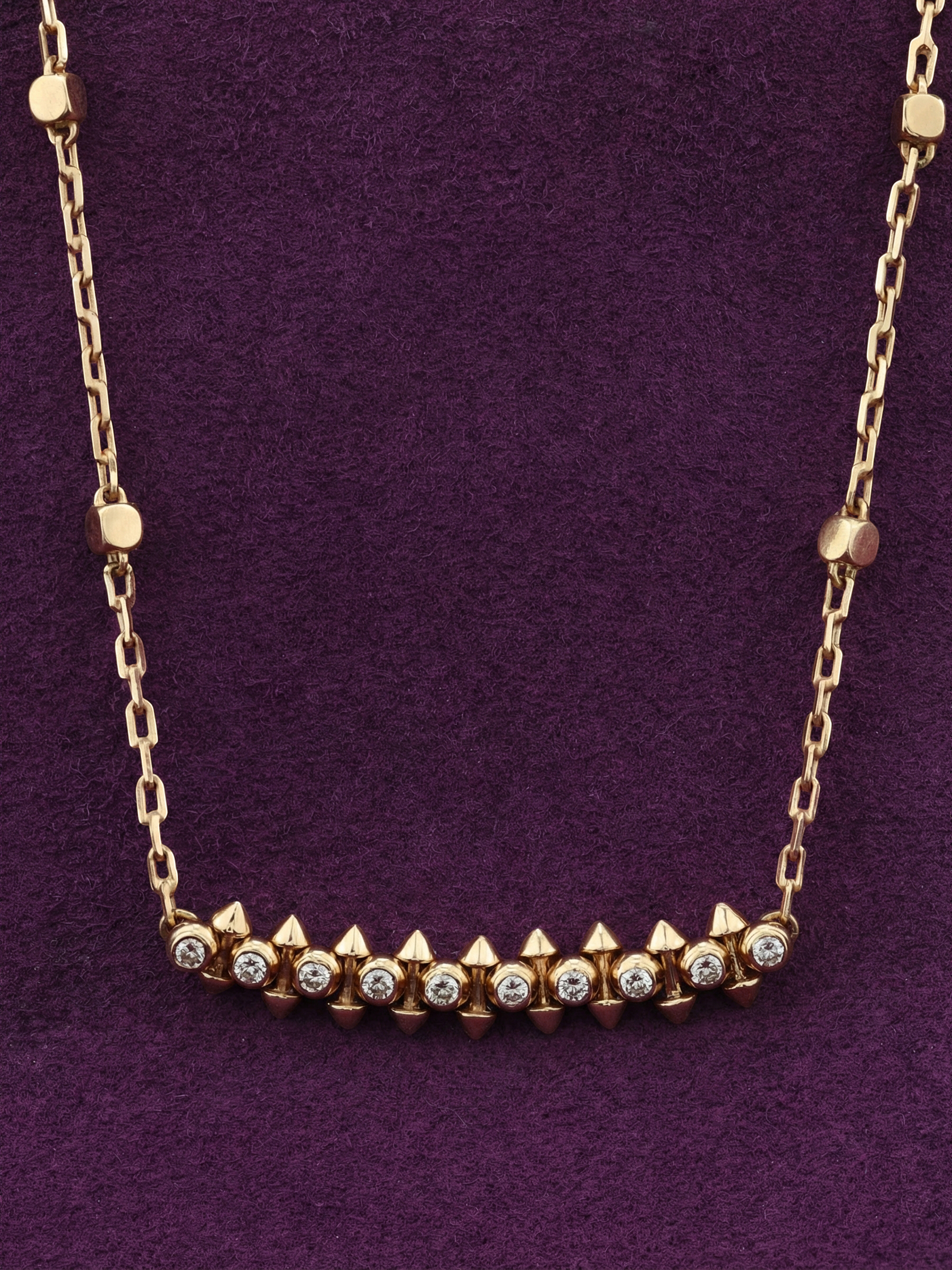 Центральная часть украшения украшена 20 бриллиантами круглой формы. Белый цвет вставок эффектно контрастирует с теплым оттенком красного золота, создавая игру света при каждом движении. Продуманное сочетание дерзкой формы шипов и сияния бриллиантов делает это колье универсальным украшением, которое одинаково выигрышно смотрится как на женщинах, так и на мужчинах.
