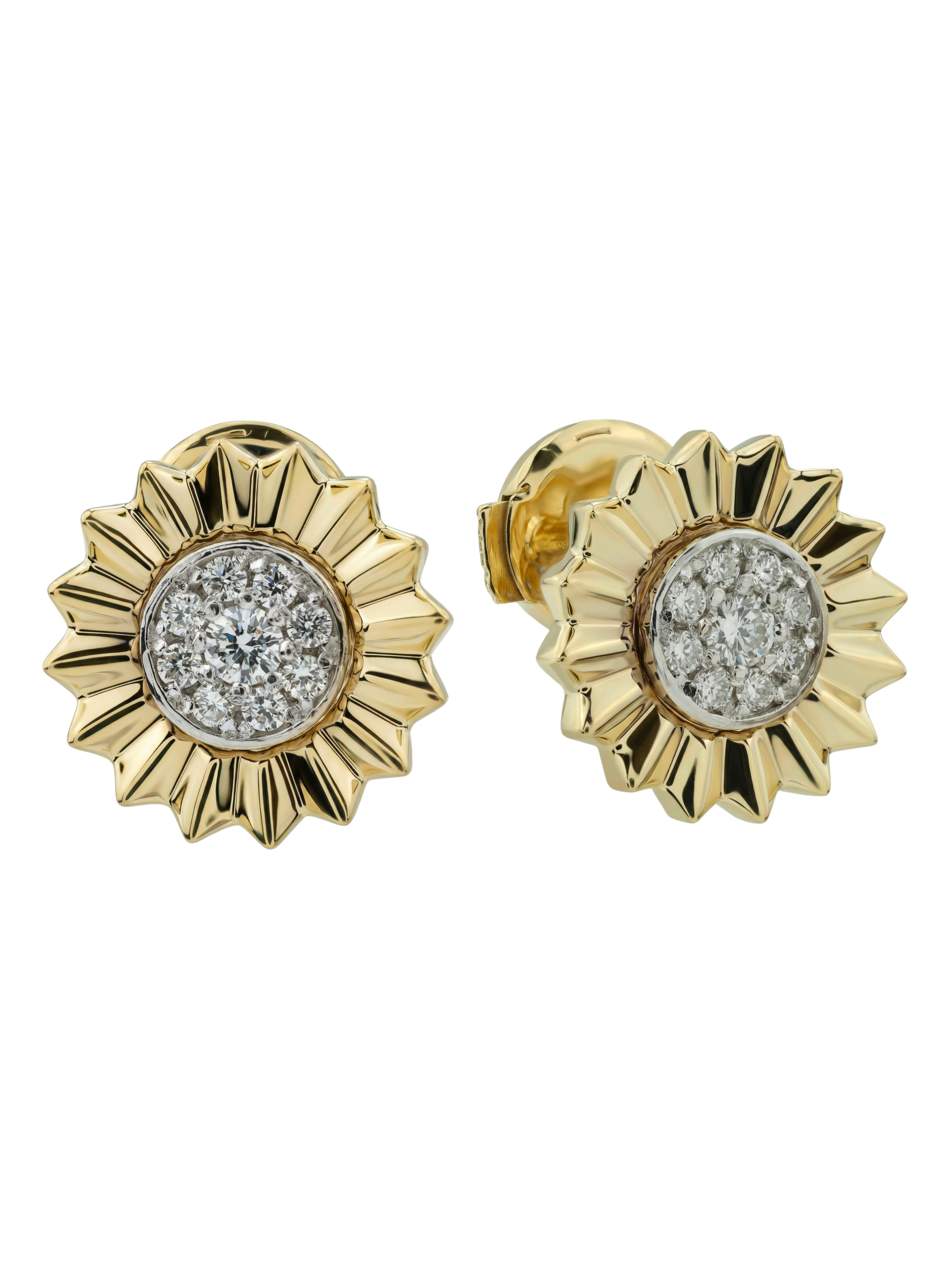 Серьги из лимонного золота 585 пробы из коллекции Vioretty — Napoli — это воплощение изысканности и утонченного стиля. Дизайн украшения выполнен в форме цветка, чьи лучистые лепестки из благородного лимонного золота создают эффект сияния, напоминающий теплое солнце. Центральная часть изделия инкрустирована 18 бриллиантами круглой формы с чистым белым цветом вставок, которые приковывают взгляд своим безупречным блеском.