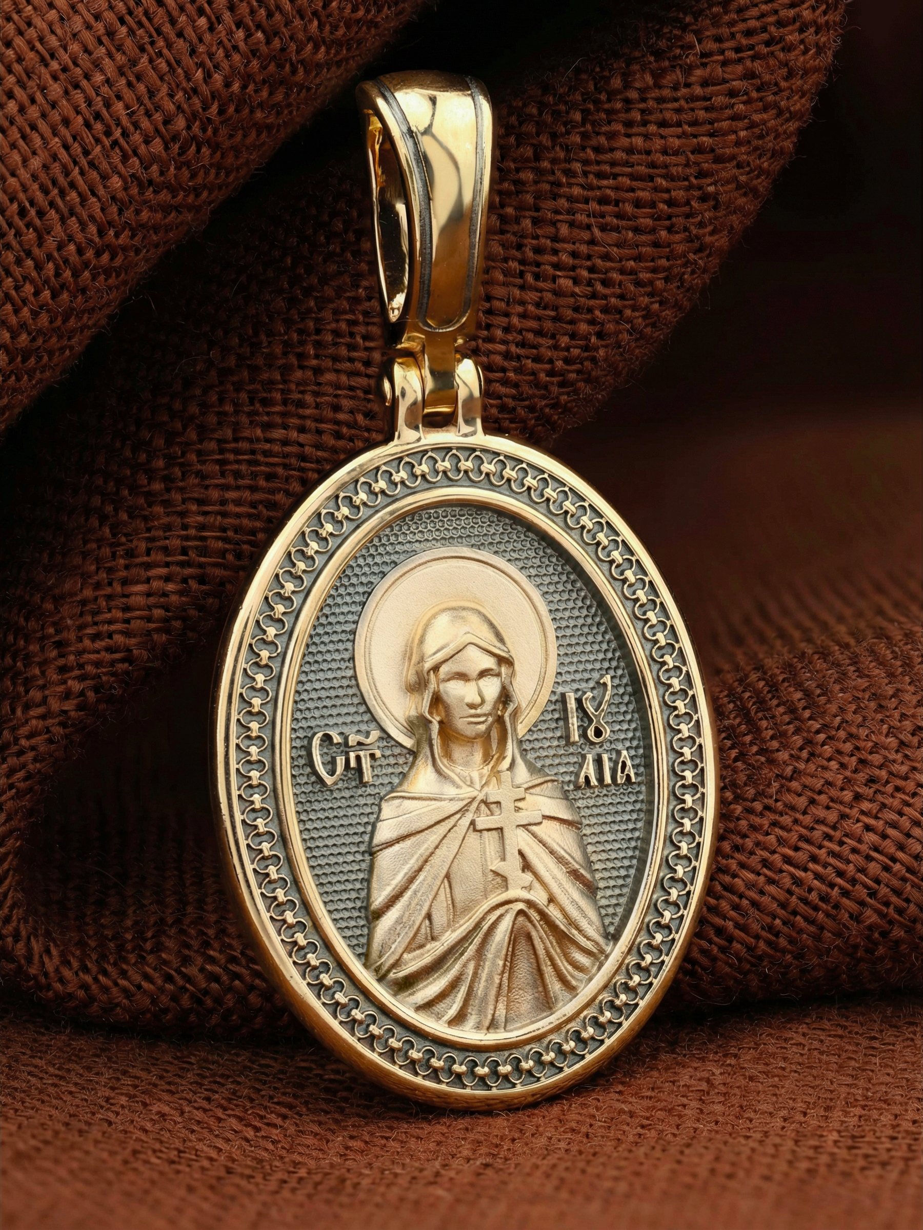 Юлия пострадала от рук организатора языческого праздника на острове Корсика, отказавшись приносить жертвоприношения. Она не побоялась перед всеми сказать, что она христианка. Обезумевшие язычники распяли девушку. На месте страданий и погребения Юлии стали совершаться чудеса, в том числе исцеление болезней. На обороте образка написана молитва: «О, Святая Иулие, моли Господа помиловати нас грешных».