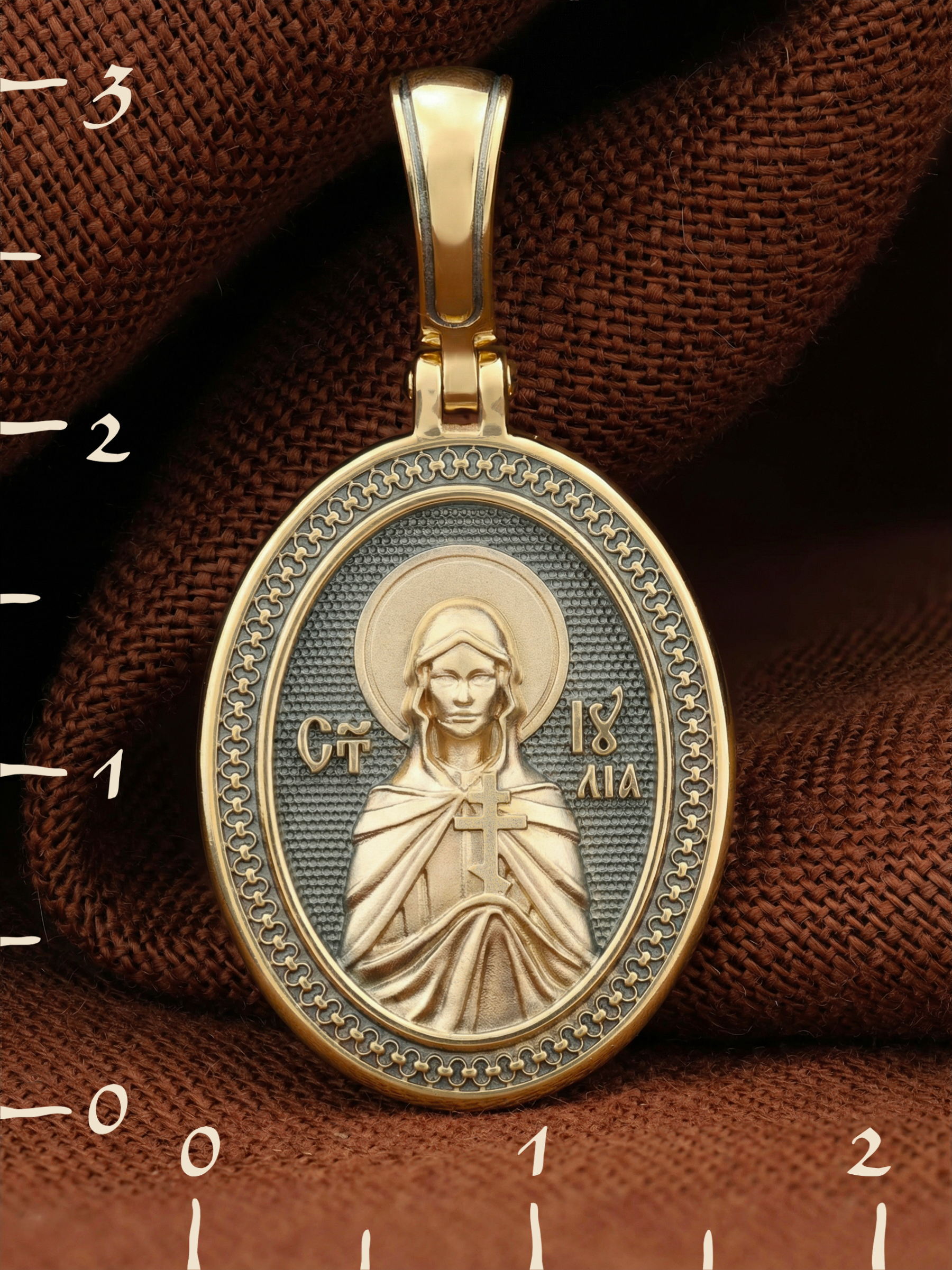 Центральную часть лицевой стороны занимает изображение Святой Мученицы Иулии (Юлии) Корсиканской. Покровительница Корсики, маленькой девочкой попала в плен и была продана в рабство. Служила богатому купцу-язычнику, который старался приобщить ее к своей вере, но юная Юлия свято хранила христианские заповеди, соблюдая себя в чистоте и благочестии. Хозяин удивлялся ее доброму нраву, кротости и смирению. Видя, что она верно служит и усердно работает, оставил ее в покое.
