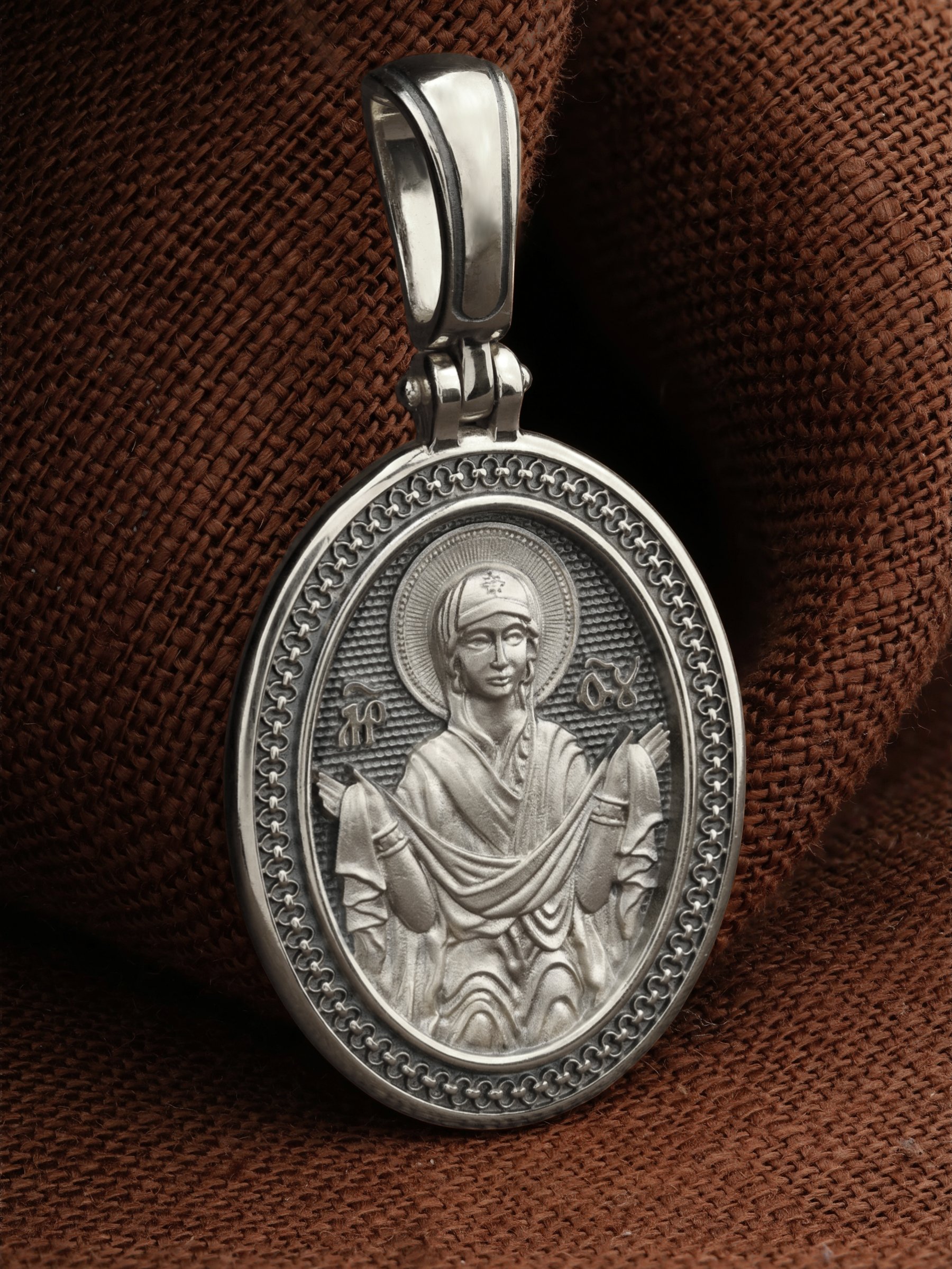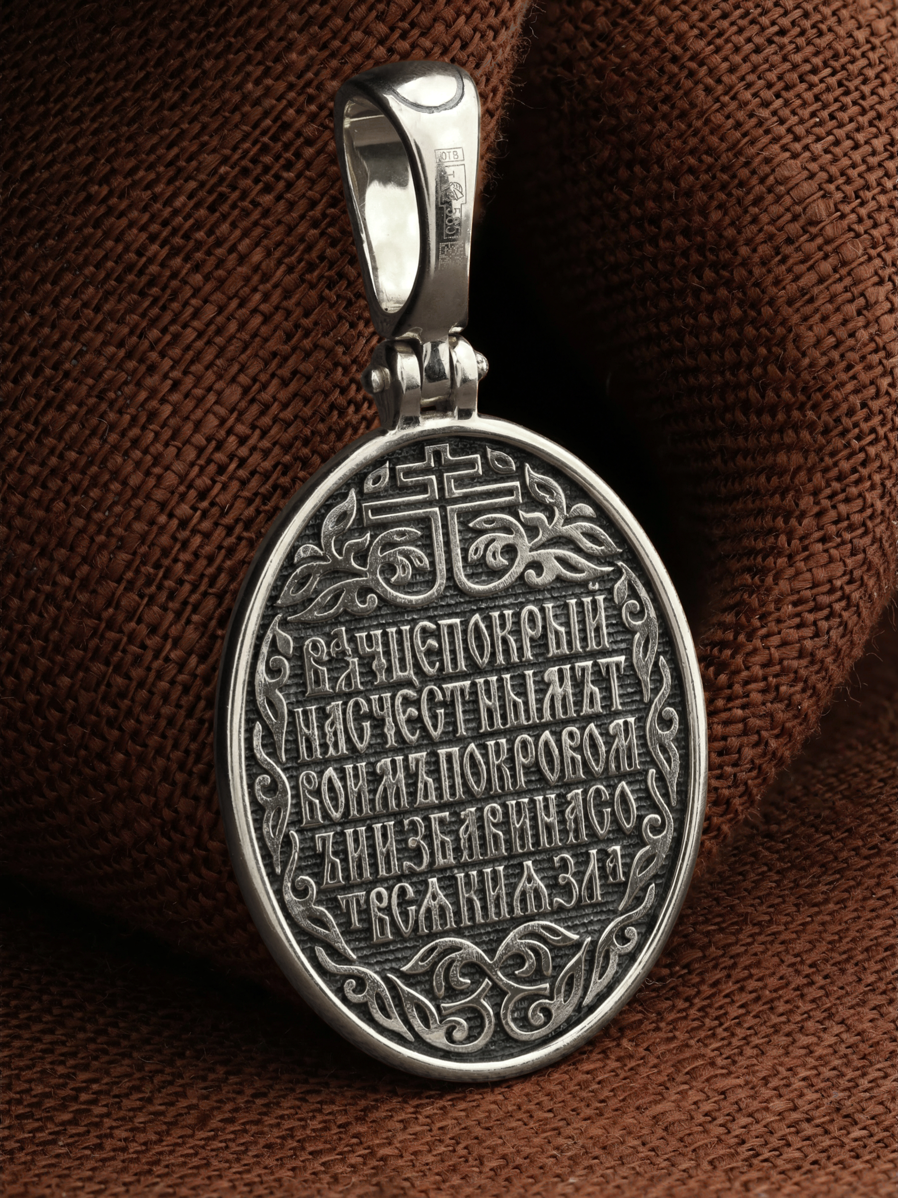 На лицевой части образка изображена икона Покров Пресвятой Богородицы. Праздник Покрова Божией Матери является воспоминанием чуда, которое произошло во Влахнернской церкви 1 (14) октября 910 года: Пресвятая Богородица явилась верующим над алтарем храма и распростерла над ними Свое покрывало. В этот день Божья Матерь открыла людям, что Она является Ходатаицей за них перед Богом. Богородица простирает Свой молитвенный покров над всеми православными христианами и умоляет Сына Своего о даровании вечного спасения каждому человеку.
