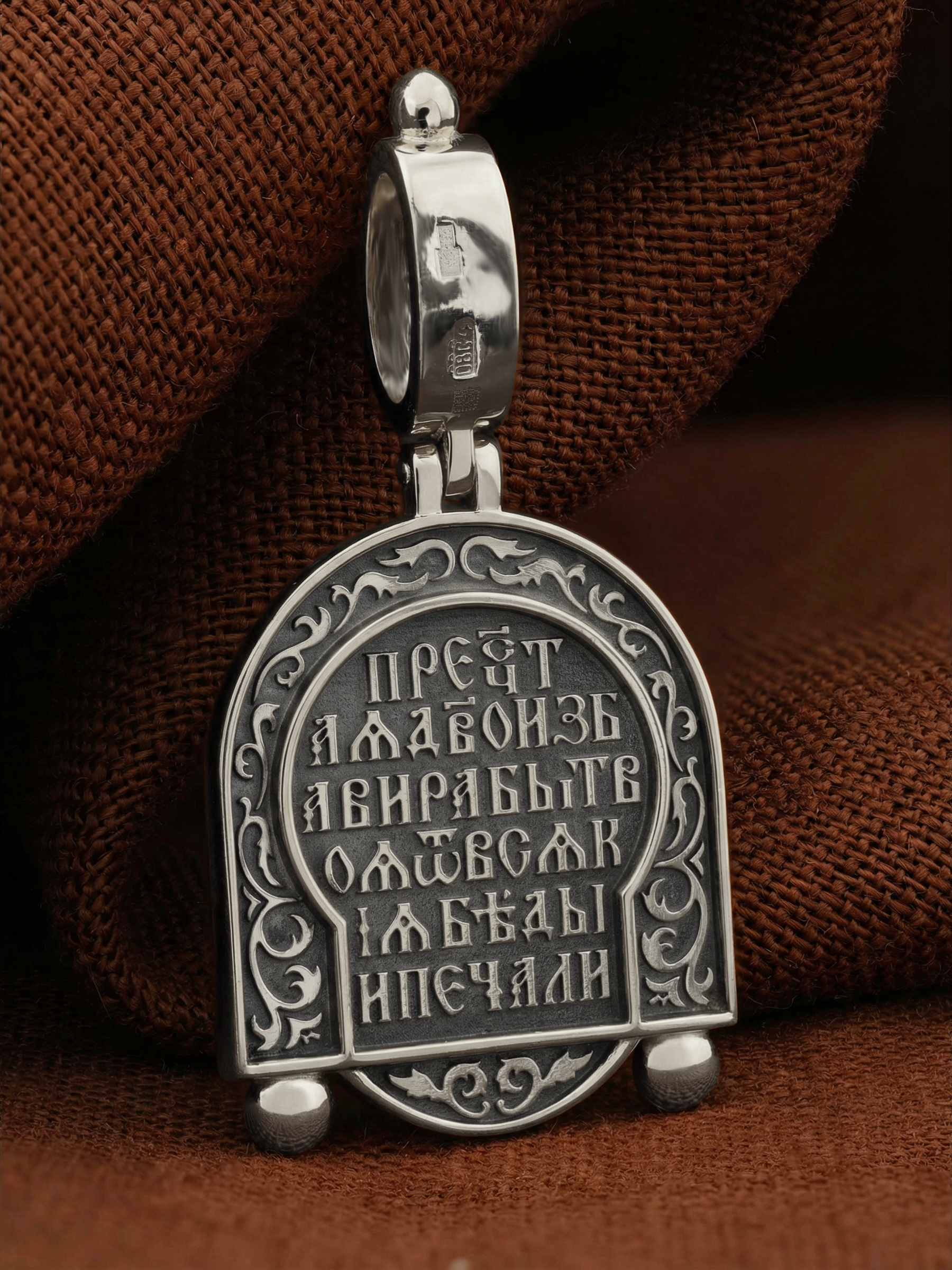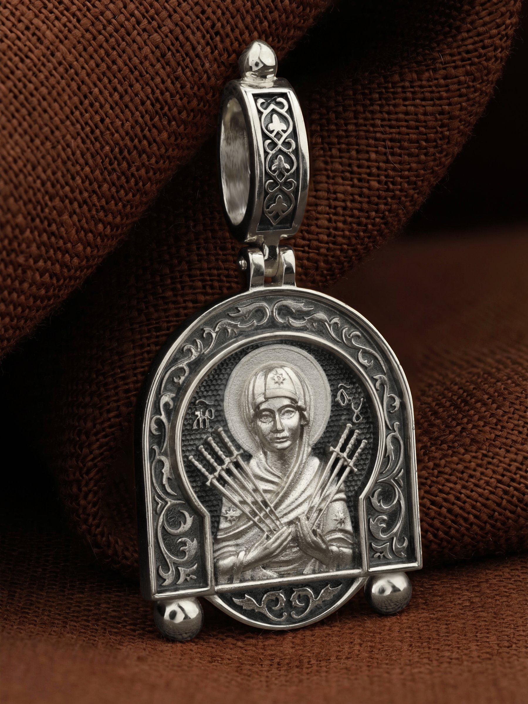 На лицевой стороне образка изображена икона Пресвятой Богородицы «Семистрельная» — одна из самых чудотворных икон на Руси. На протяжении многих веков христиане взывали к Царице Небесной через эту икону, если в стране начинались войны или мятежи.