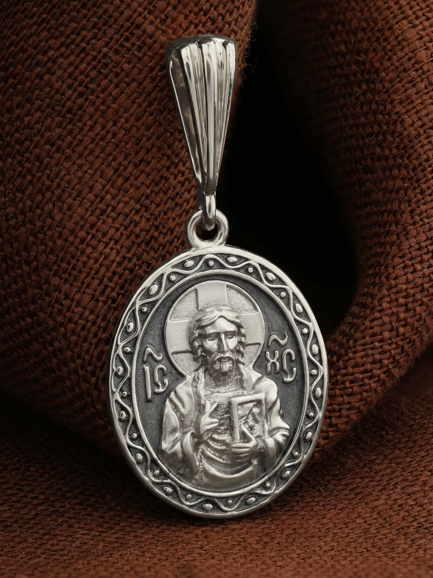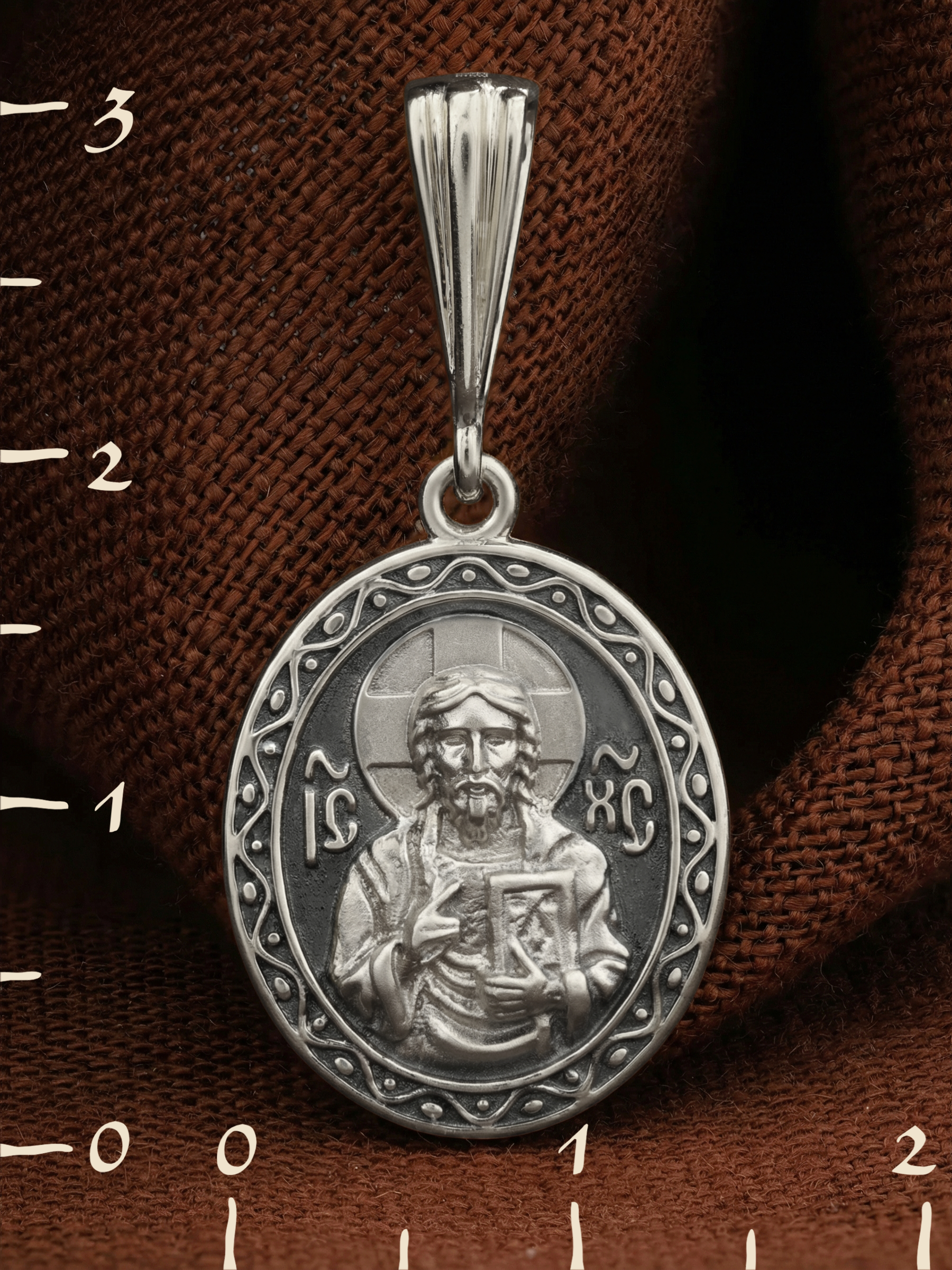 На лицевой части образка изображен Спас Вседержитель или Пантократор (от греч. «панкратос"— всевластный, всесильный) — центральный образ в иконографии Христа, представляющий Его как Небесного Царя и Судию. Господь правой рукой благословляет, а в левой держит Книгу Жизни, в которой для каждого человека есть своя страница.