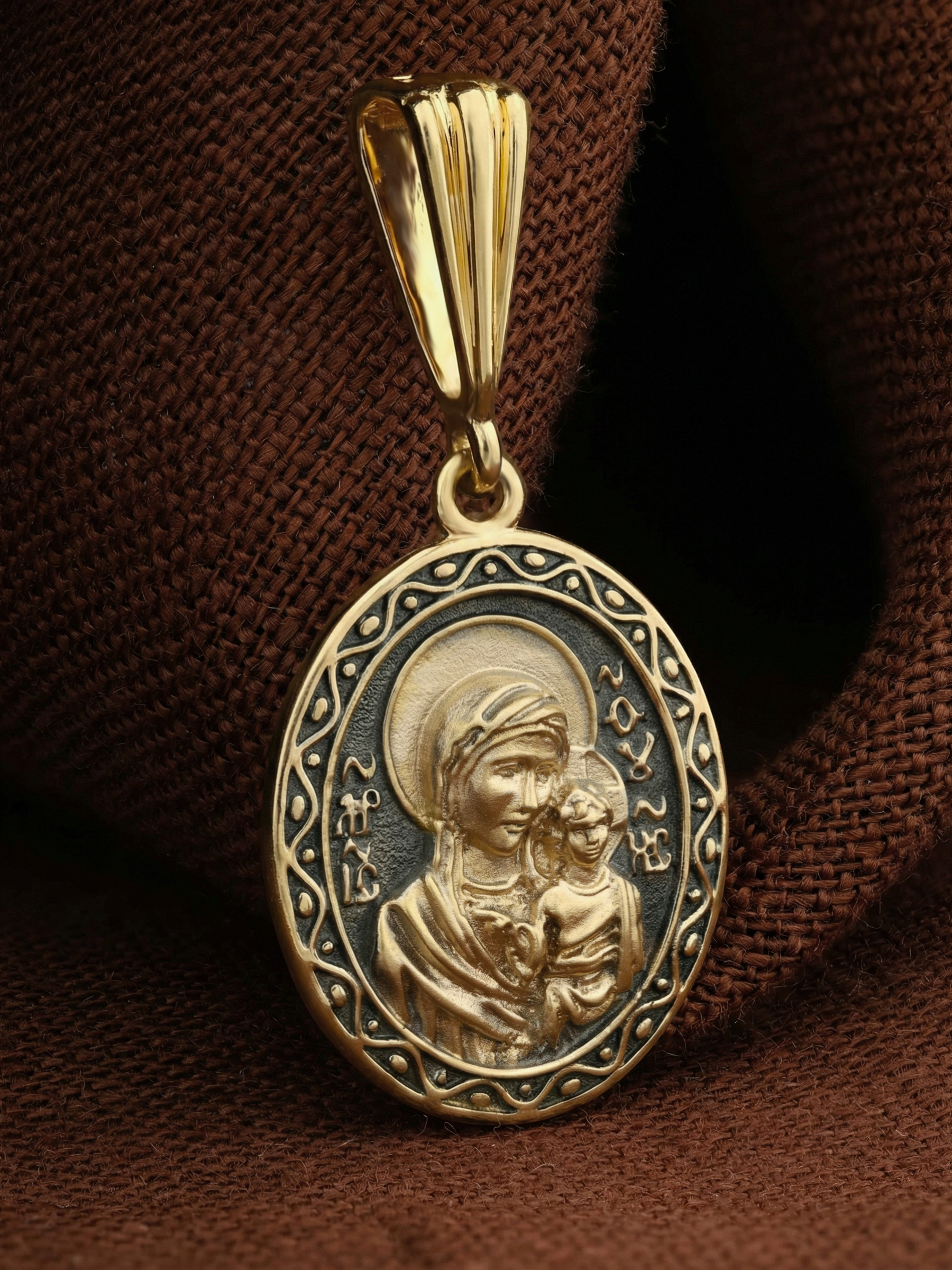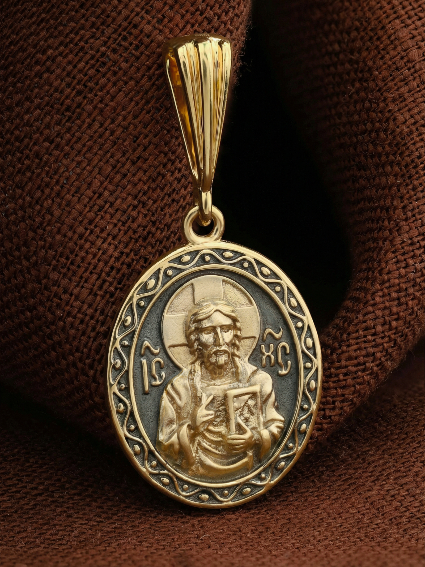 На лицевой части образка изображен Спас Вседержитель или Пантократор (от греч. «панкратос"— всевластный, всесильный) — центральный образ в иконографии Христа, представляющий Его как Небесного Царя и Судию. Господь правой рукой благословляет, а в левой держит Книгу Жизни, в которой для каждого человека есть своя страница.