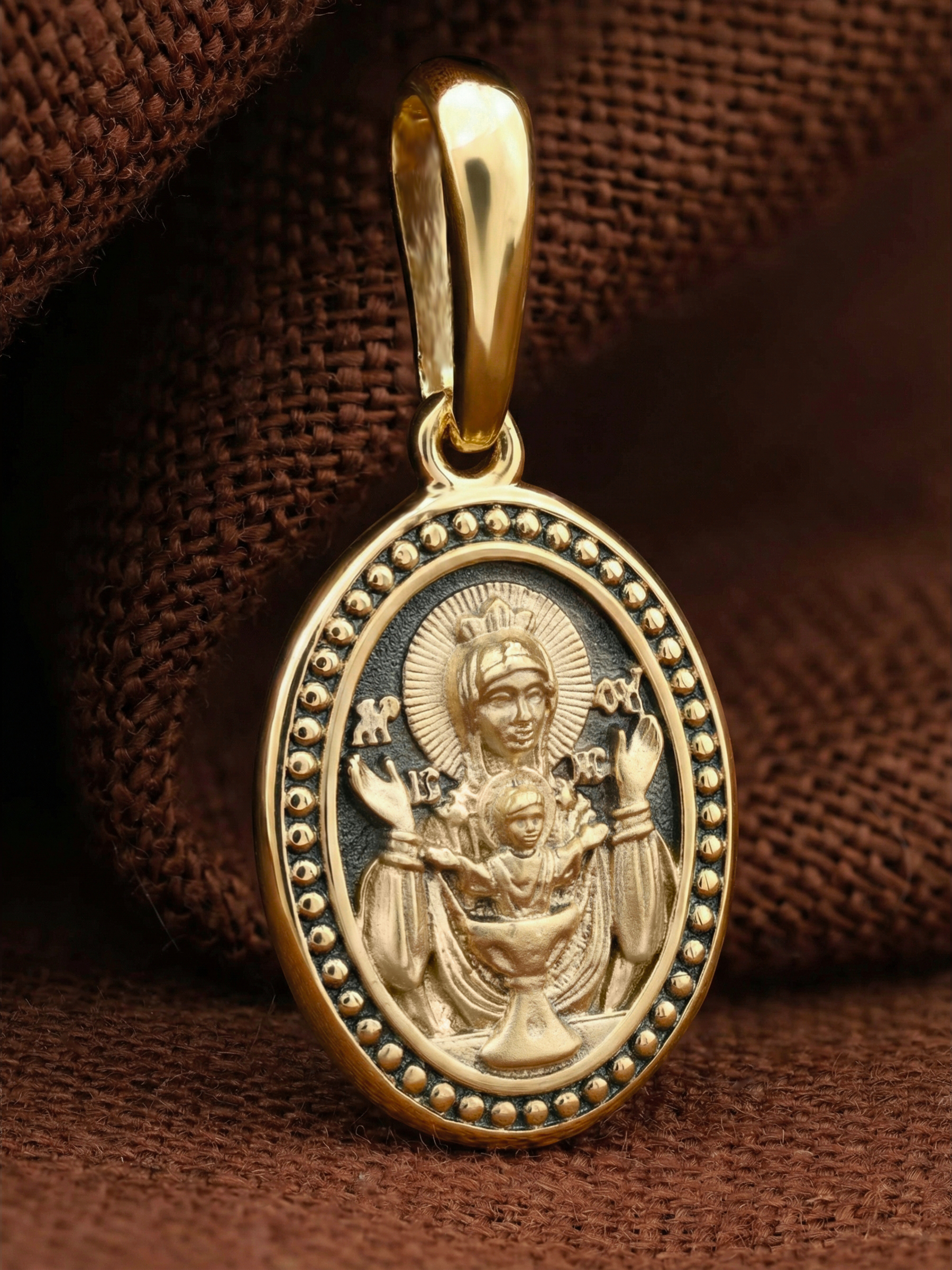 На лицевой части образка изображена икона Божией Матери «Неупиваемая чаша». Икона славится помощью в исцелении зависимостей, помогает людям обрести свободу от греховных страстей.