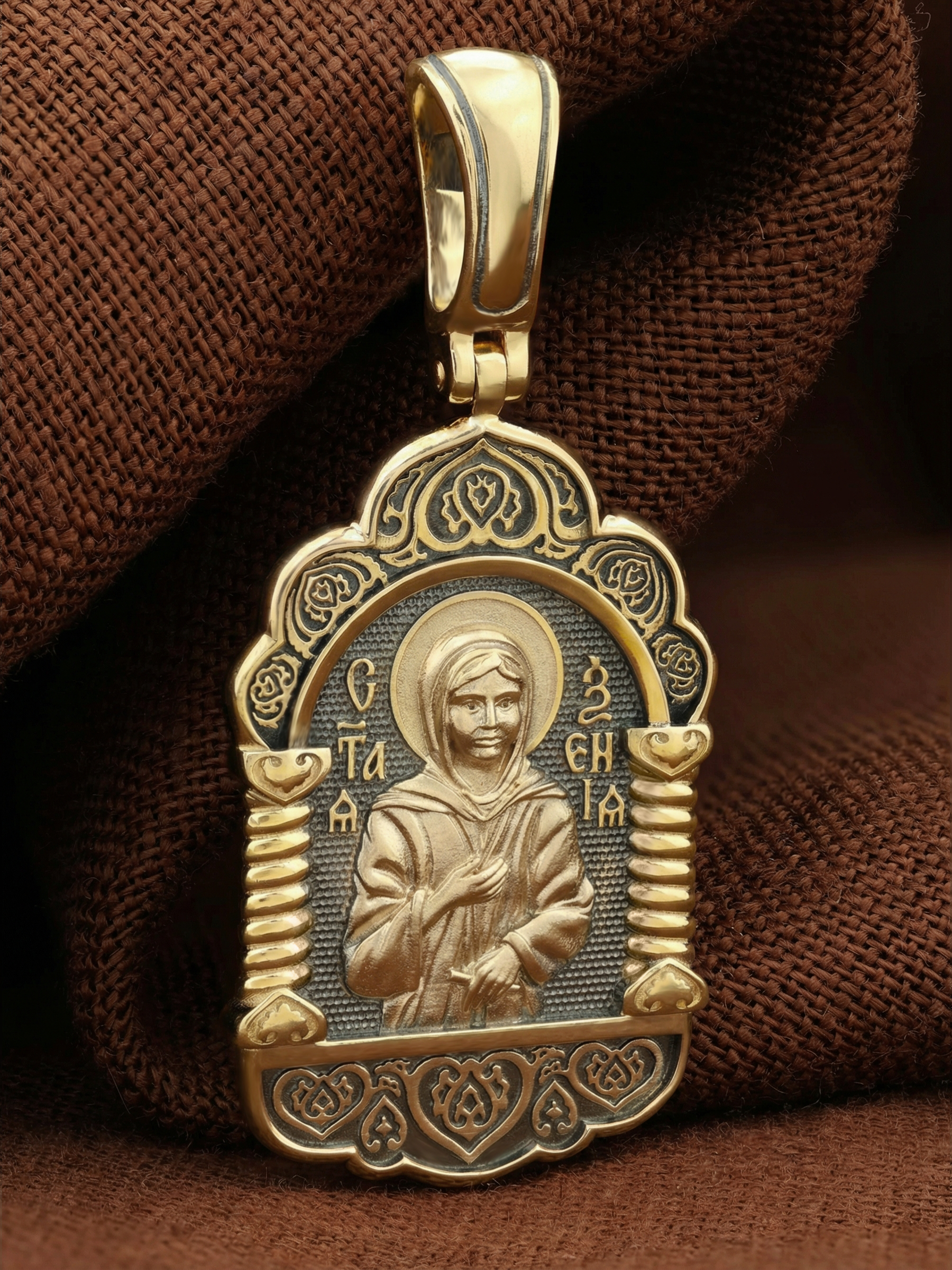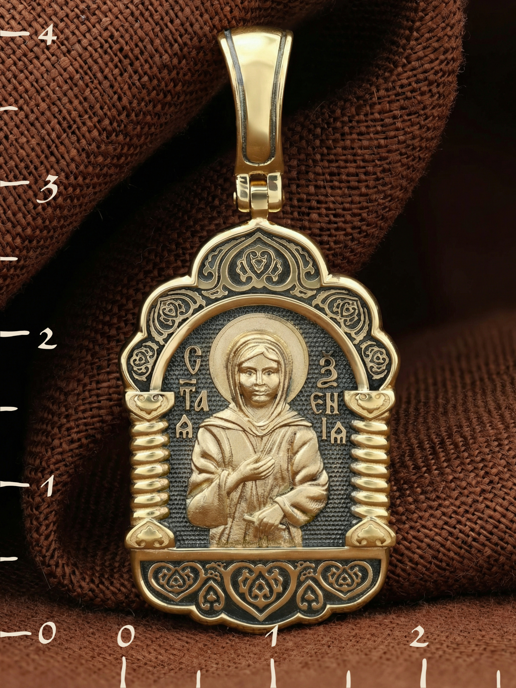 На лицевой стороне образка изображена Святая блаженная Ксения Петербургская, в миру Ксения Григорьевна Петрова.