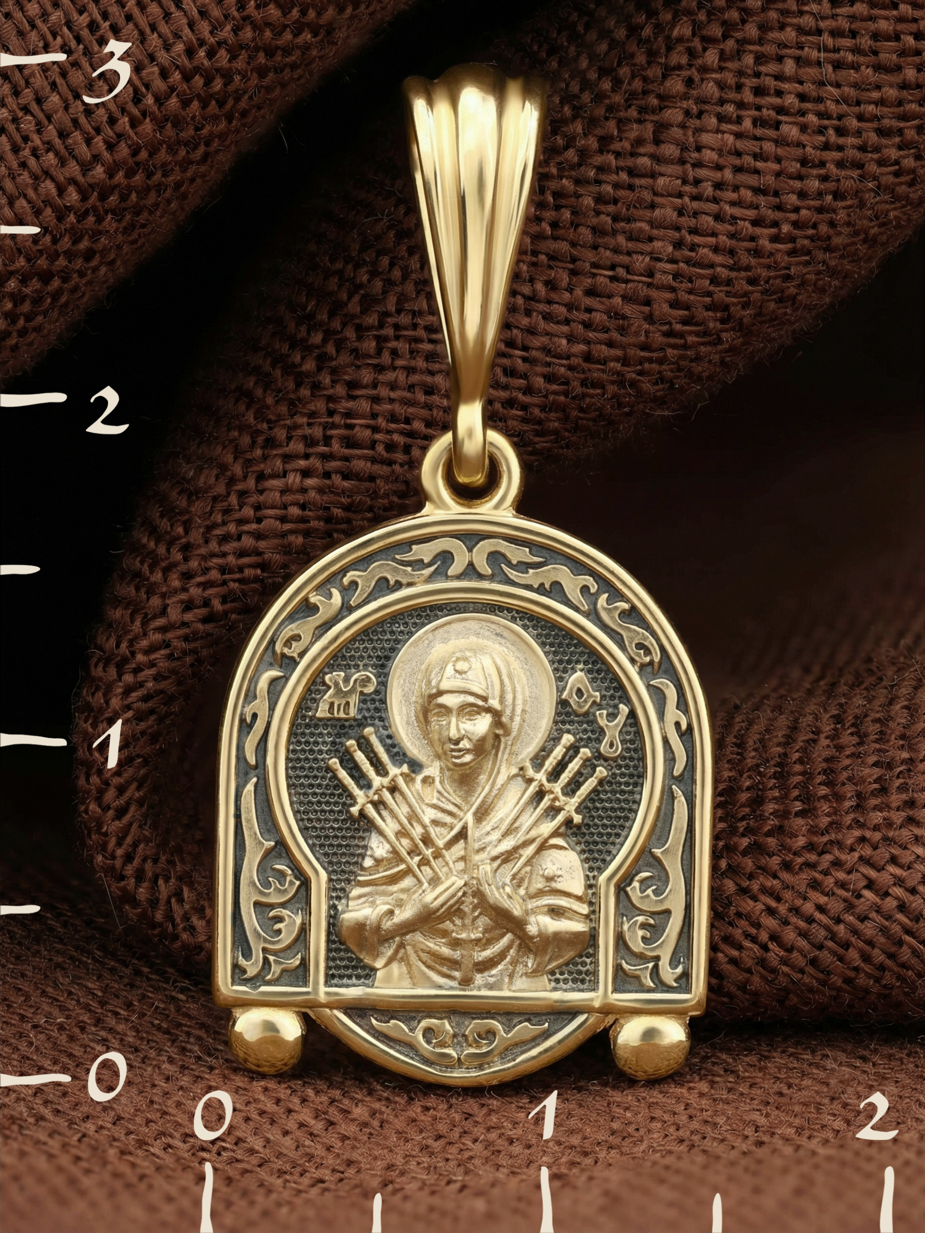 На лицевой стороне образка изображена икона Пресвятой Богородицы «Семистрельная» — одна из самых чудотворных икон на Руси. На протяжении многих веков христиане взывали к Царице Небесной через эту икону, если в стране начинались войны или мятежи.